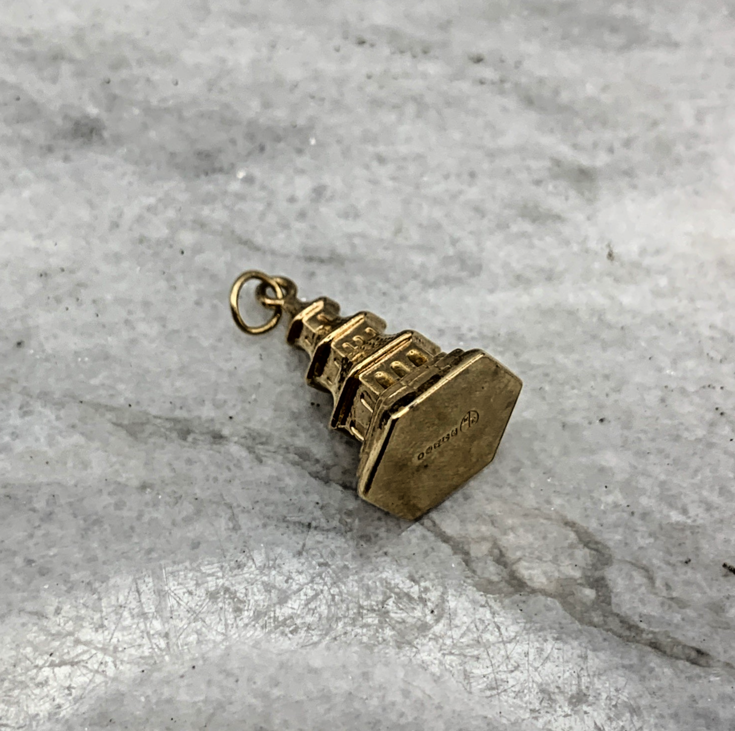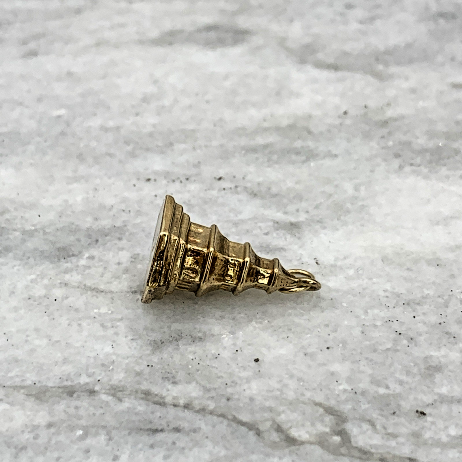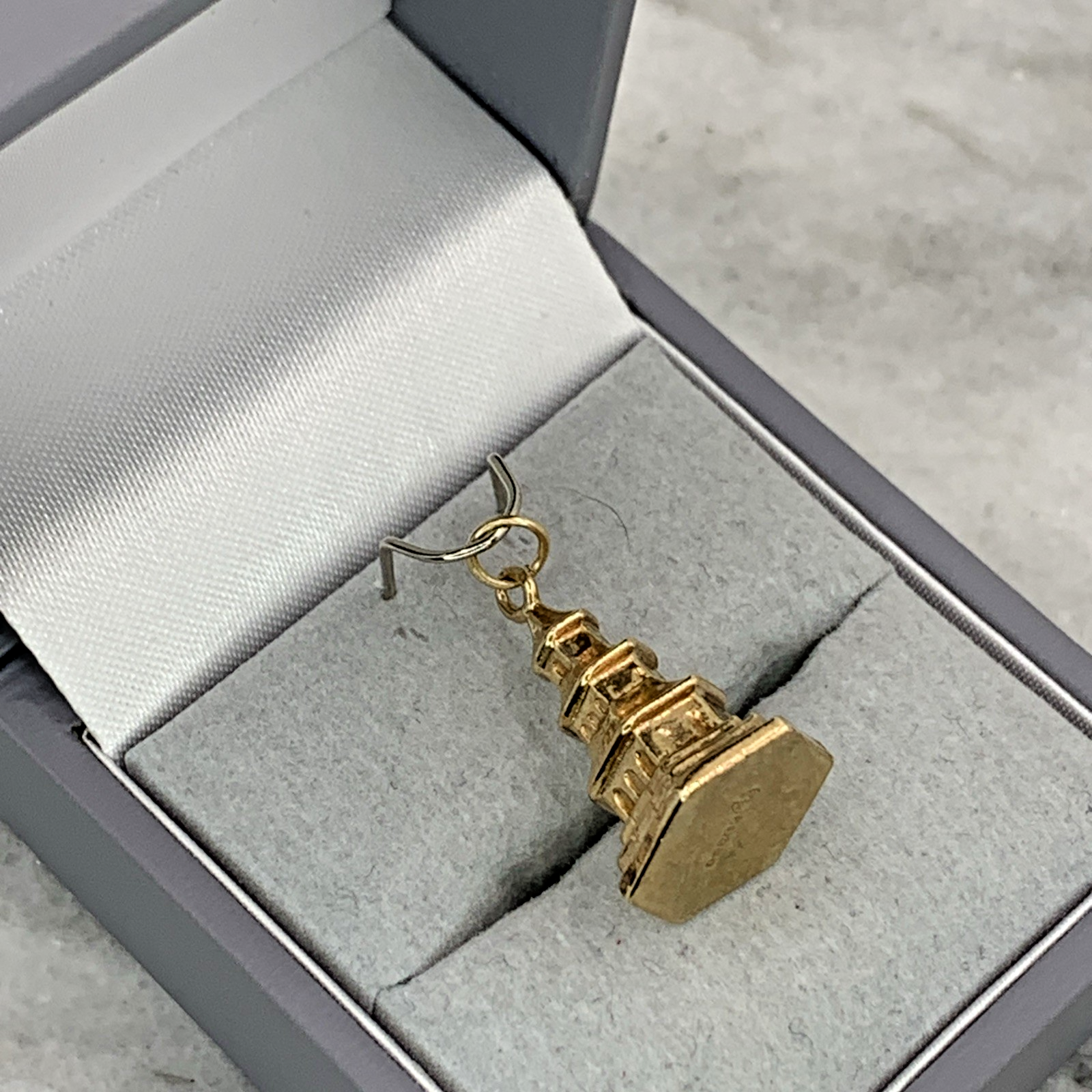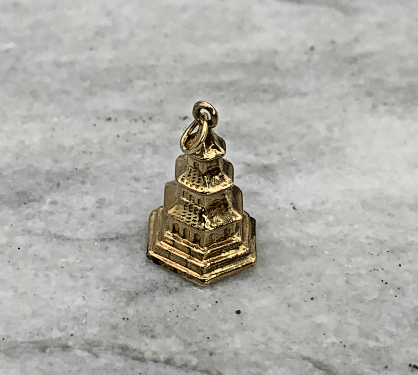 A lovely gold pendant crafted in the shape of a Chinese pagoda tower building. Perfect for charm bracelets.