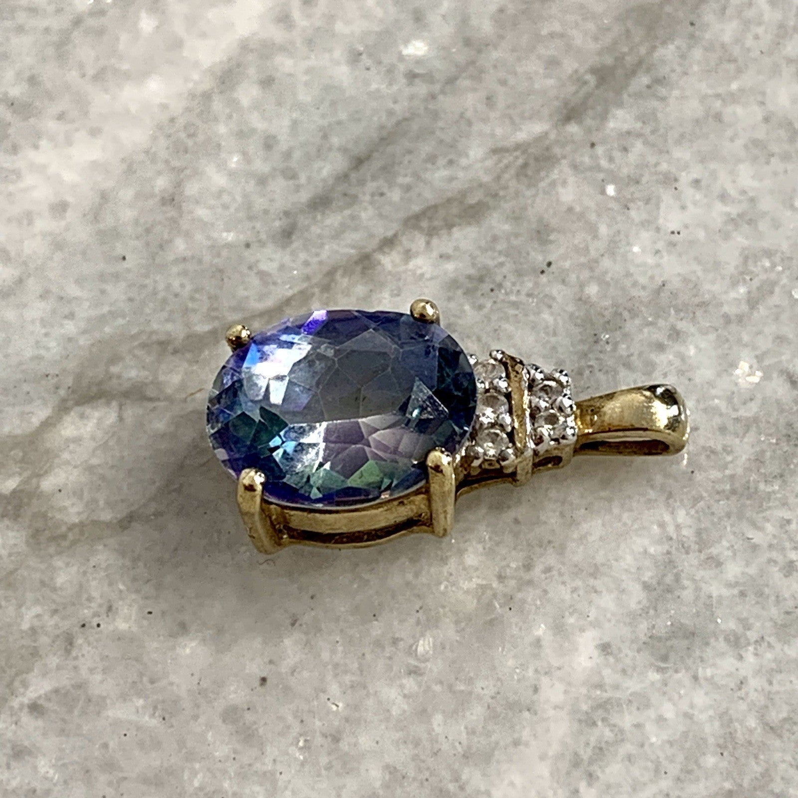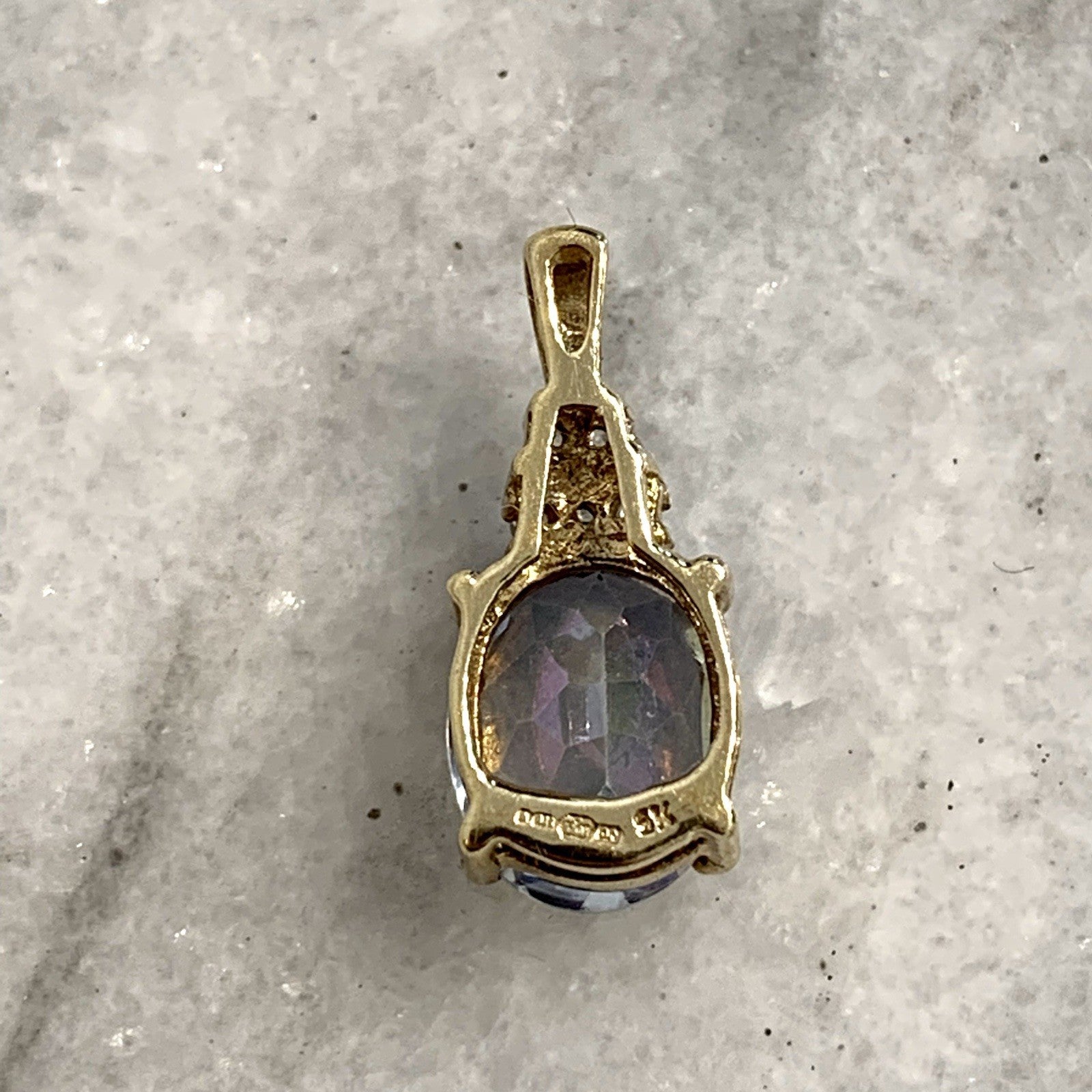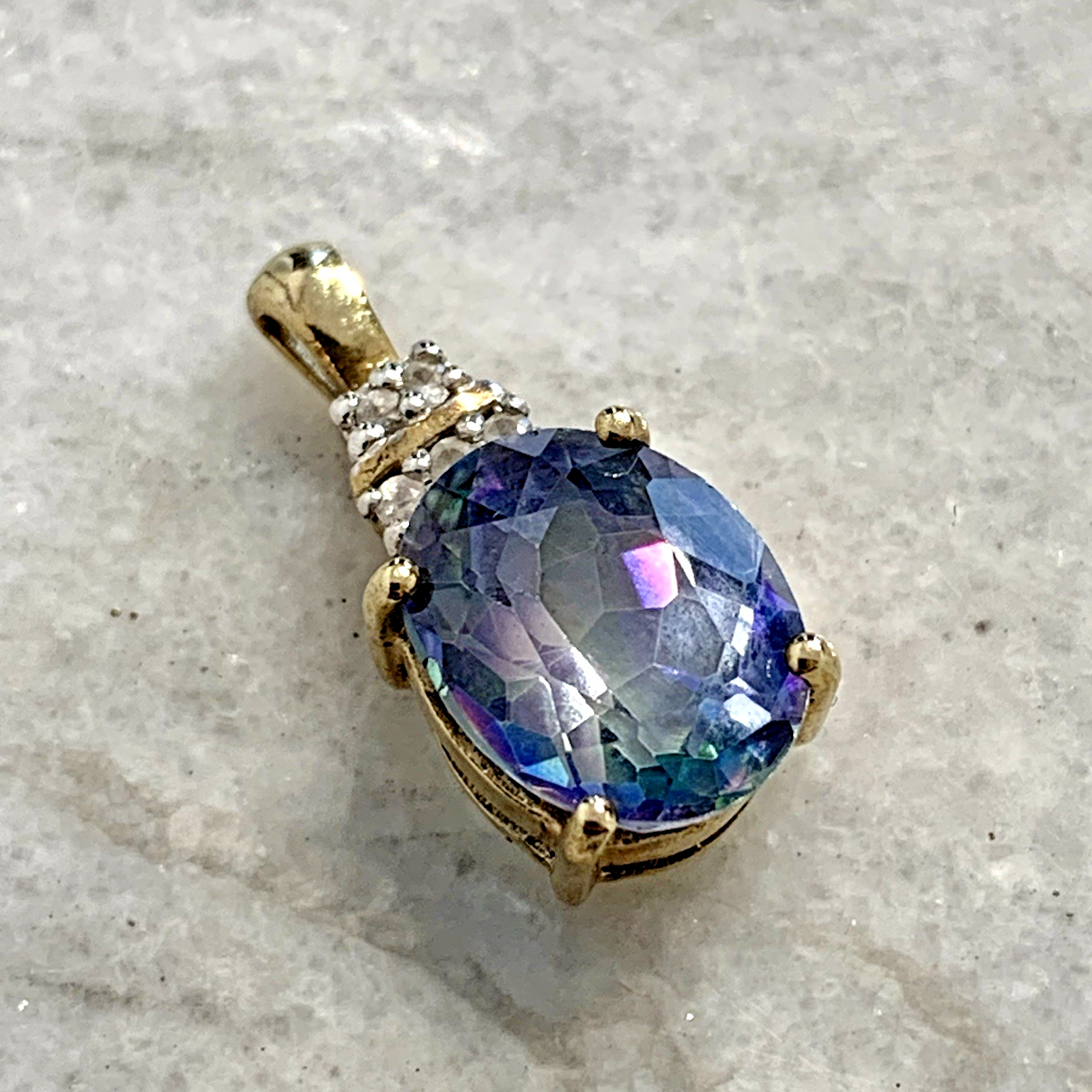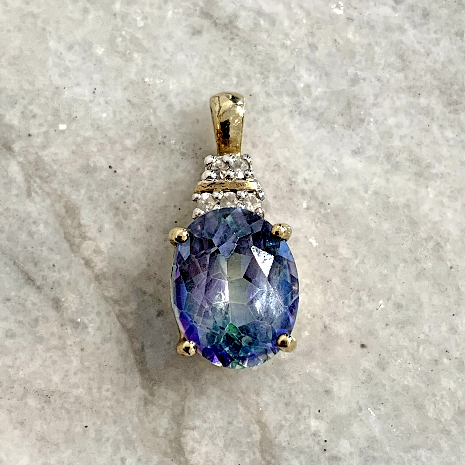 - A stunning gold pendant showcasing an oval cut mystic topaz pendant accented by petite diamonds.