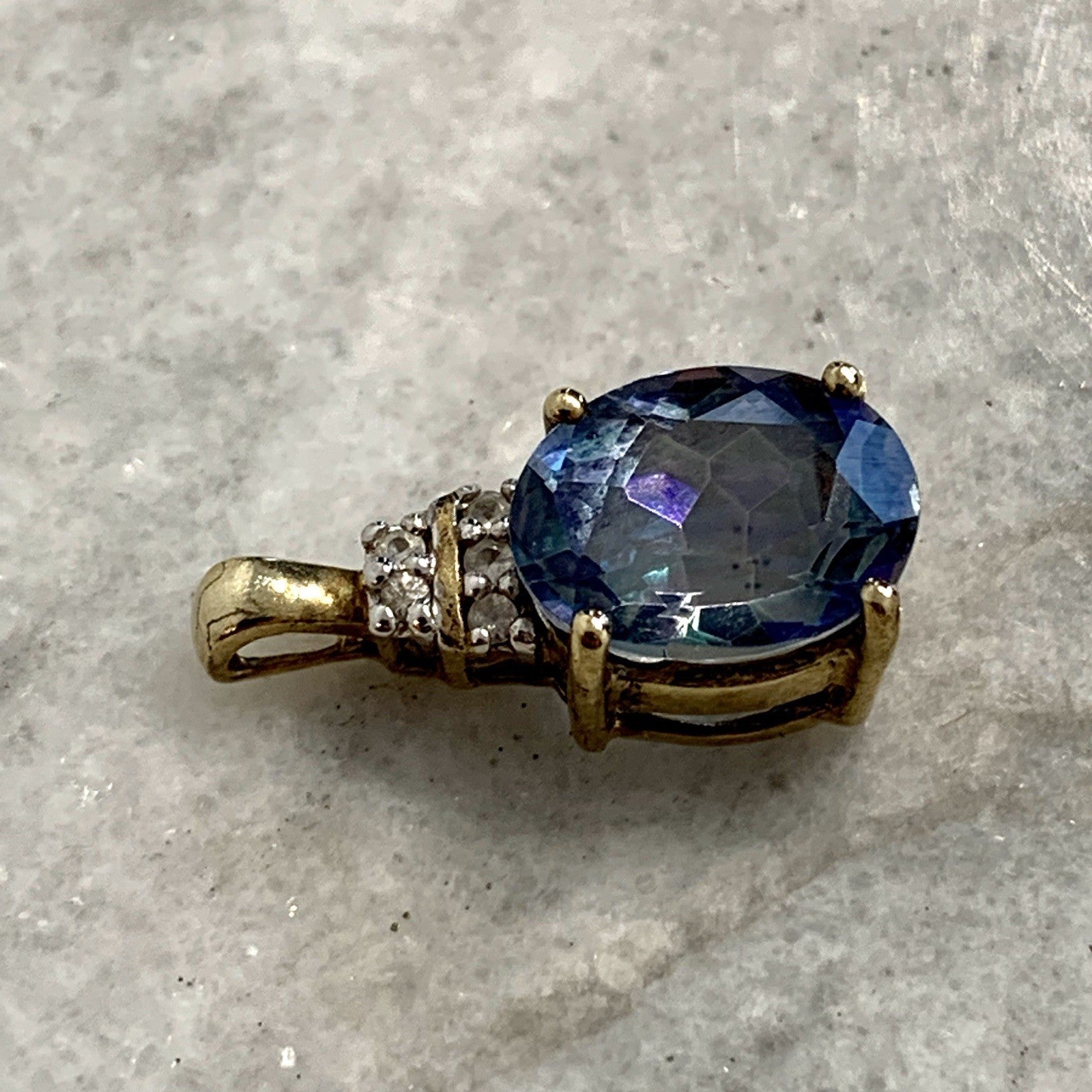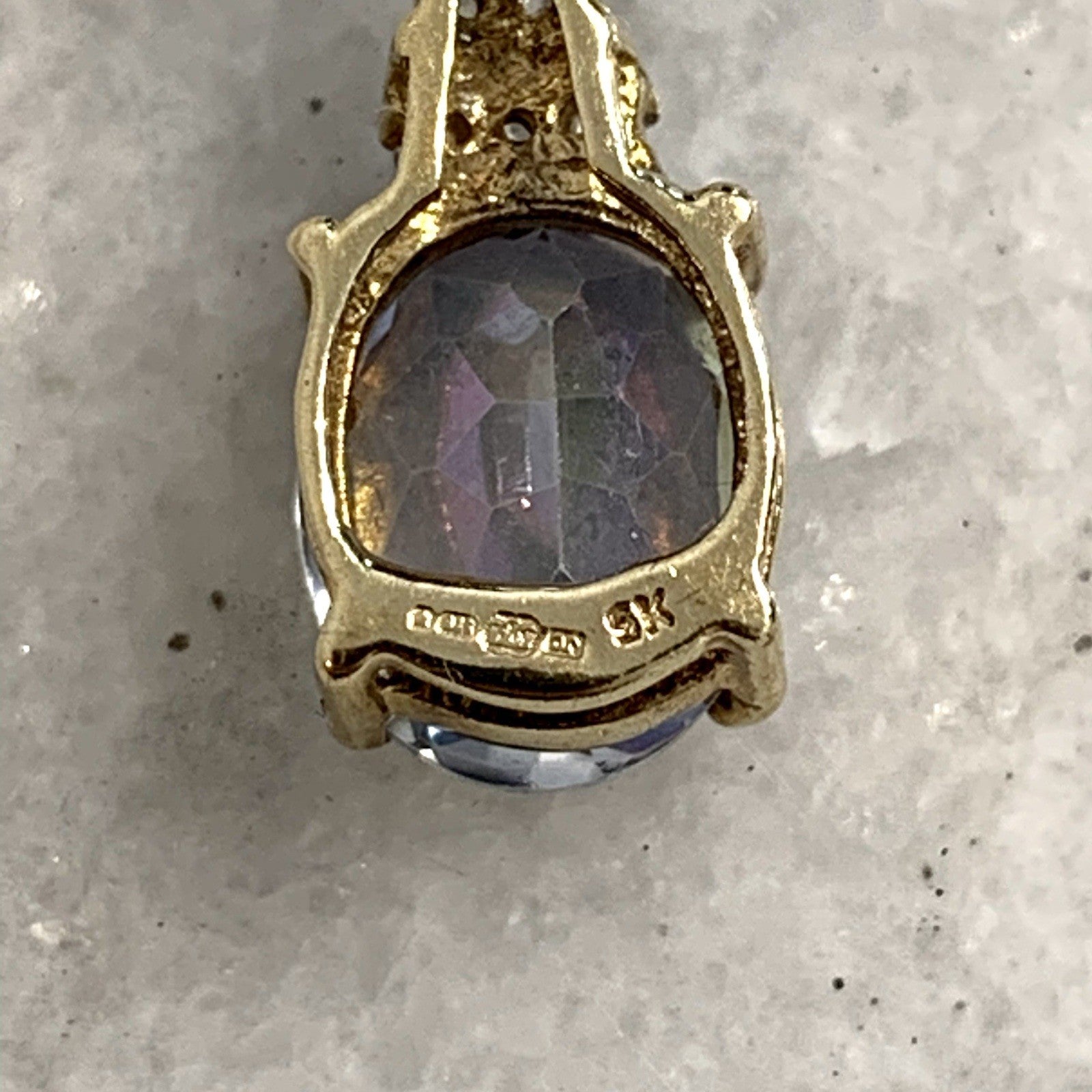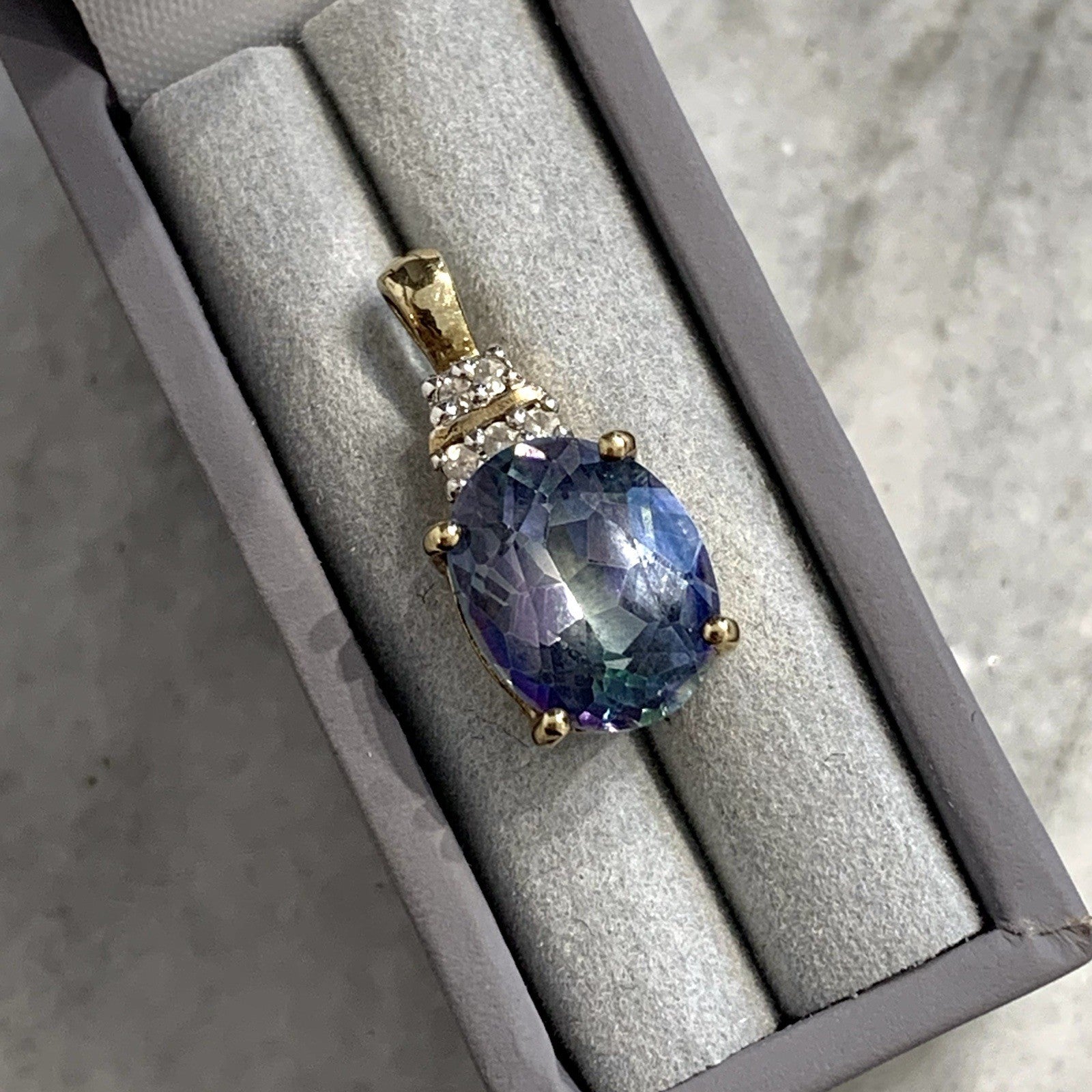 - A stunning gold pendant showcasing an oval cut mystic topaz pendant accented by petite diamonds.