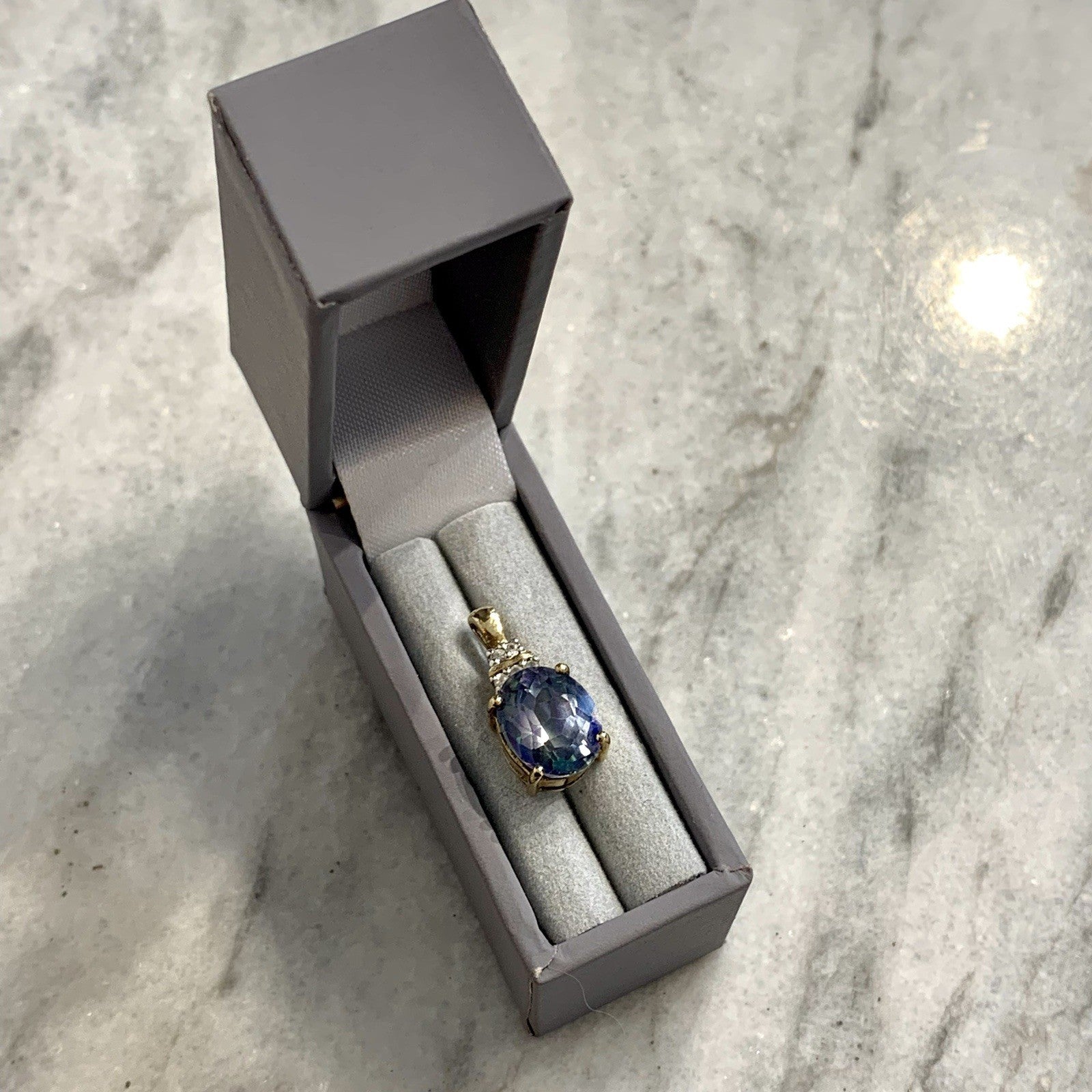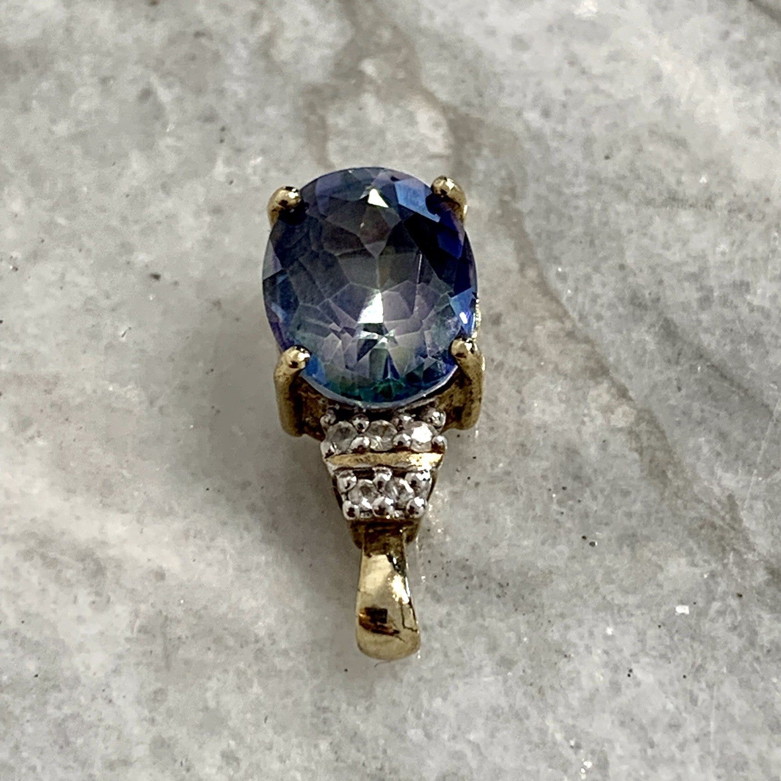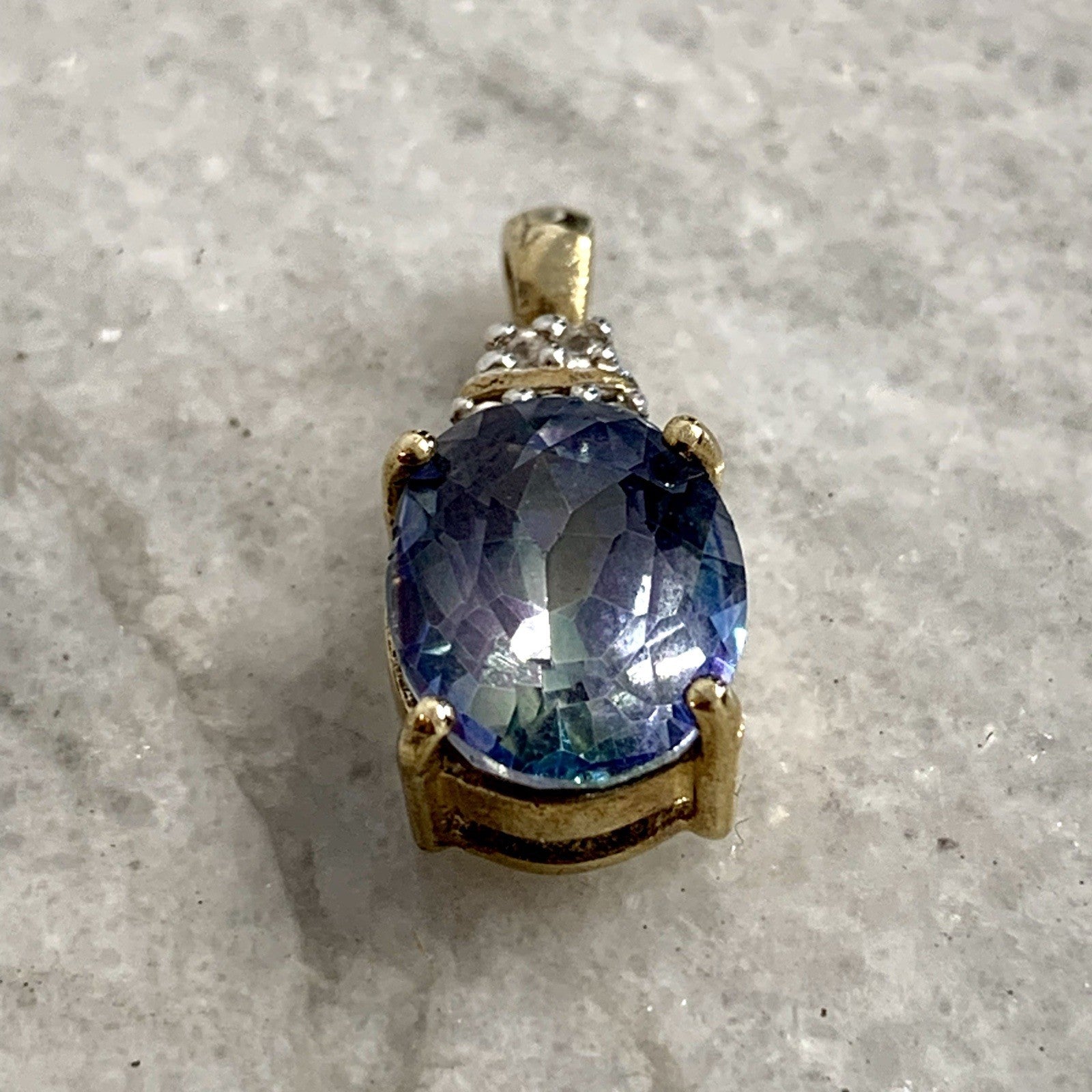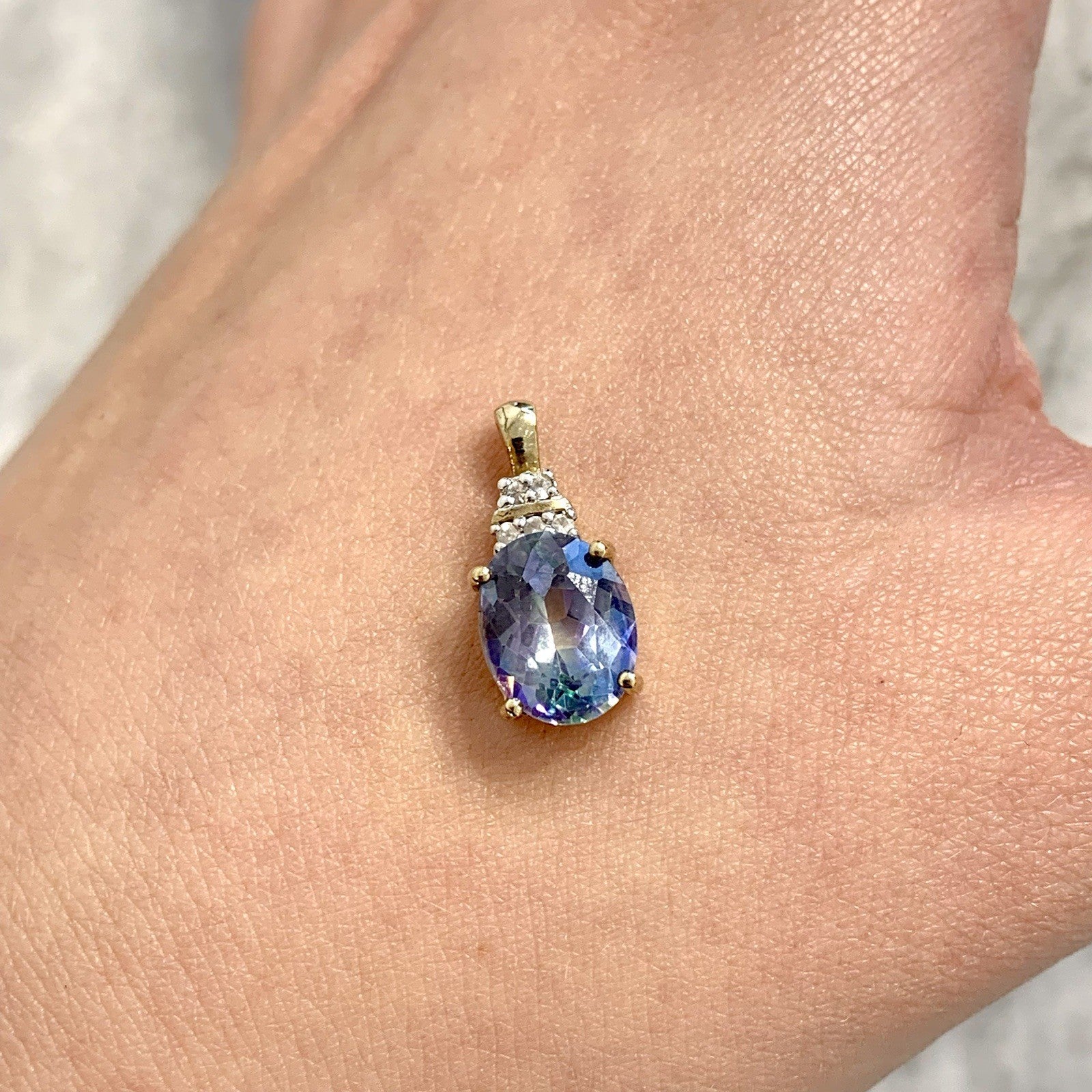 - A stunning gold pendant showcasing an oval cut mystic topaz pendant accented by petite diamonds.