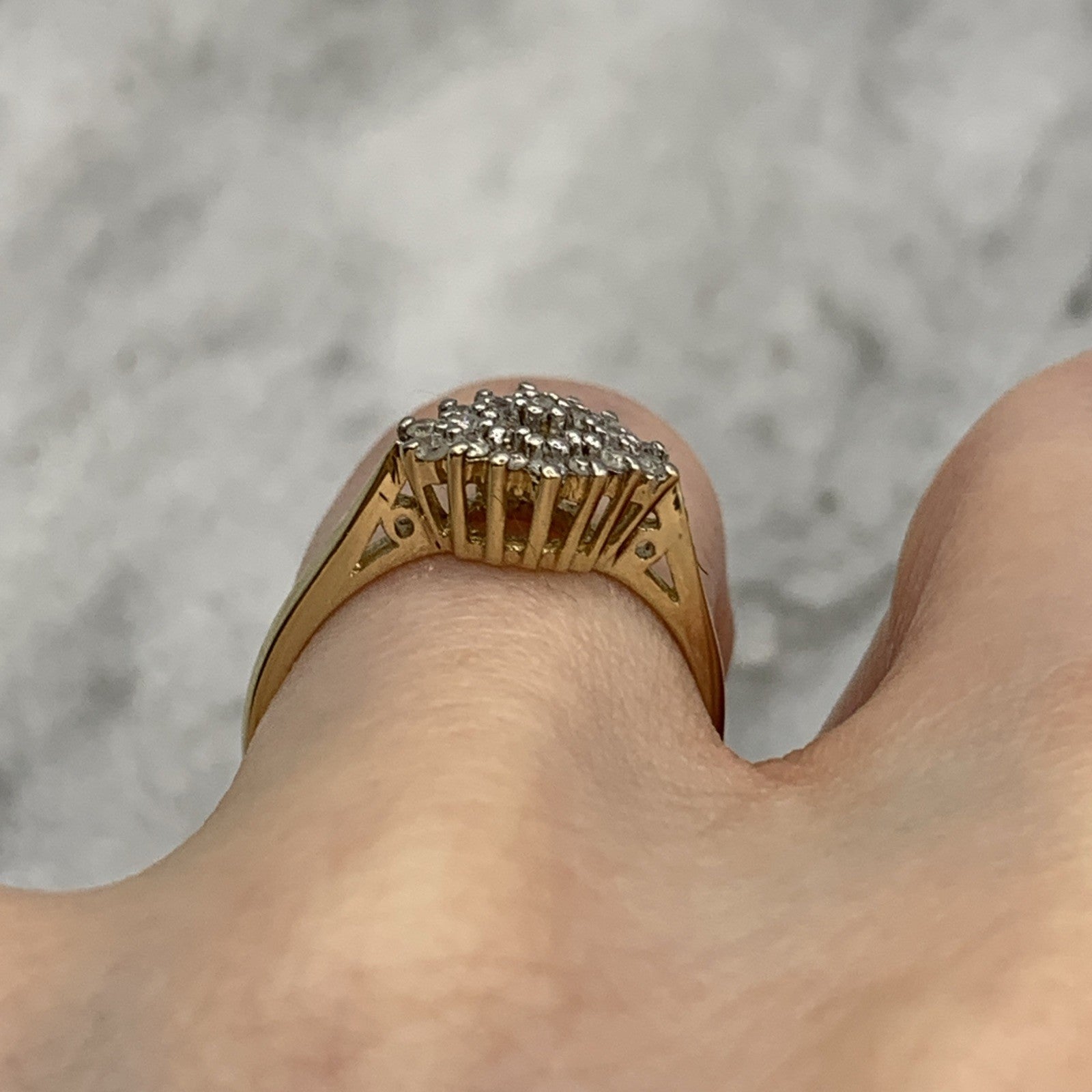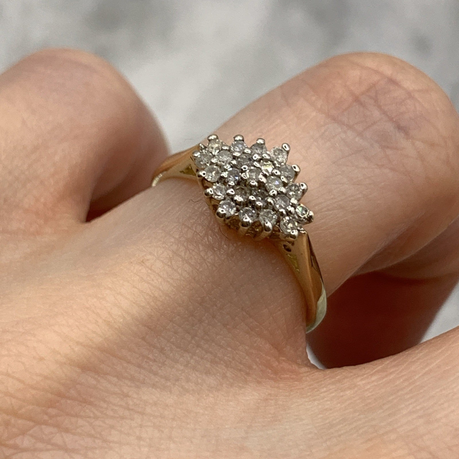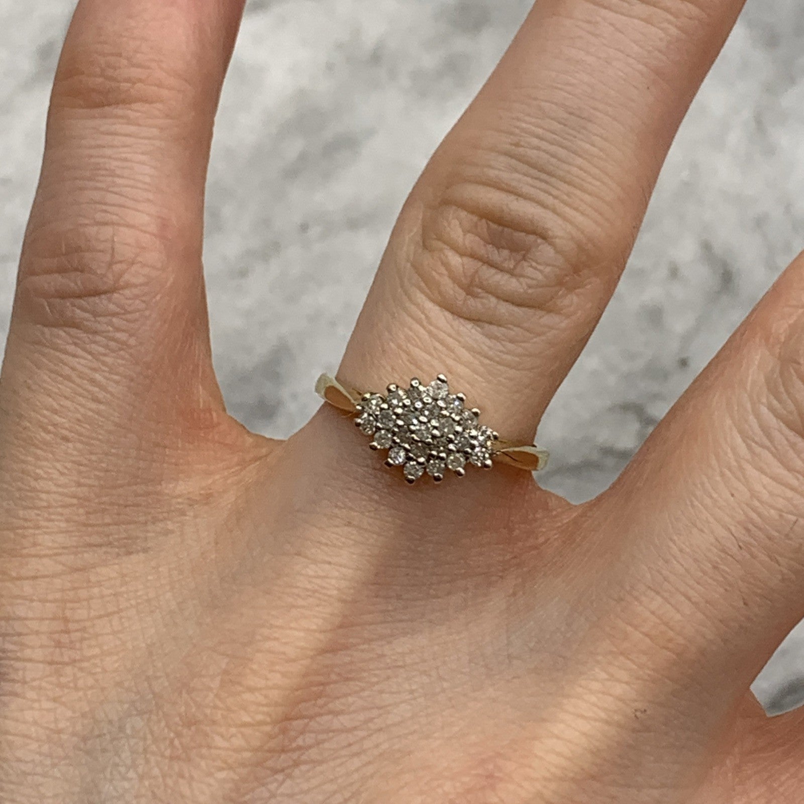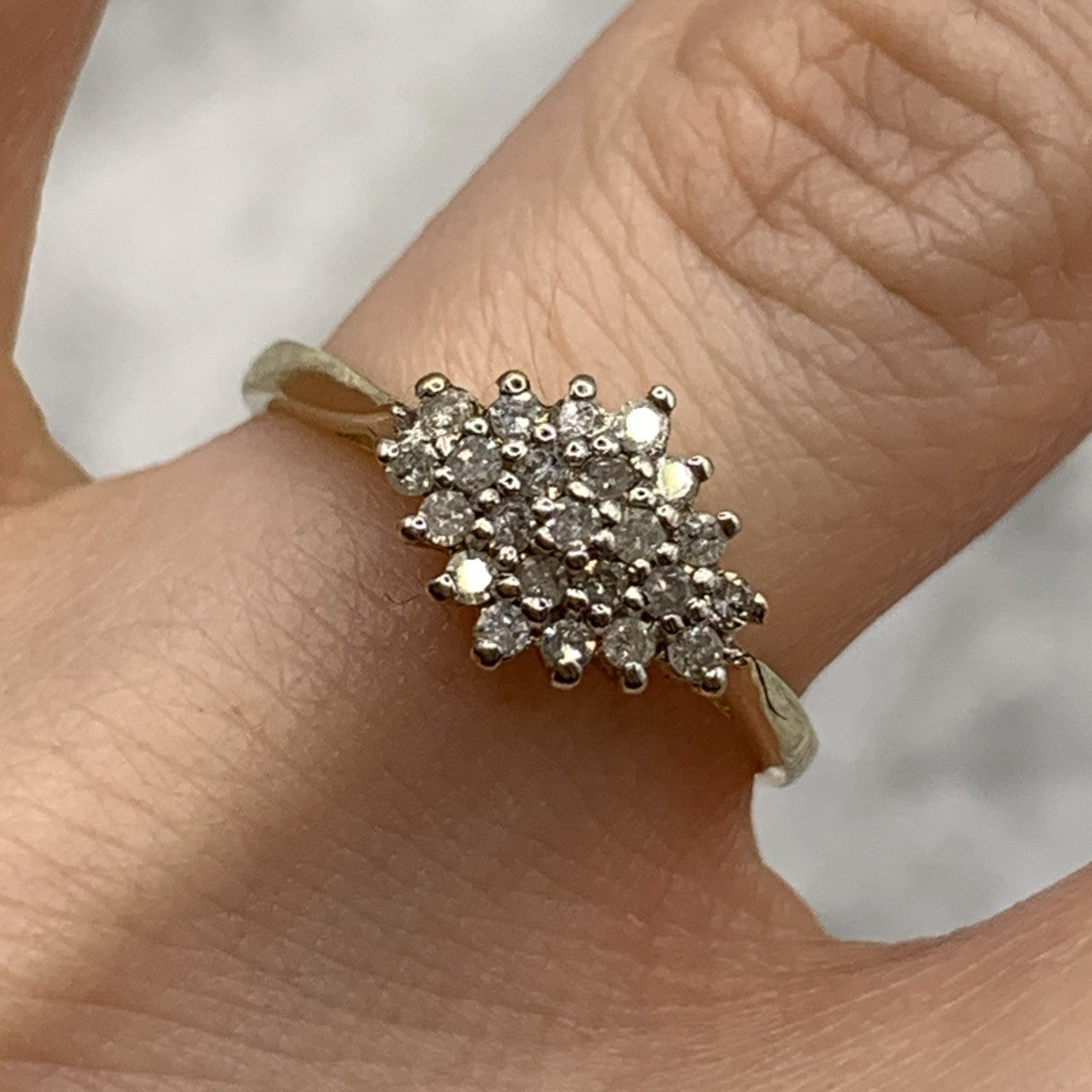 - A stunning gold ring featuring .25ct diamond cluster. Hallmarked.
