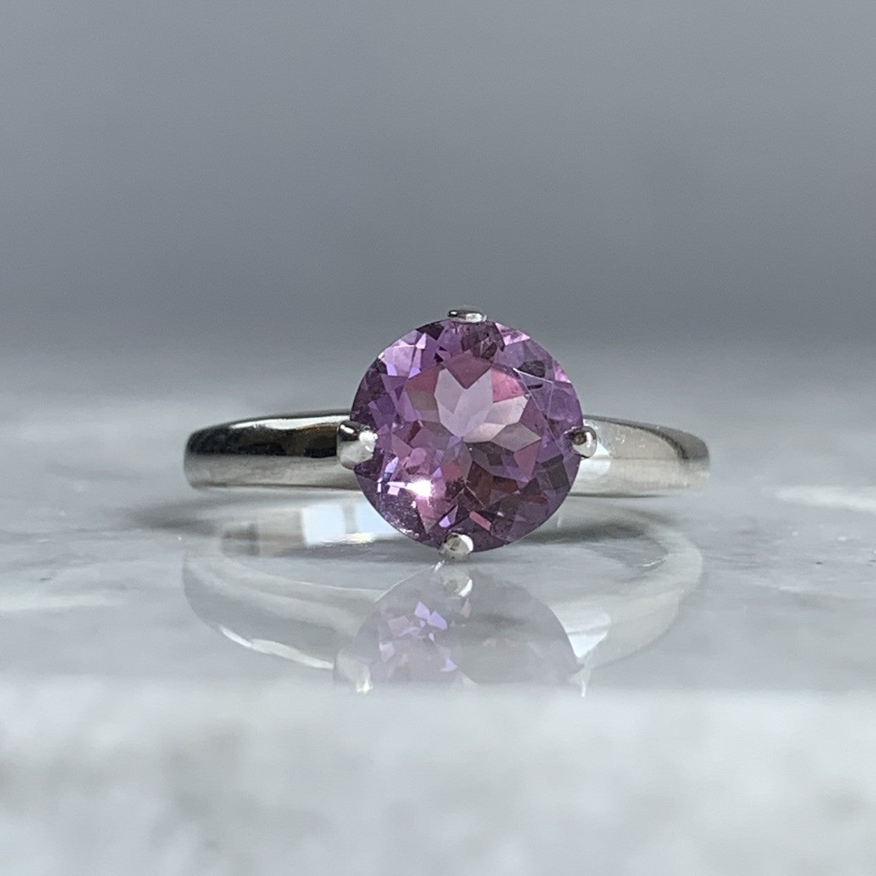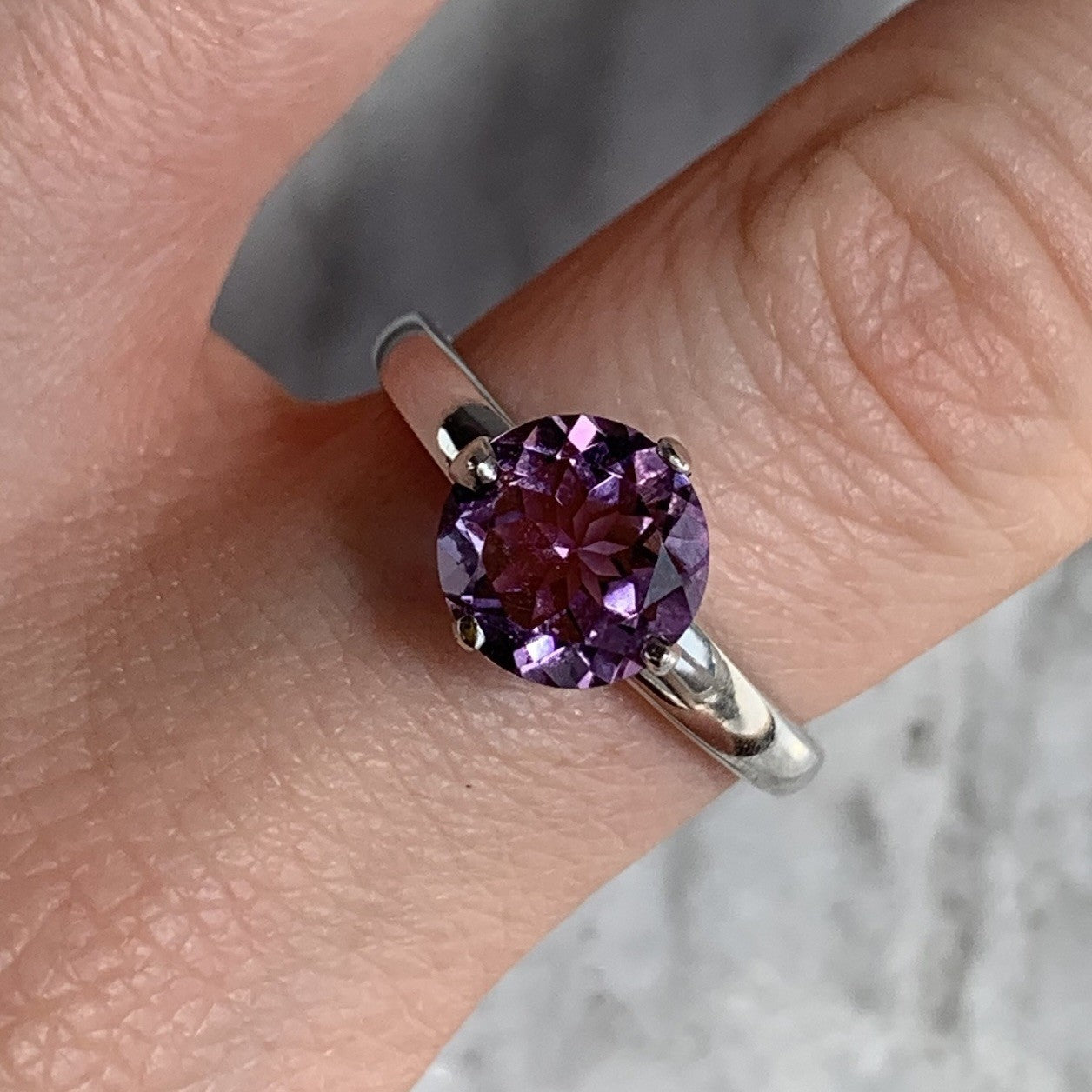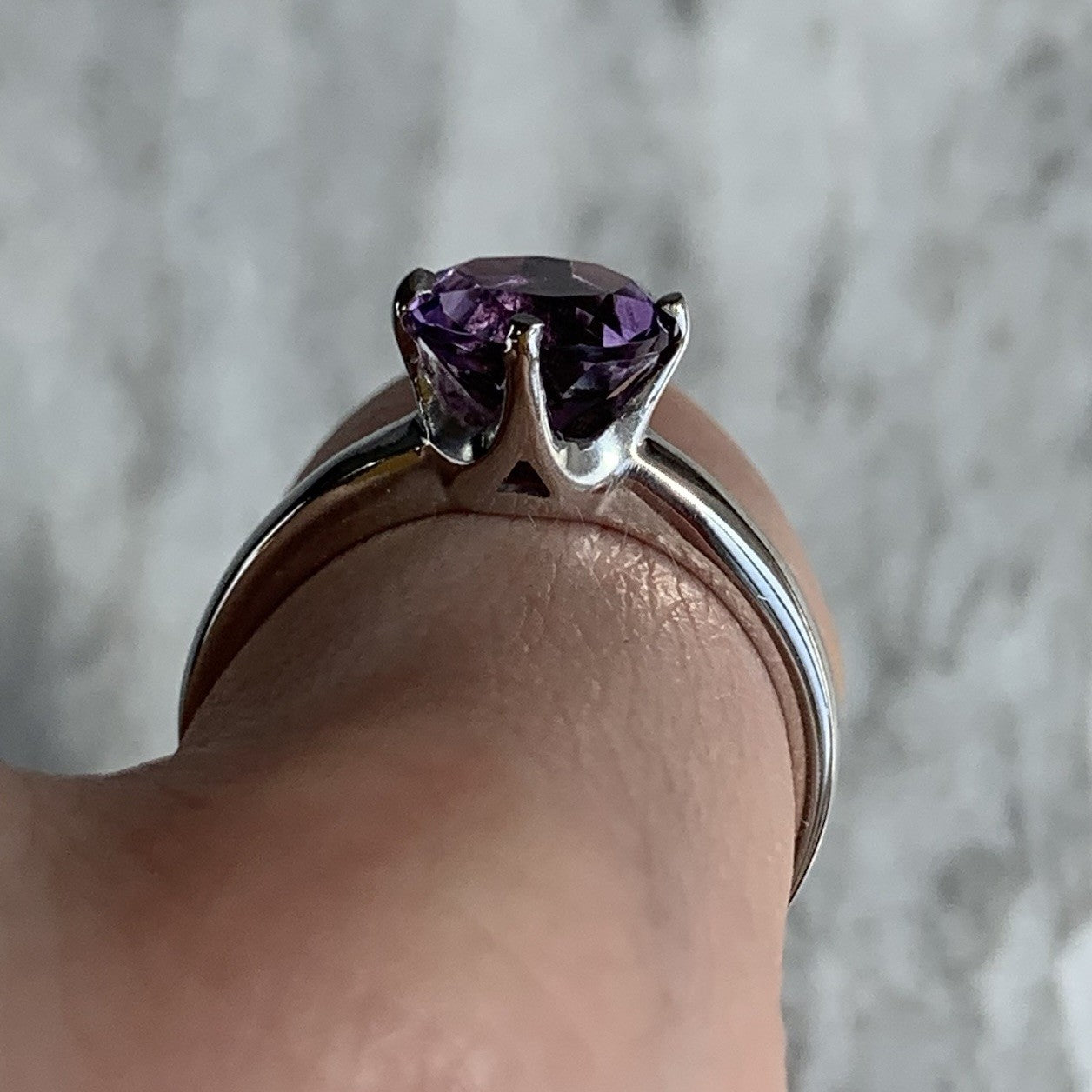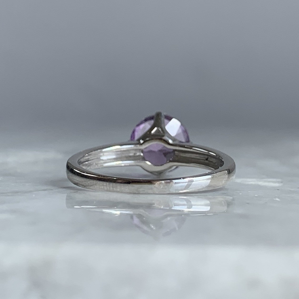 A lovely white gold ring showcasing an ornate round cut solitaire amethyst.