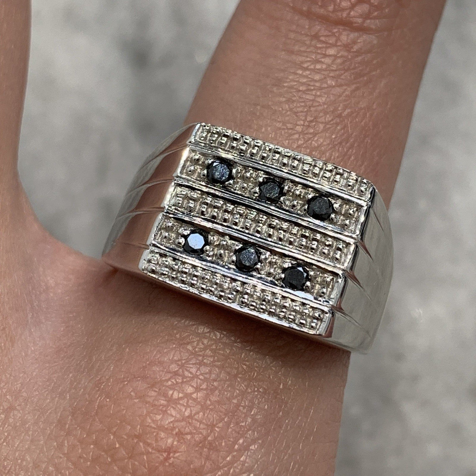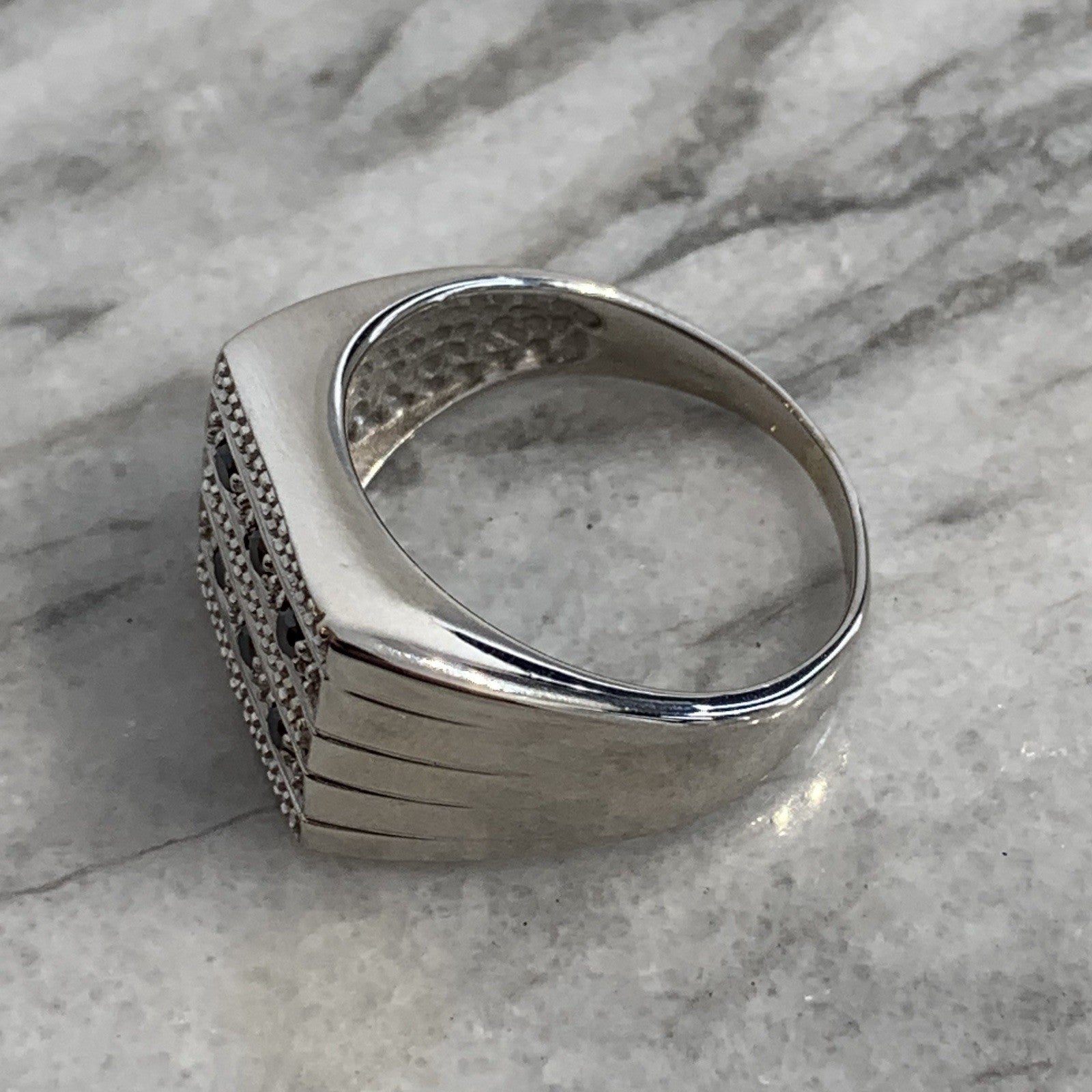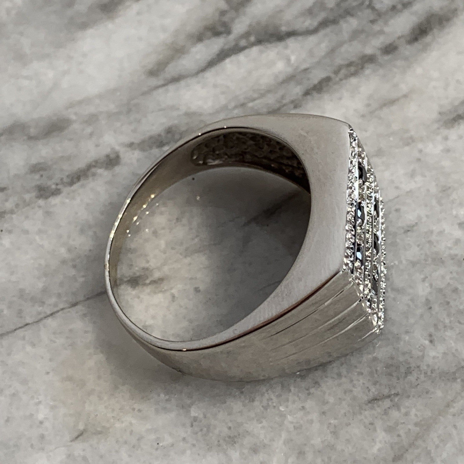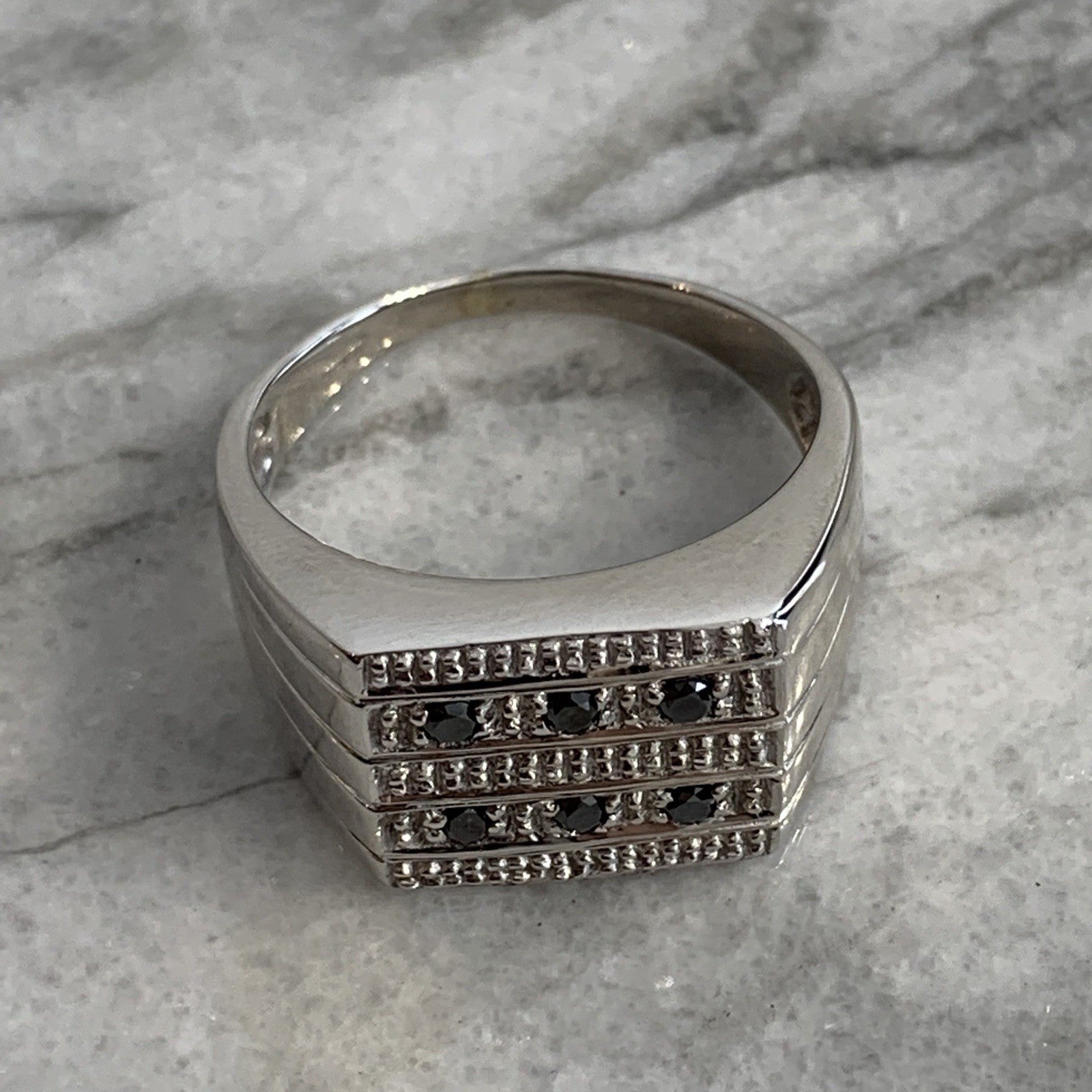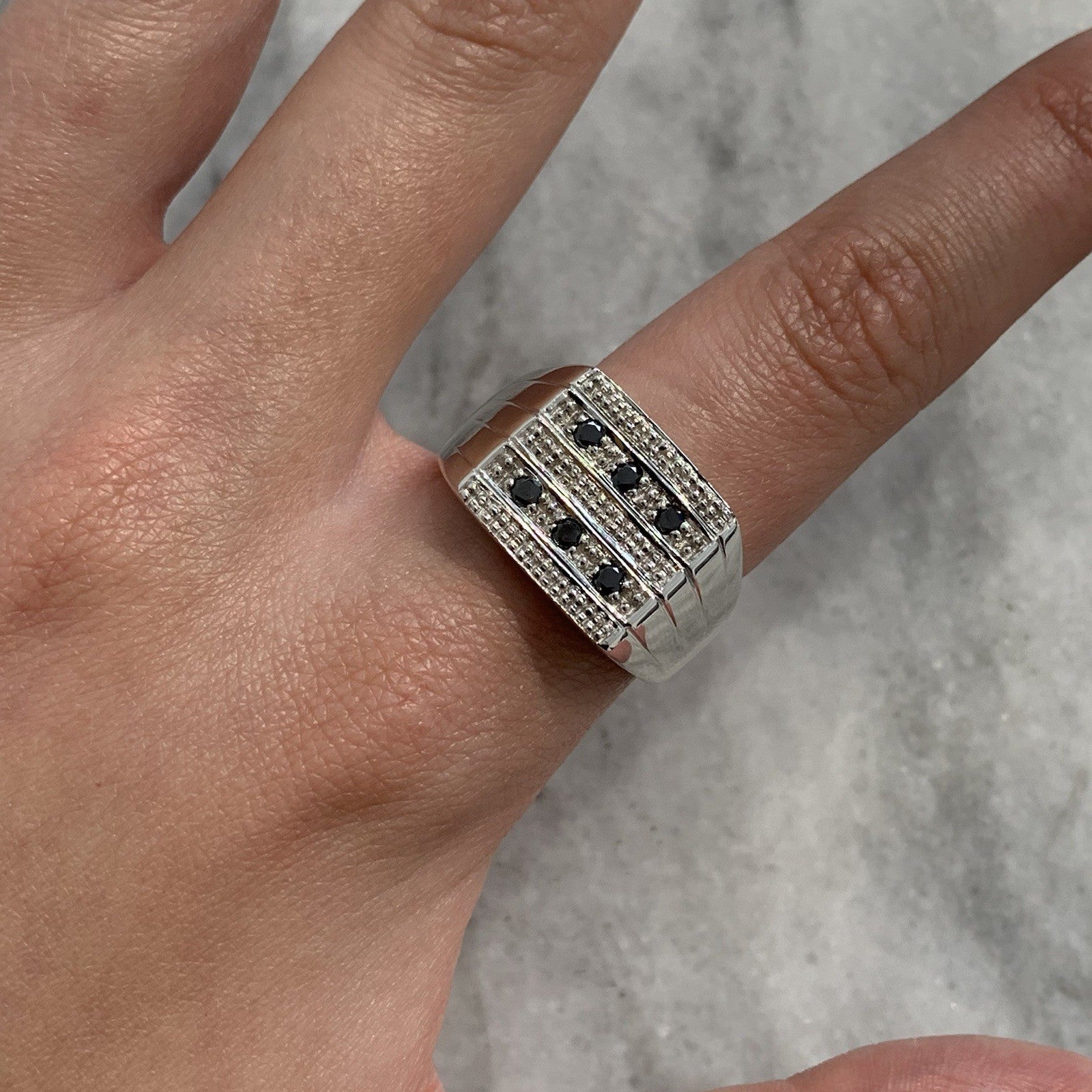 A stunning signet ring in white gold featuring black diamonds.