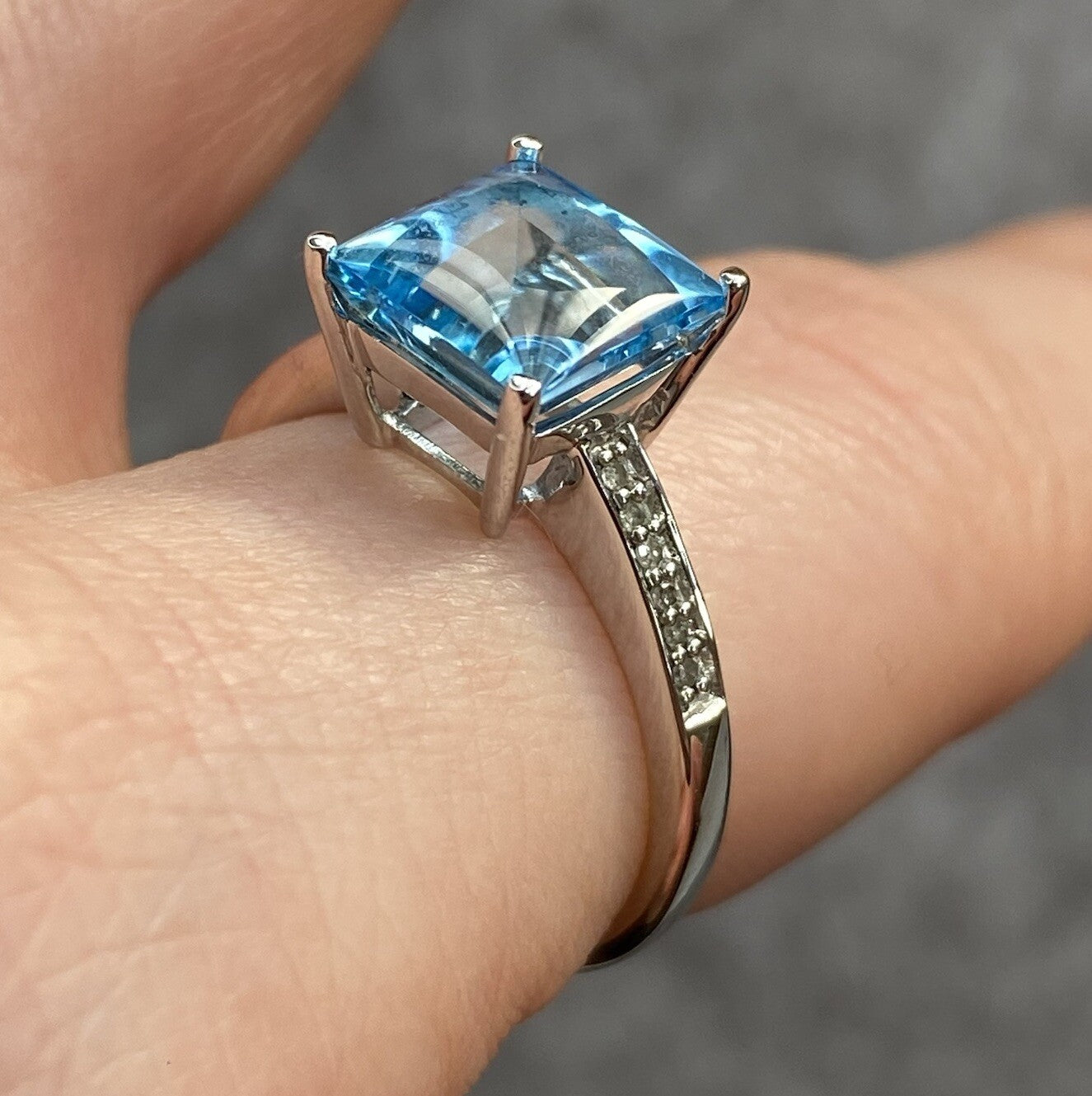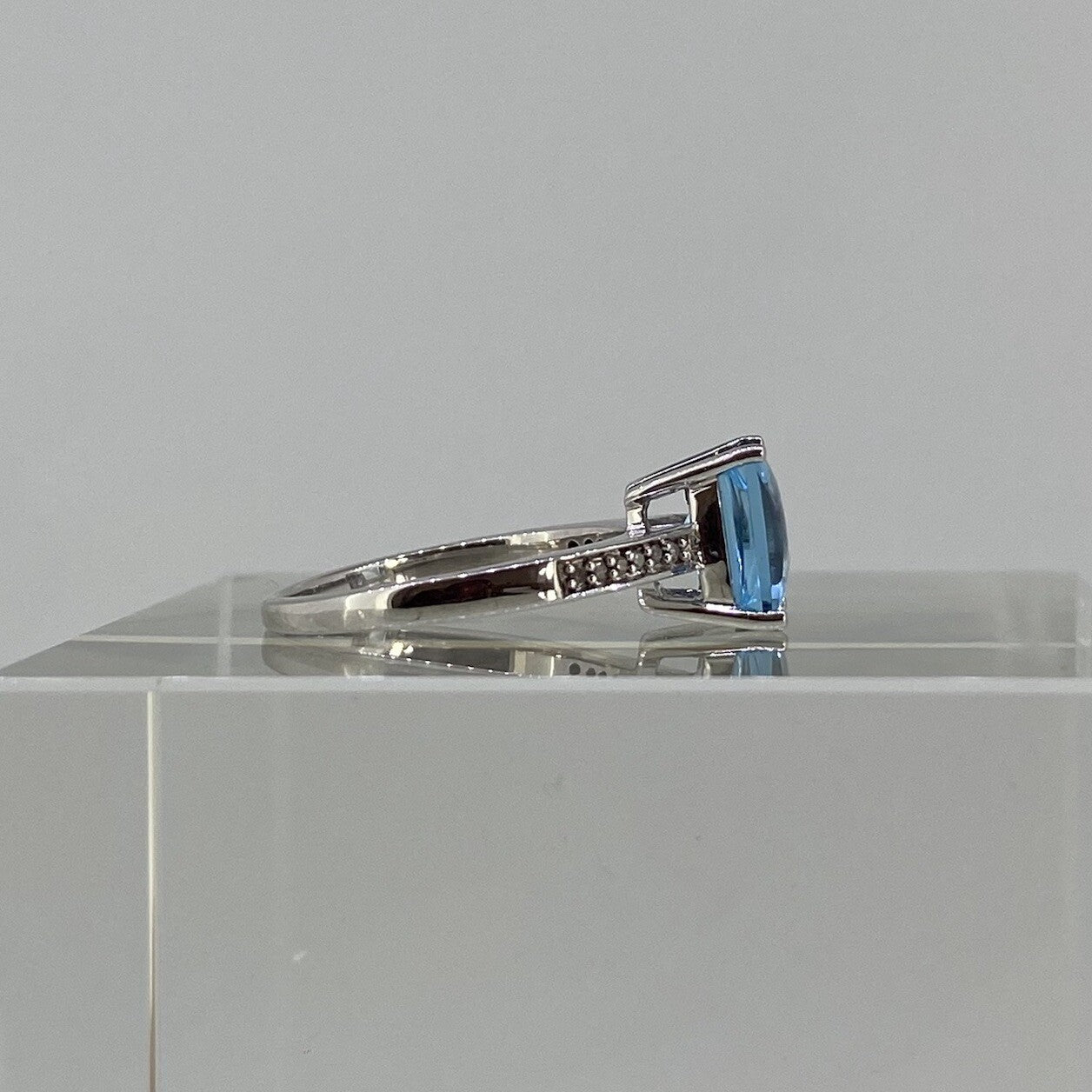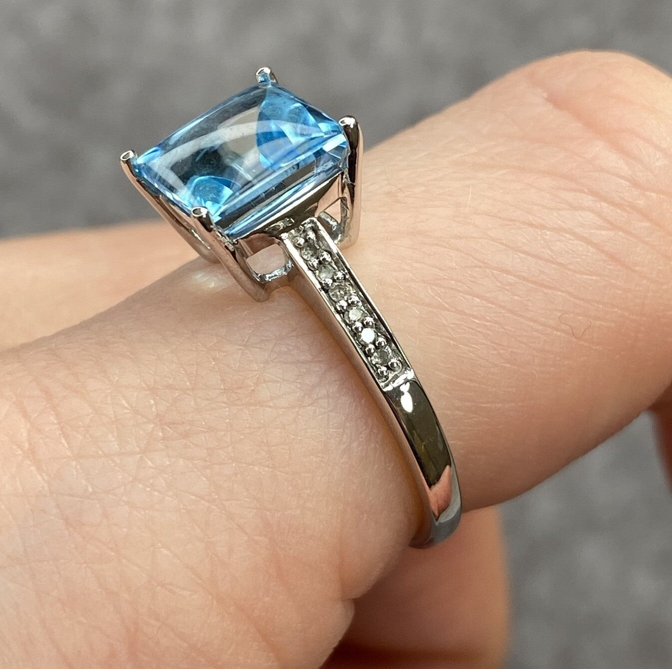 Blue Topaz Cabochon Top & Diamond Accent Ring 9ct 9k White Gold - Size N