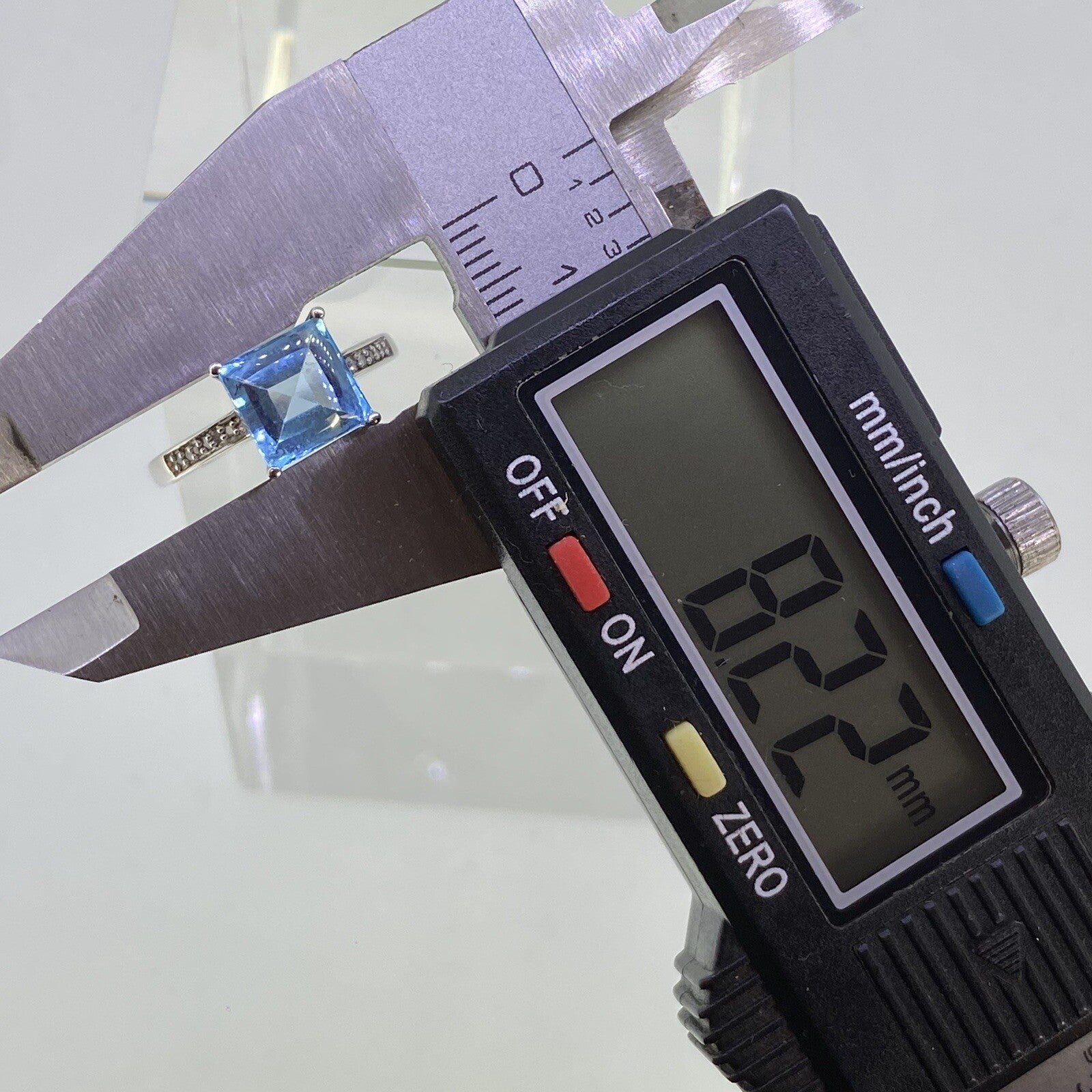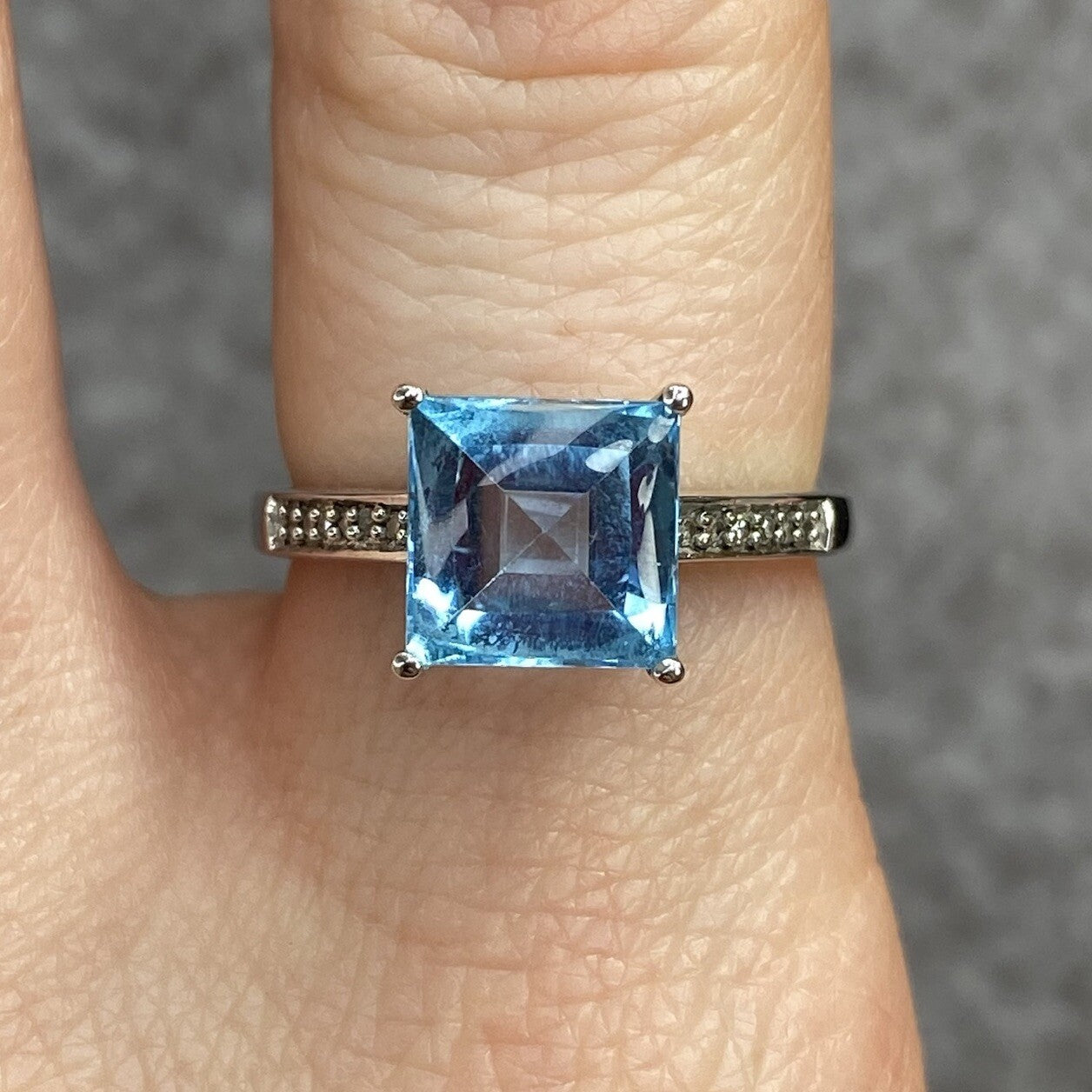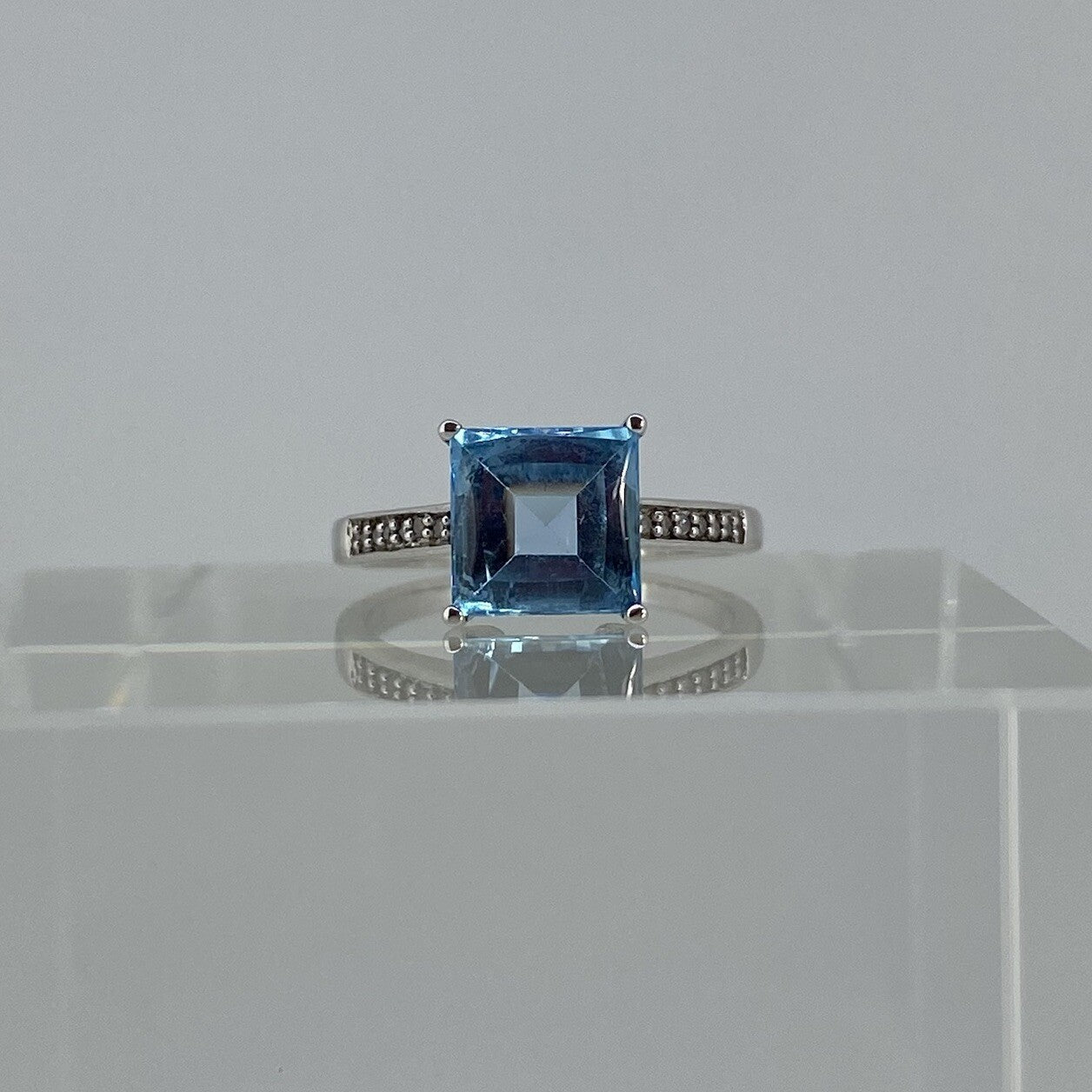 Blue Topaz Cabochon Top & Diamond Accent Ring 9ct 9k White Gold - Size N
