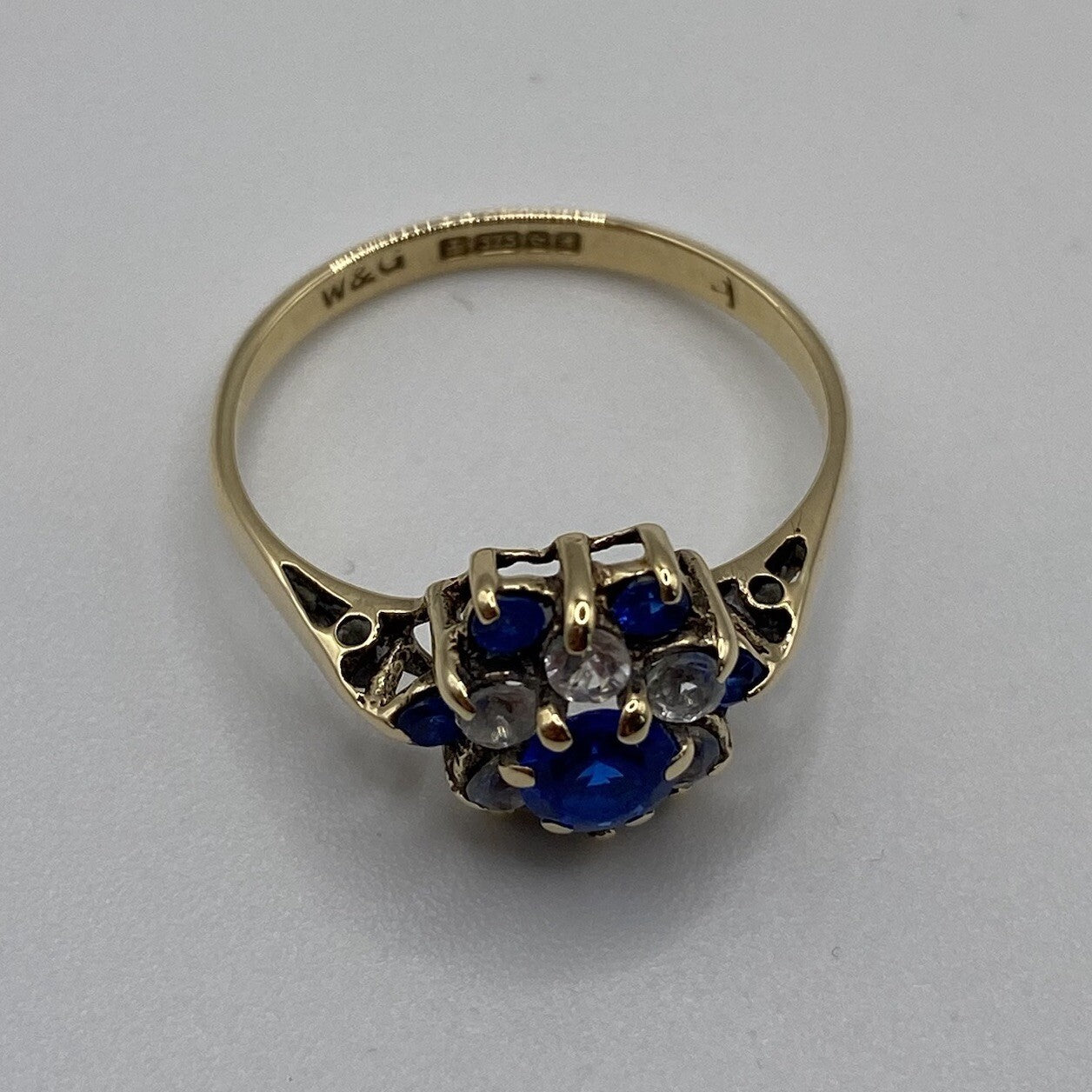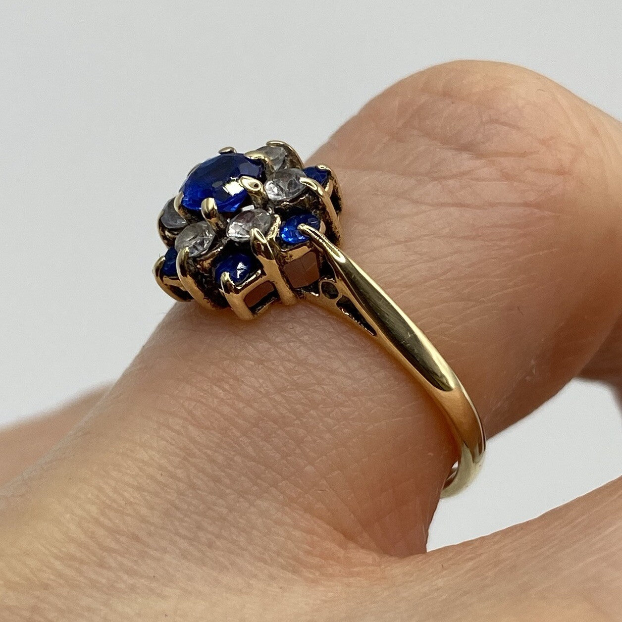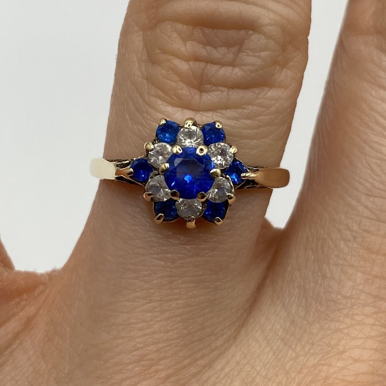 A lovely gold ring showcasing a daisy flower style cluster of blue and white cubic zirconia upon cathedral style shoulders.
