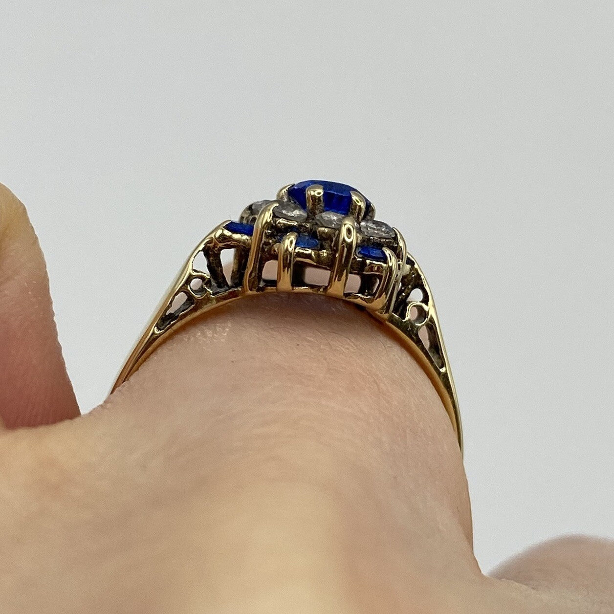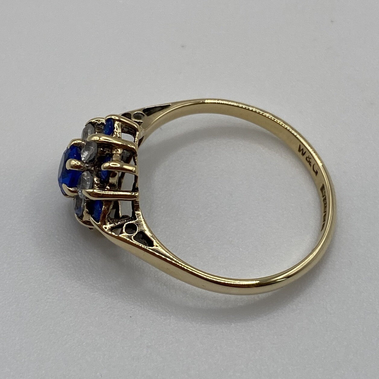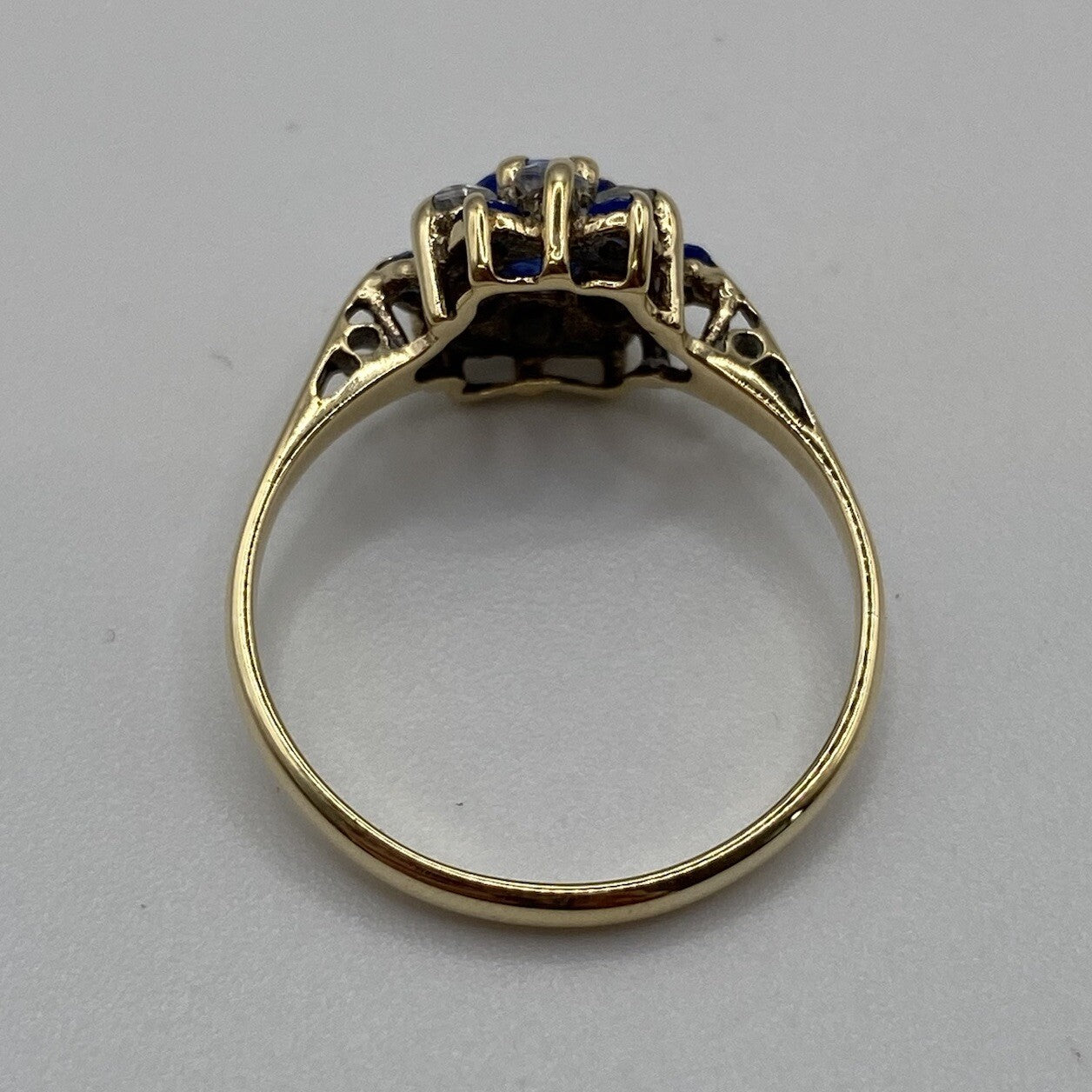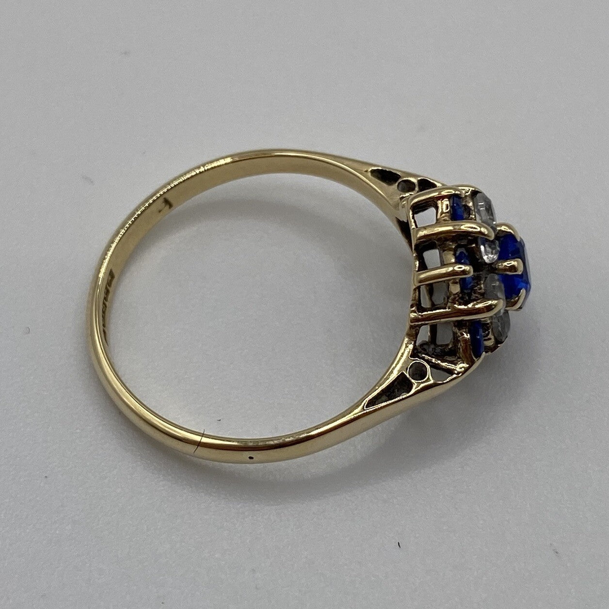 A lovely gold ring showcasing a daisy flower style cluster of blue and white cubic zirconia upon cathedral style shoulders.