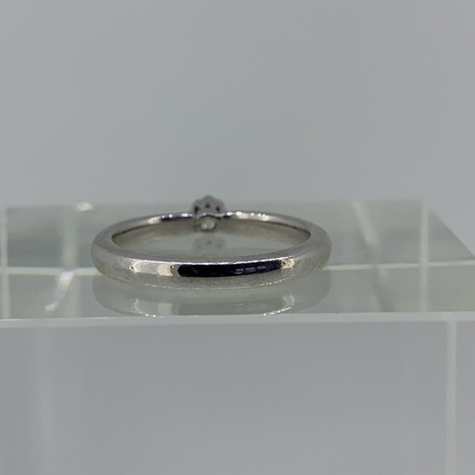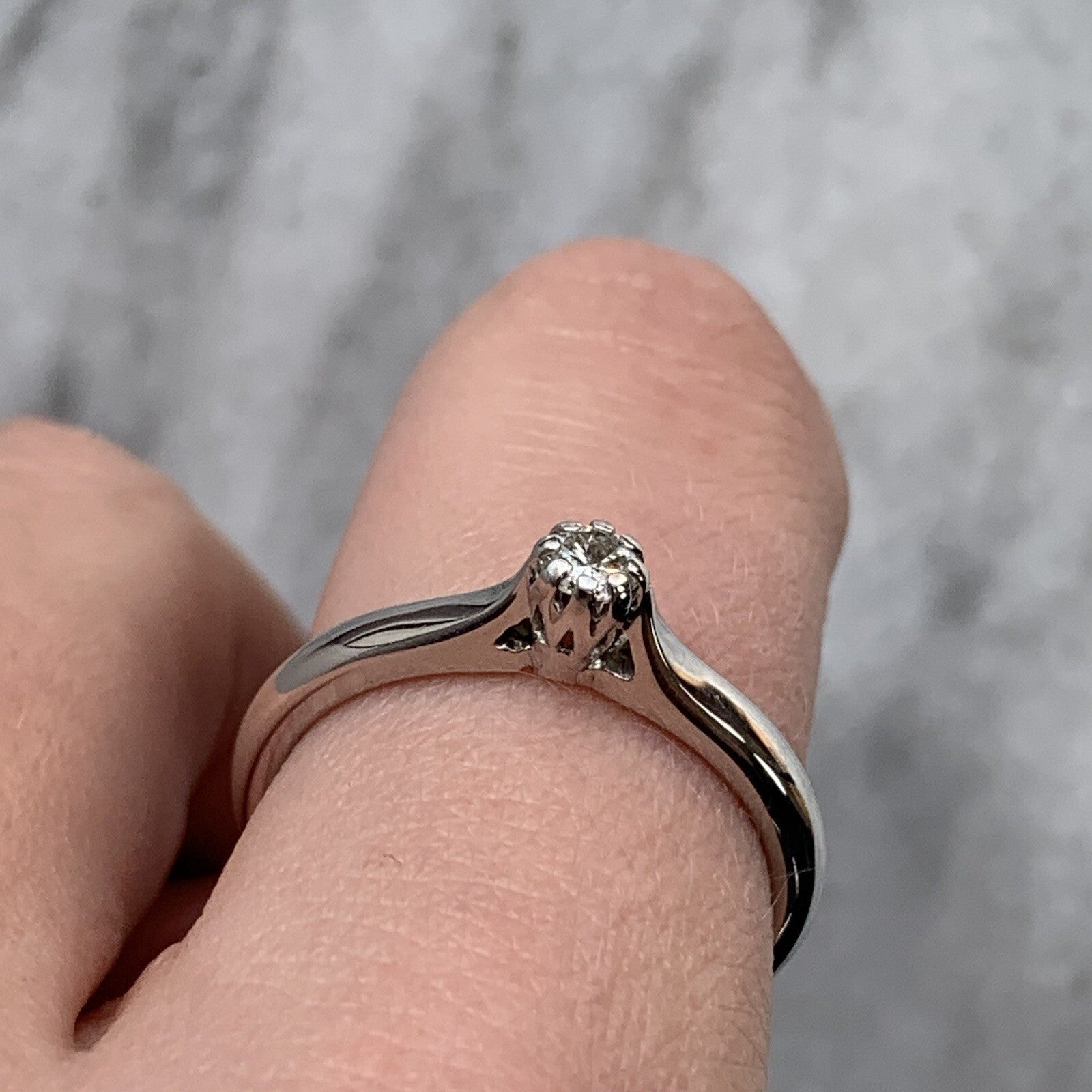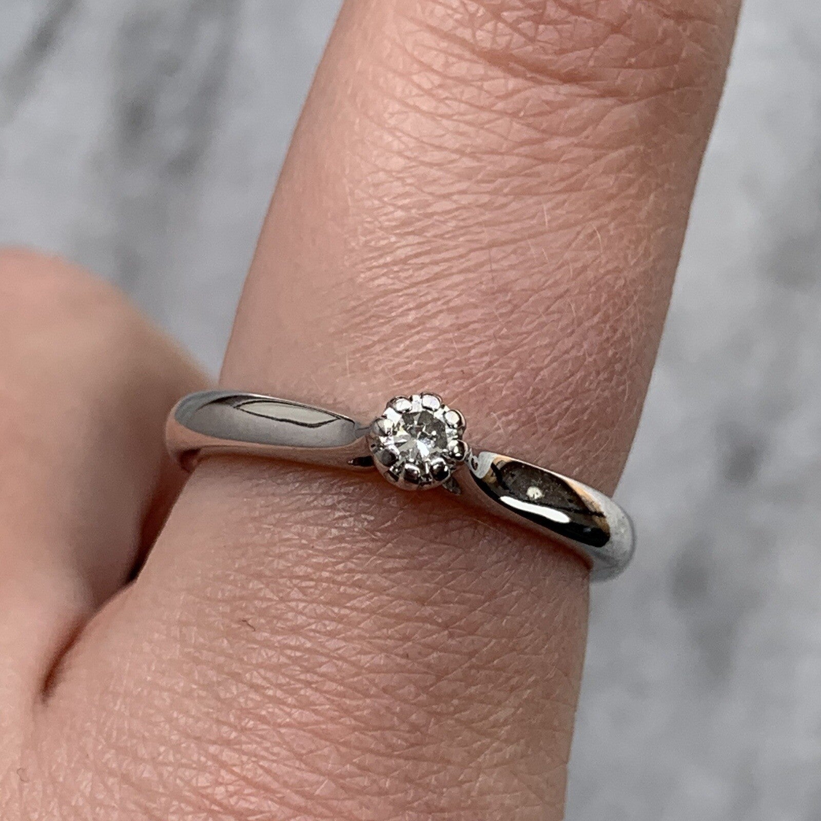 A beautiful solitaire engagement style ring with a natural round cut diamond at .15ct upon a thick, well made shank.