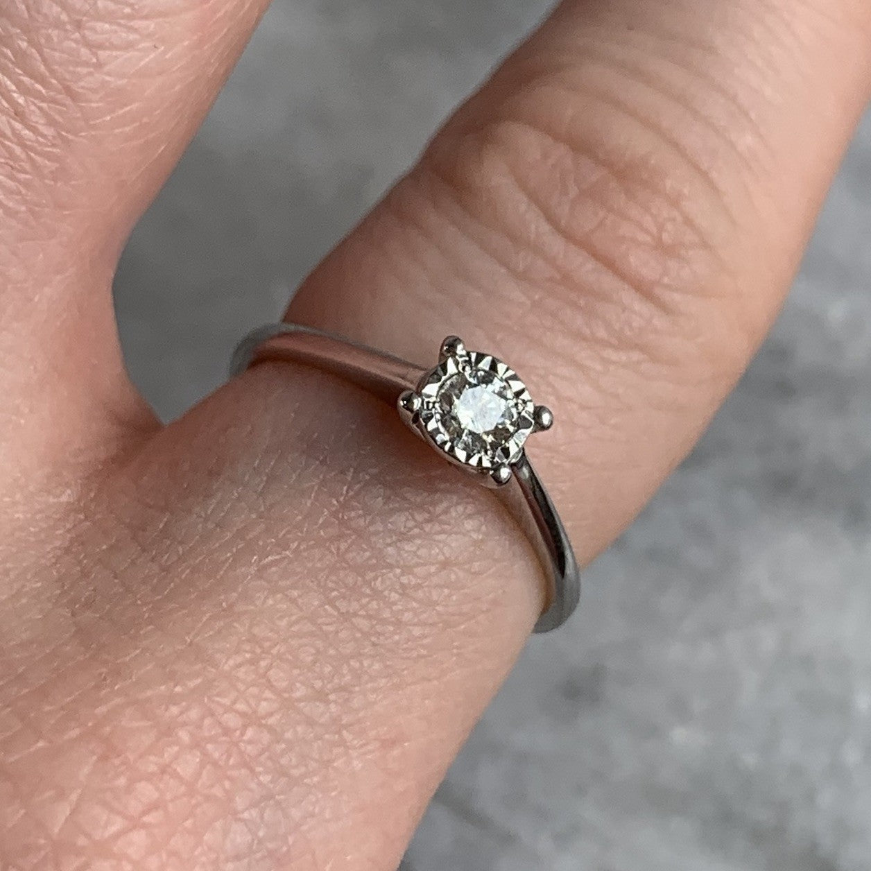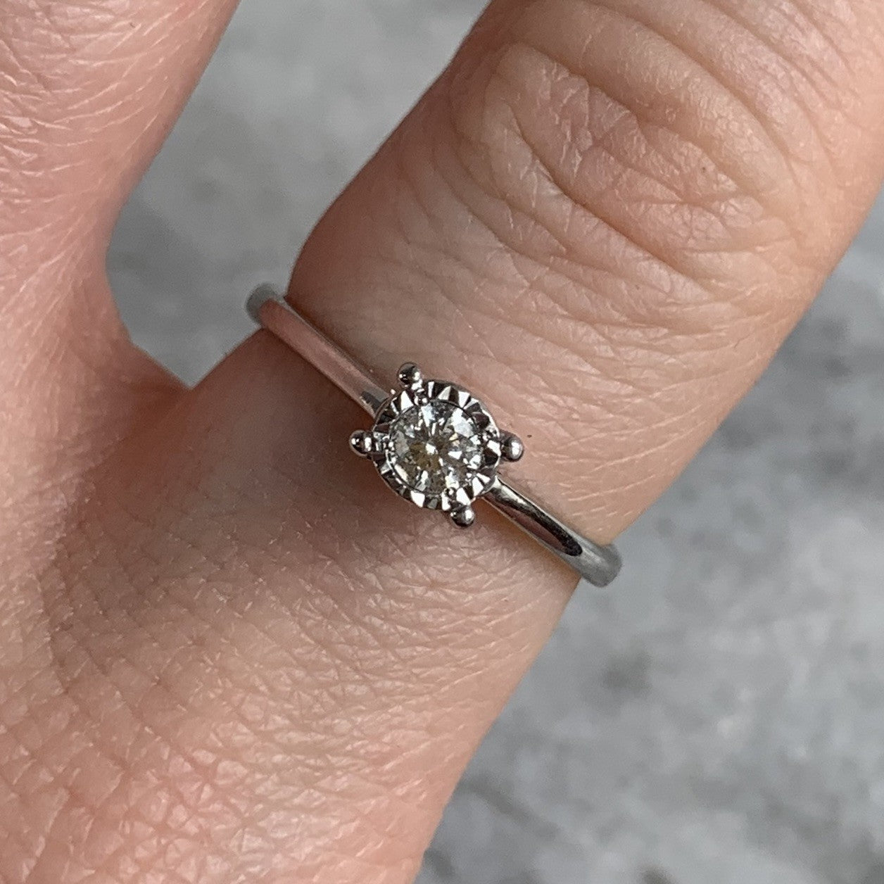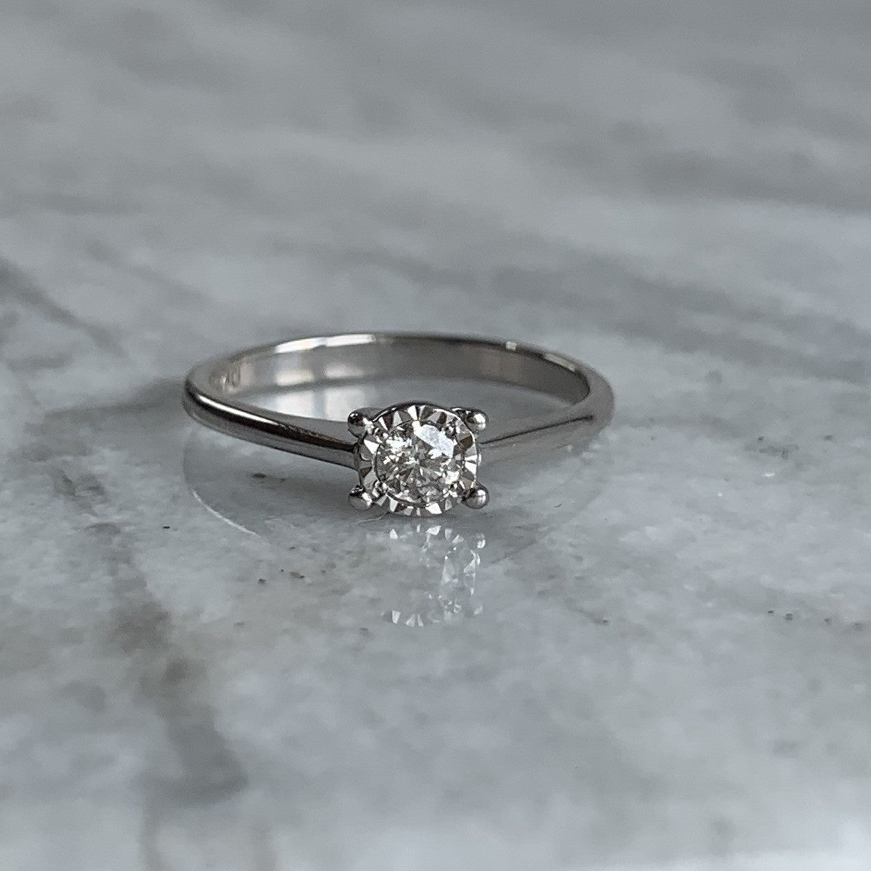 A charming white gold ring showcasing an illusion set .17ct diamond upon trellis style shoulders.