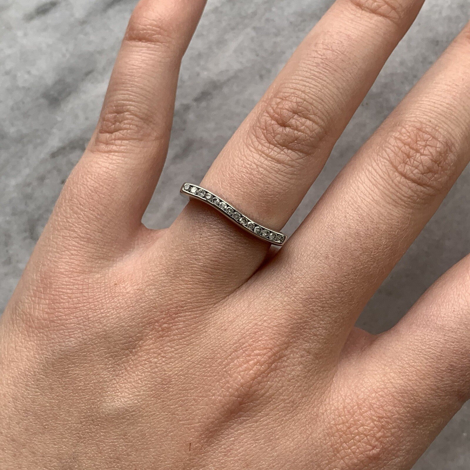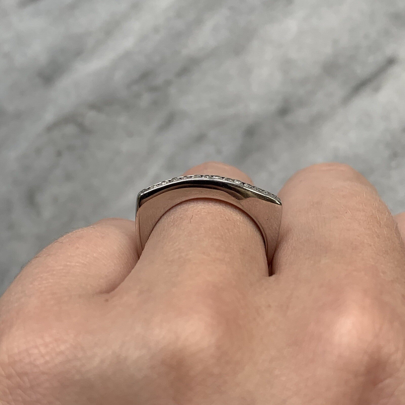 A chic minimalist ring with a channel-set row of natural diamonds in a wave with squared shoulders. Perfect for stacking with other rings.