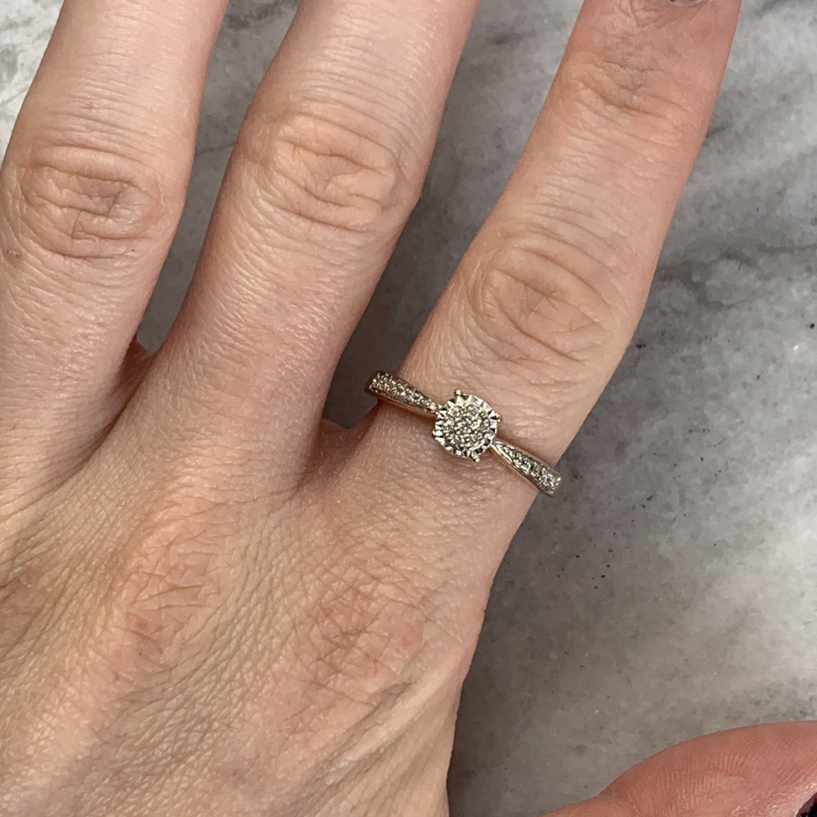 A beautiful gold ring showcasing an illusion style cluster of diamonds, with additional diamond accents on the shoulders.