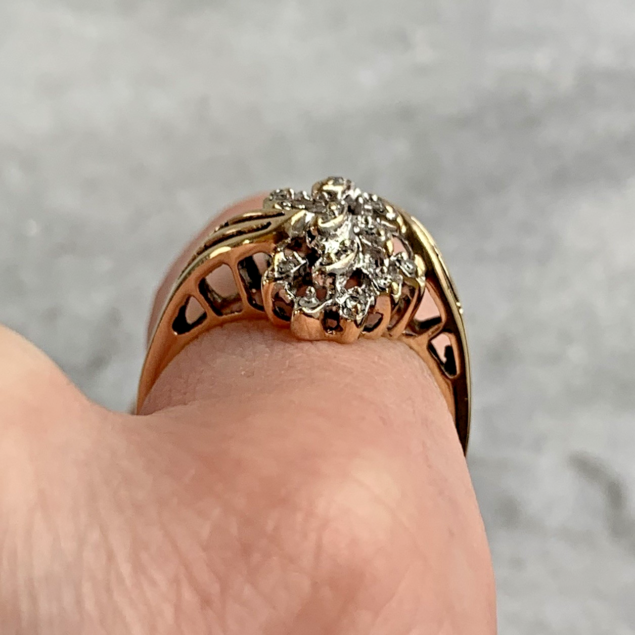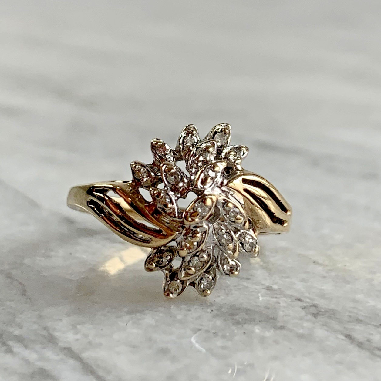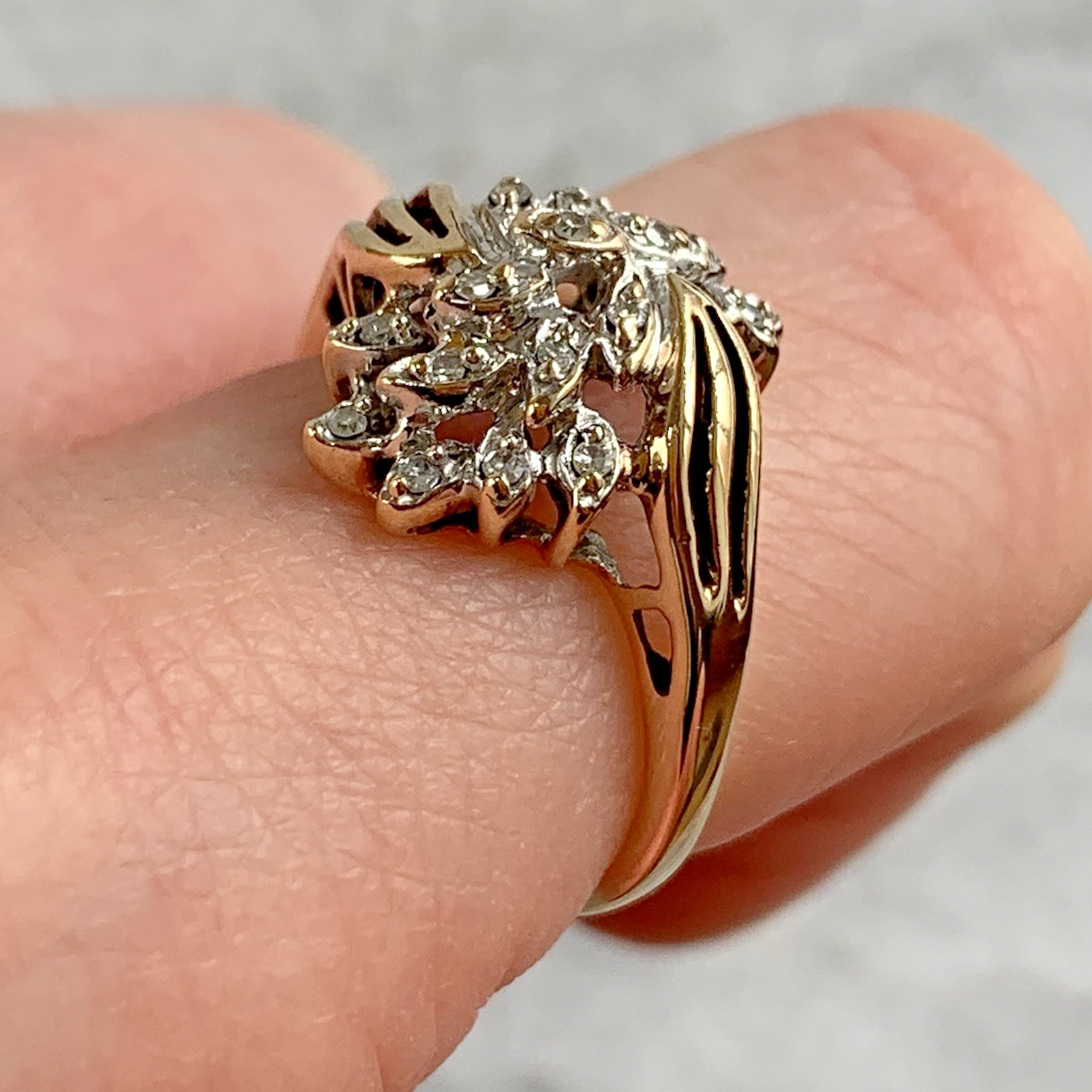 Diamond Ring 9ct Gold Foliate Cluster Bypass in 375 Yellow Gold - Size N