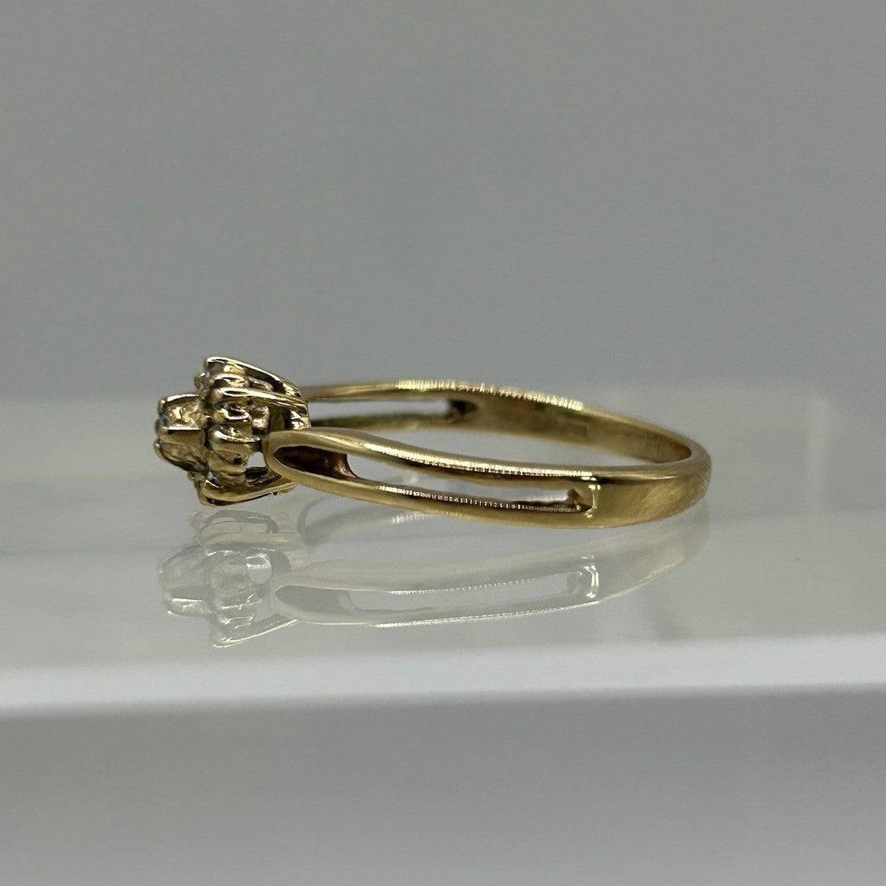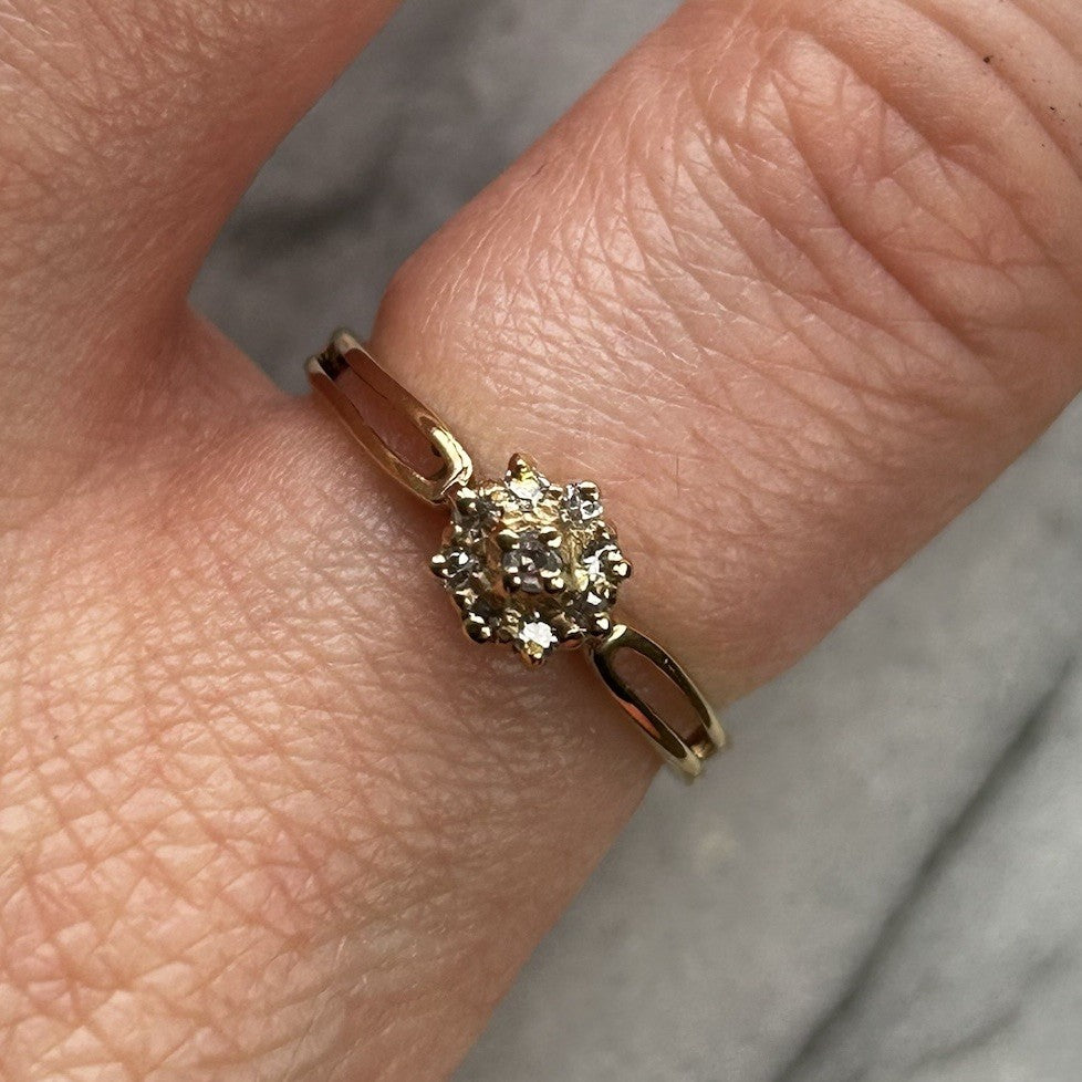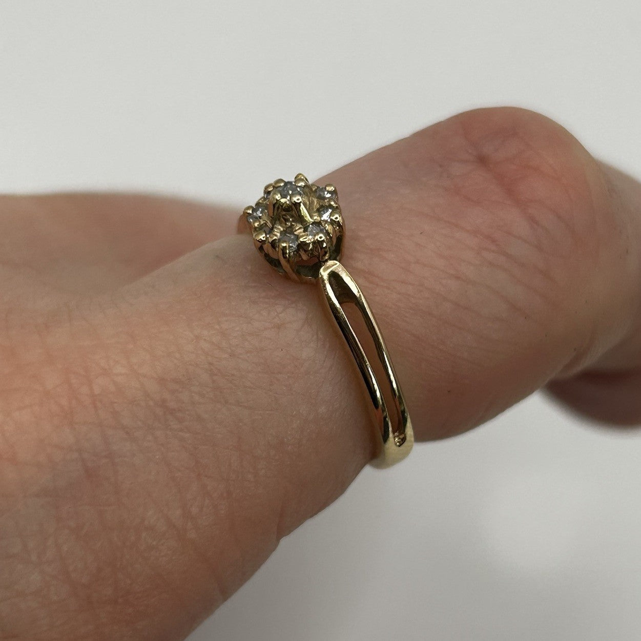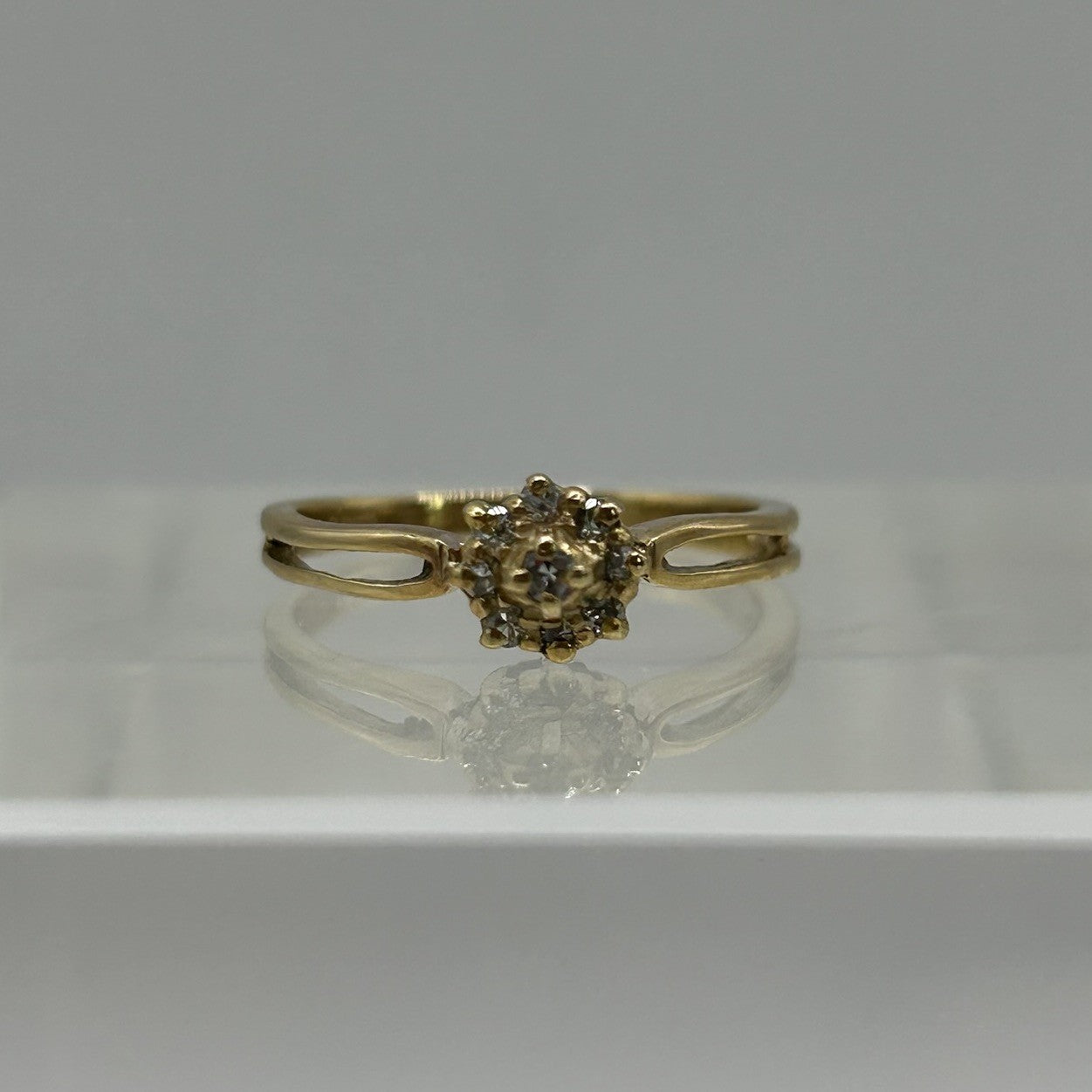 A beautiful gold ring showcasing a petite tiered cluster of diamonds upon split detail shoulders.