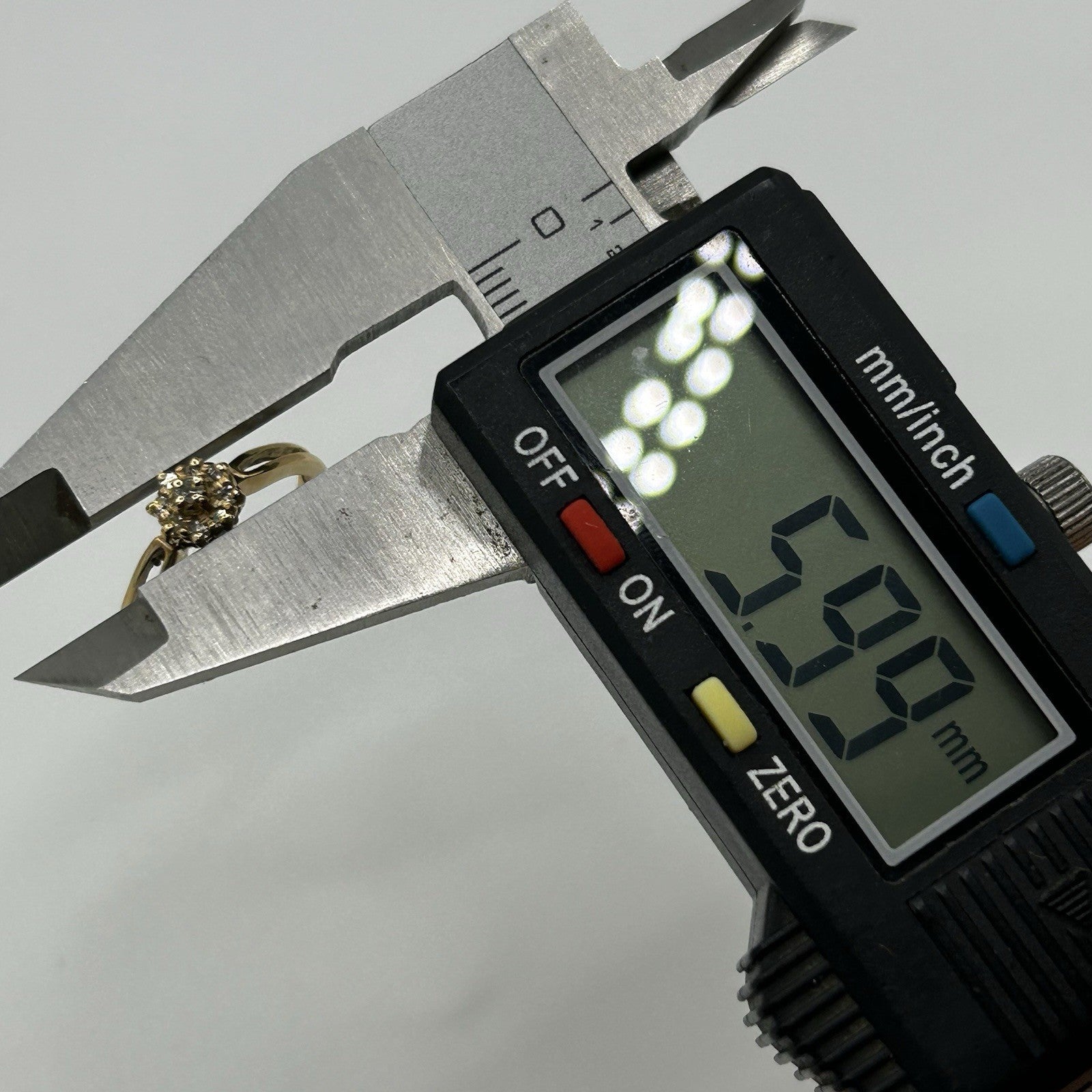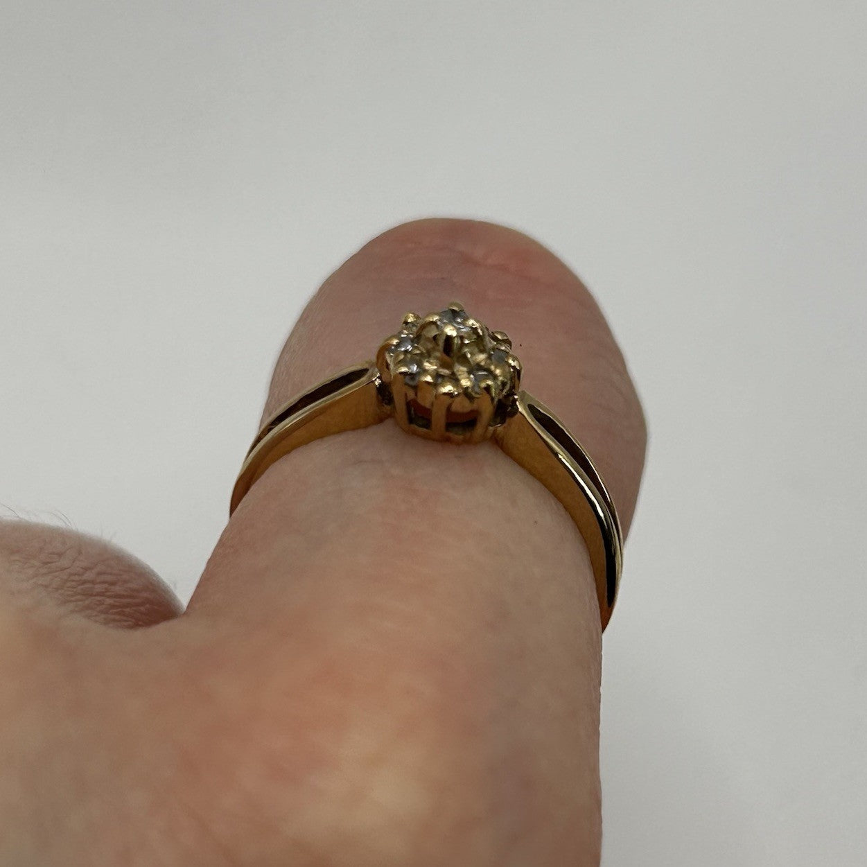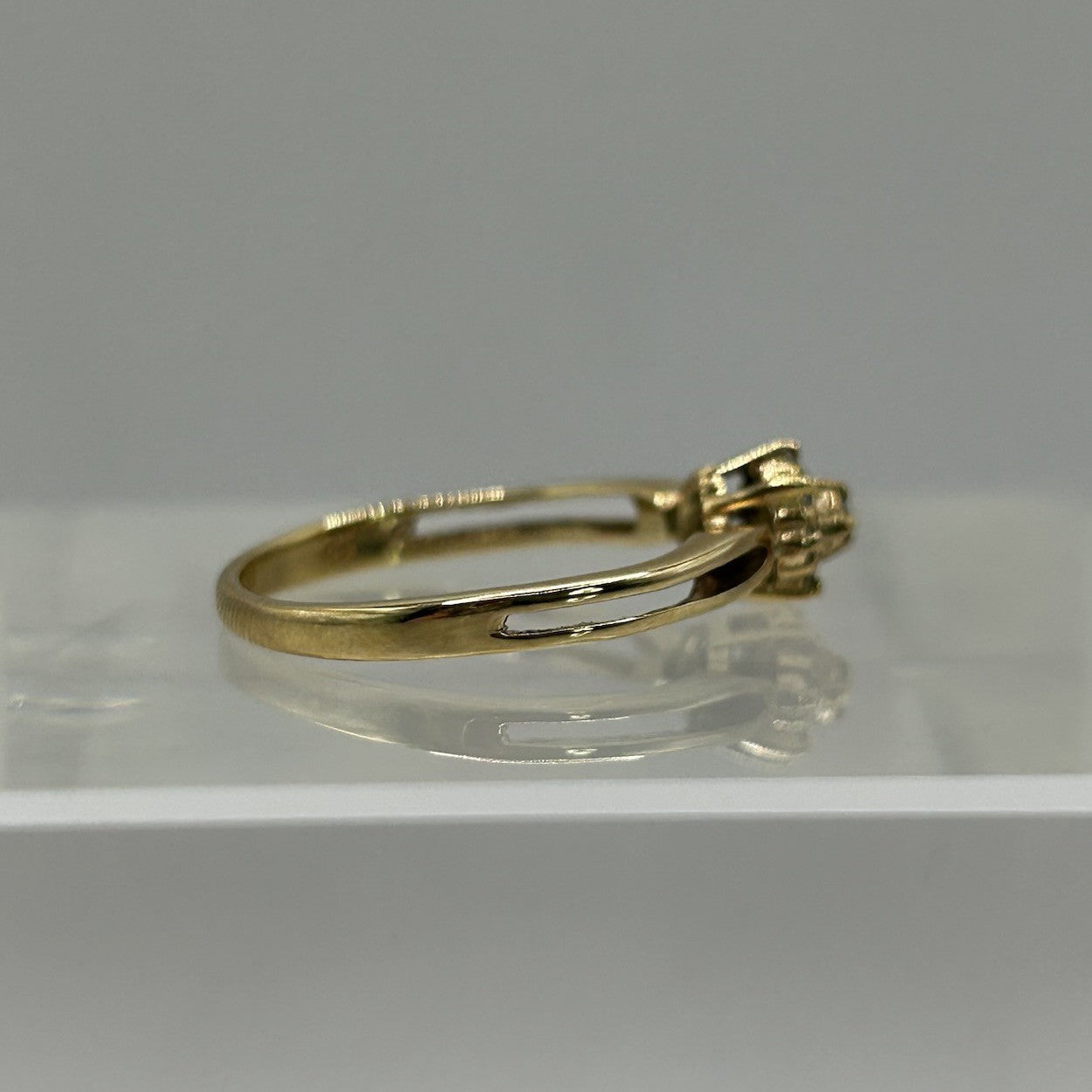 A beautiful gold ring showcasing a petite tiered cluster of diamonds upon split detail shoulders.