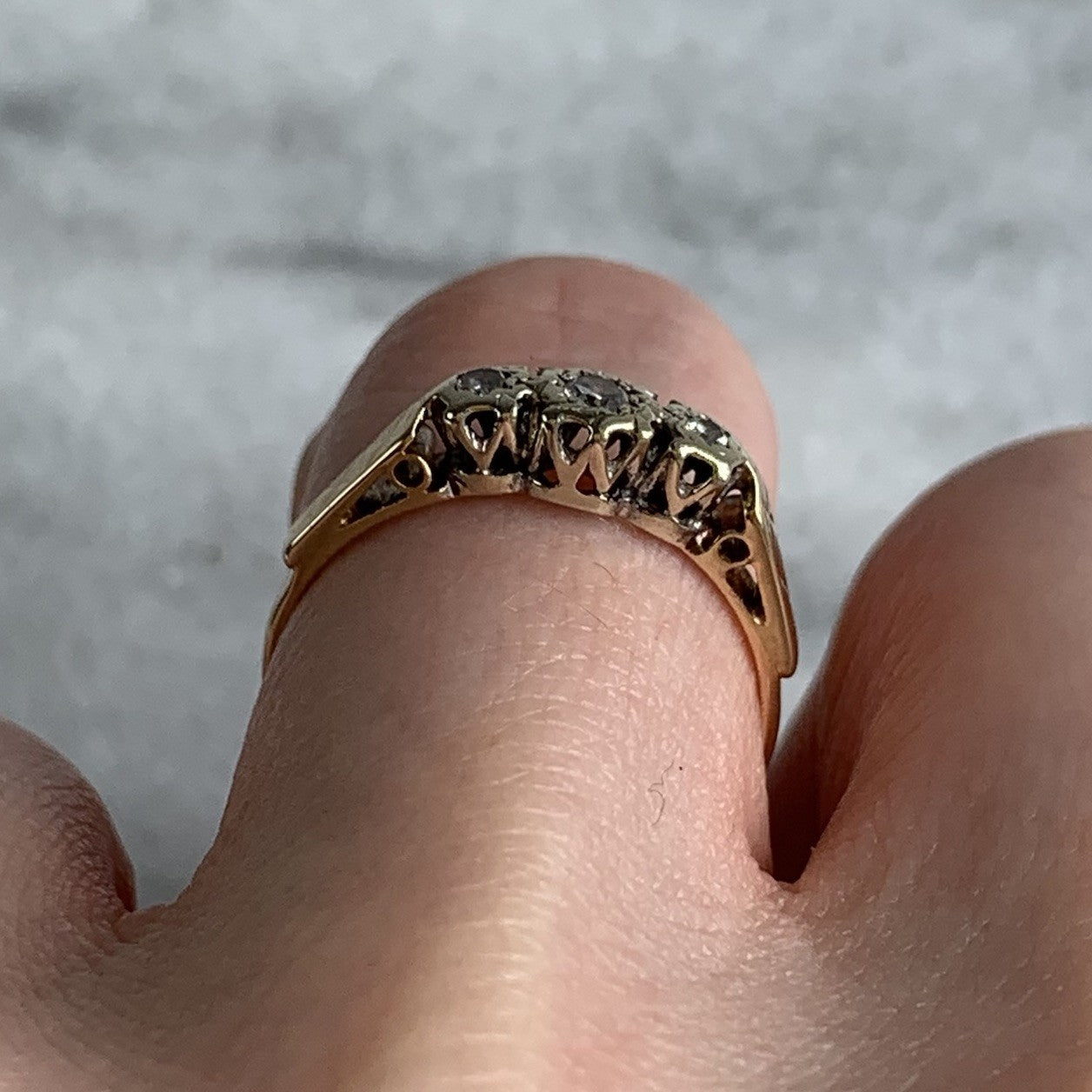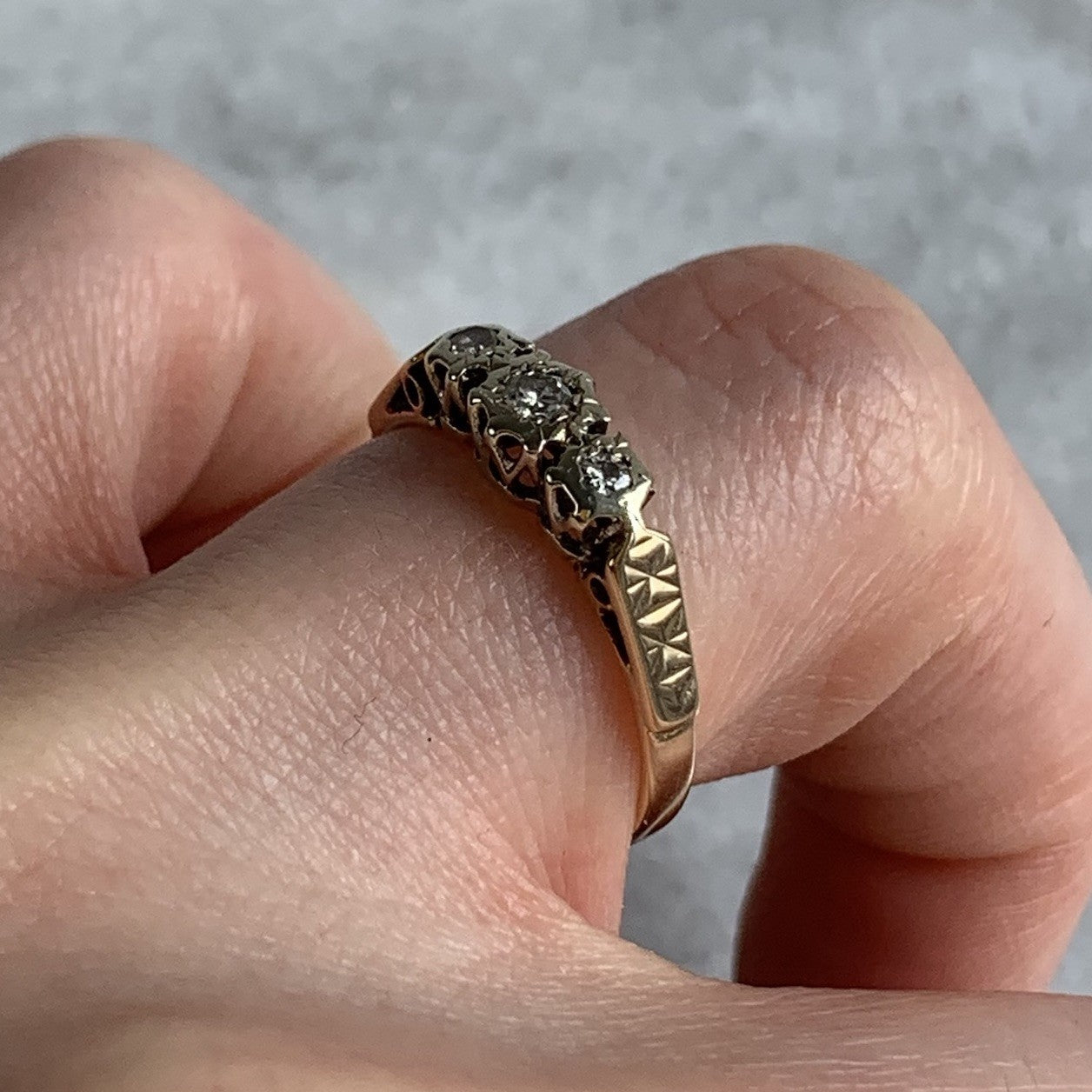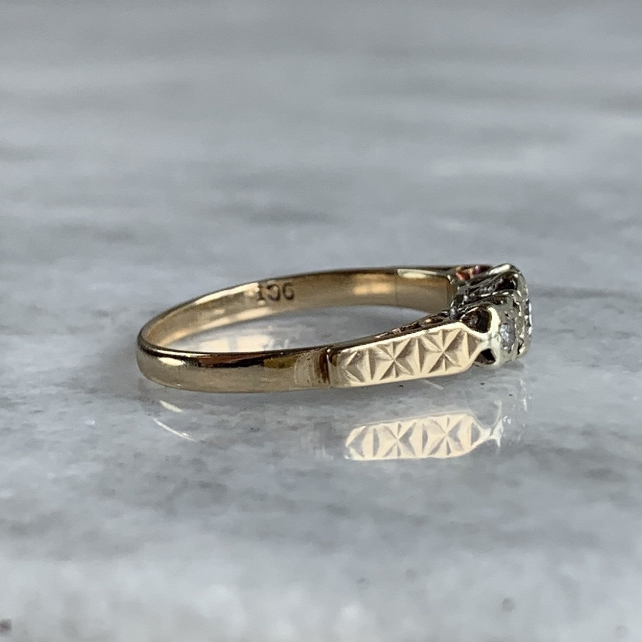 A lovely gold ring showcasing a trilogy of illusion set diamonds upon antique style shoulders with a textured patterned finish.