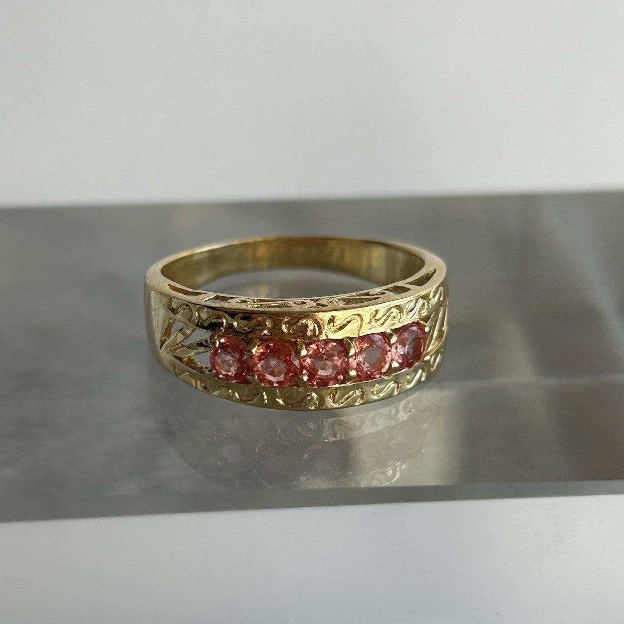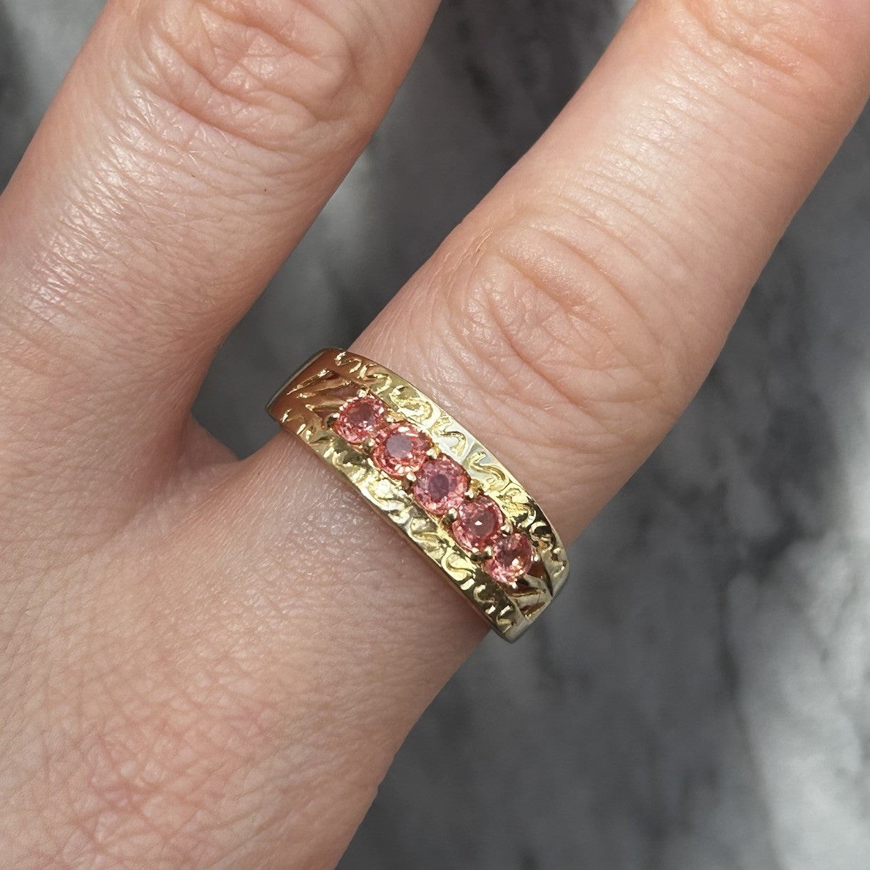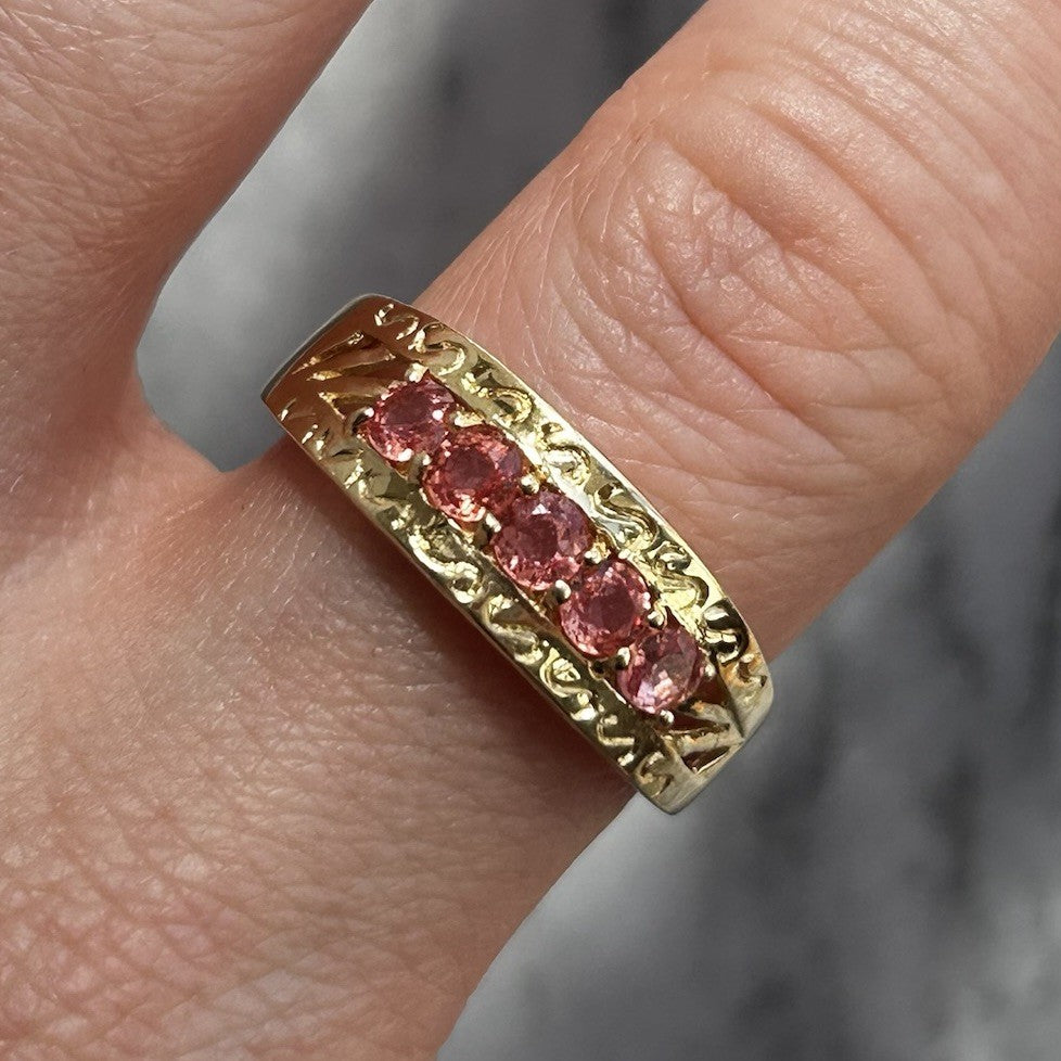 A unique gold band ring showcasing a quintet of orange/pink sapphires, accented by subtle engraved designs and cut out detail on the shoulders.