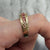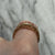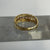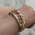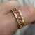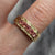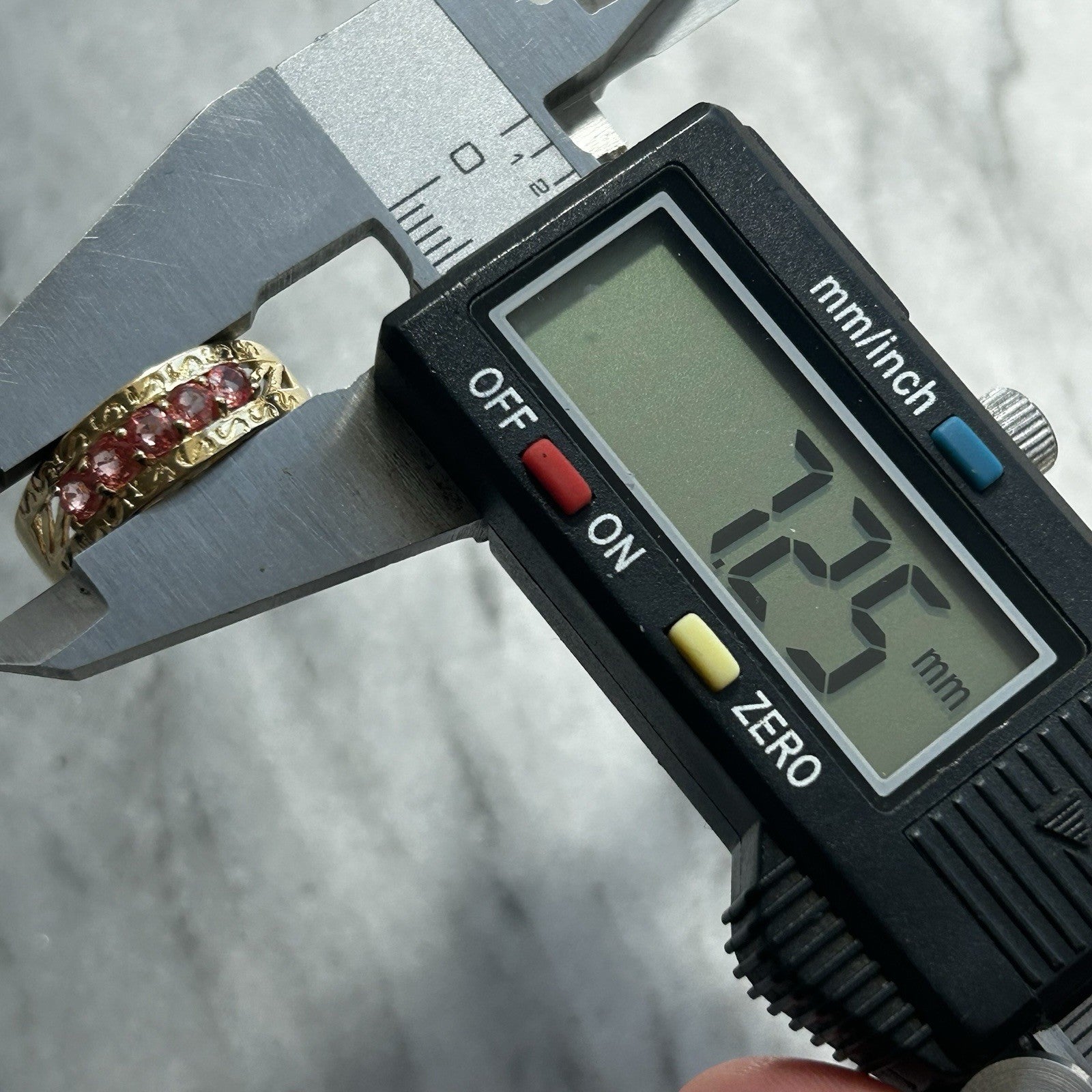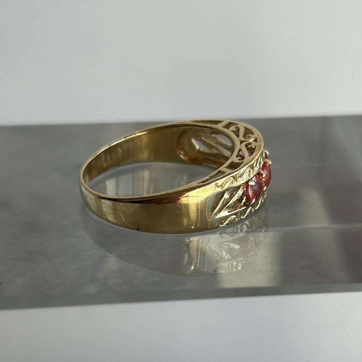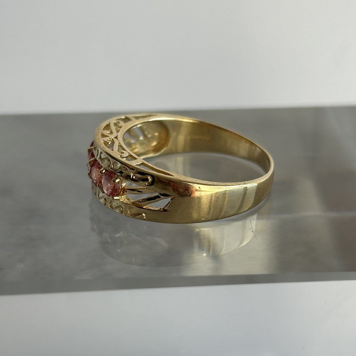 A unique gold band ring showcasing a quintet of orange/pink sapphires, accented by subtle engraved designs and cut out detail on the shoulders.