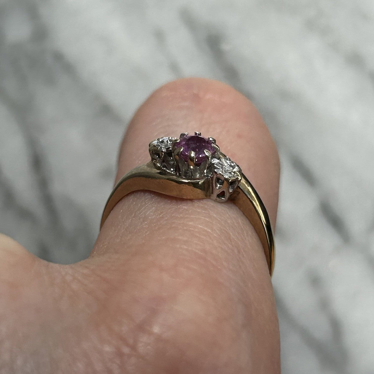 A stunning gold bypass style ring showcasing a round cut pink topaz gemstone, flanked by a duo of illusion set diamonds.