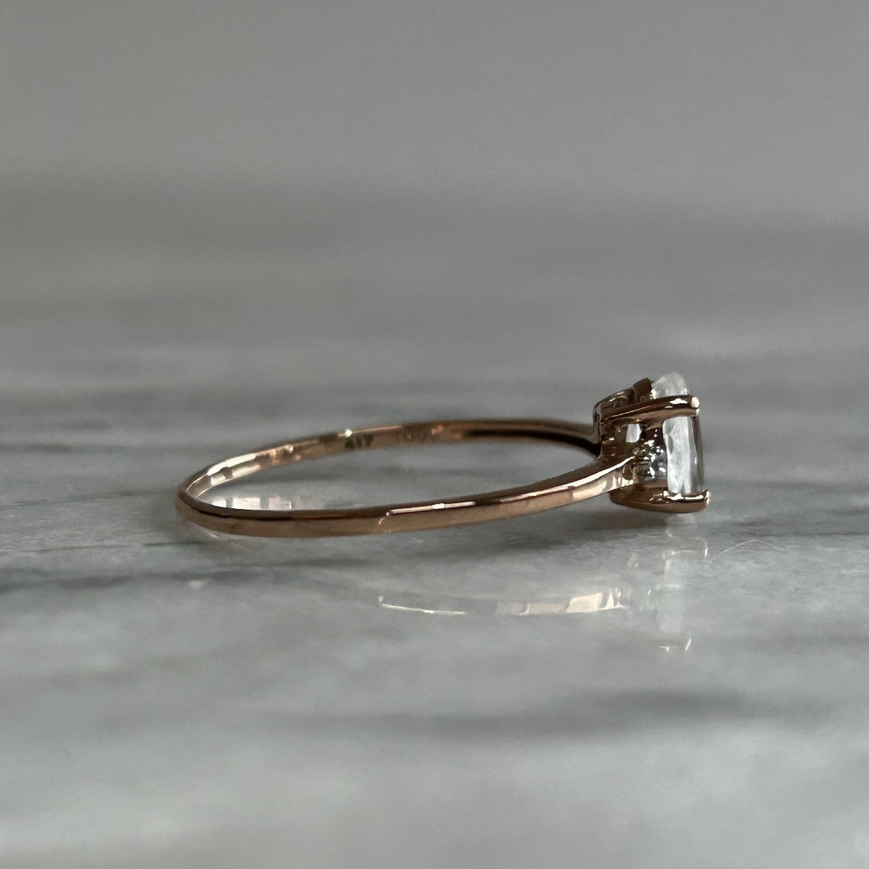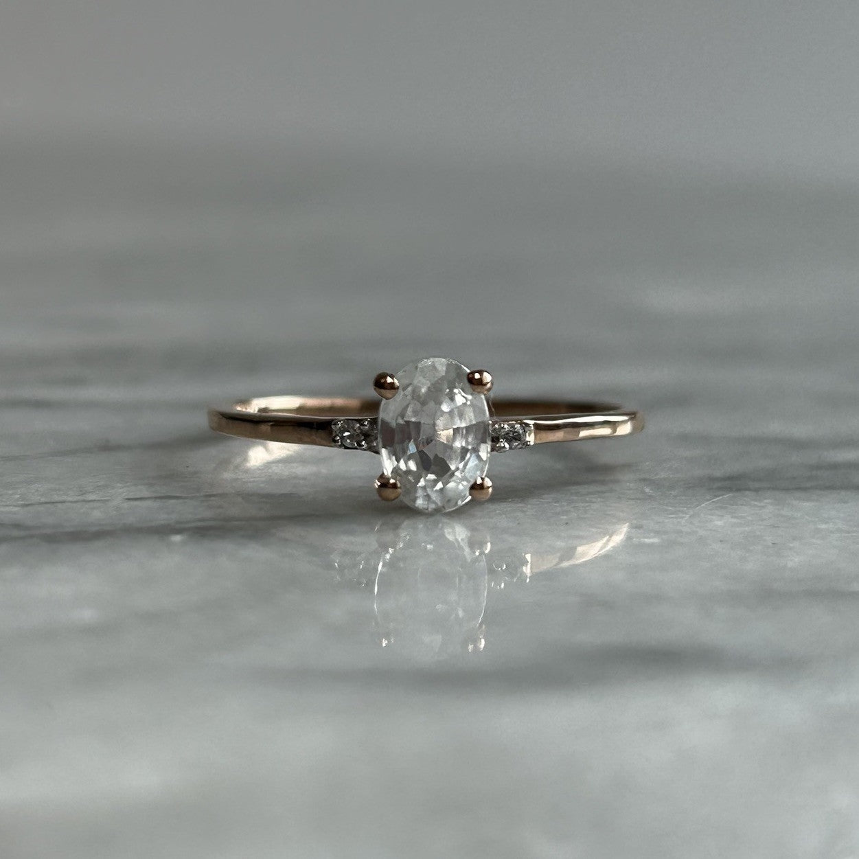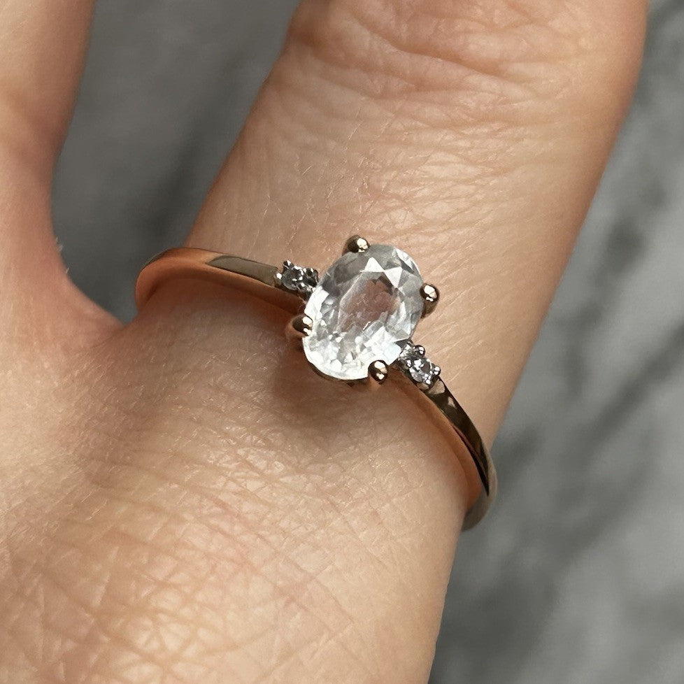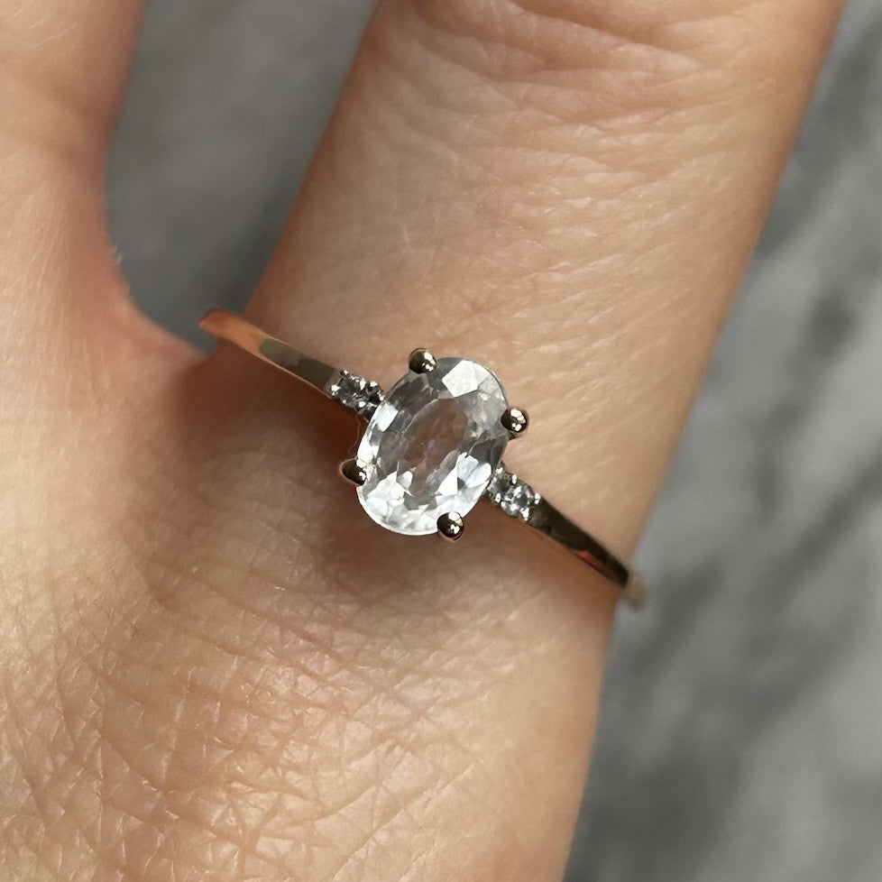 A charming rose gold ring showcasing a Ratanakiri white zircon, flanked by a duo of petite white spinel gemstones.