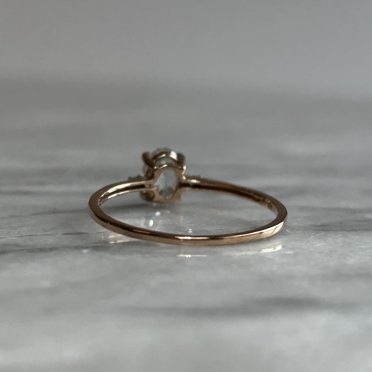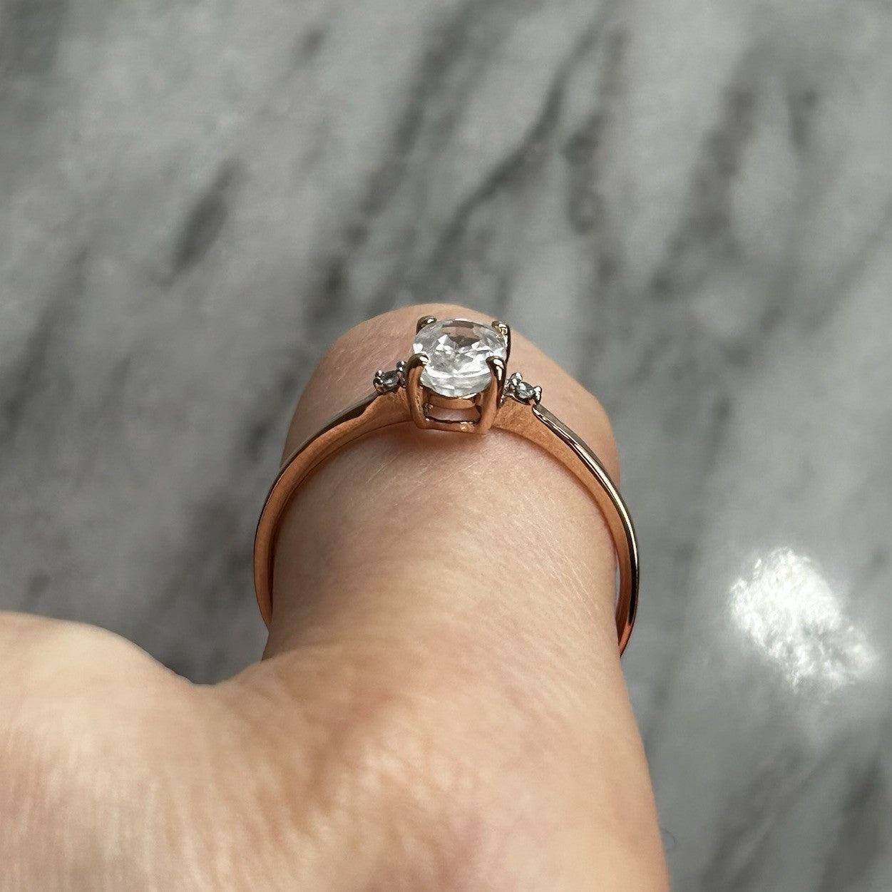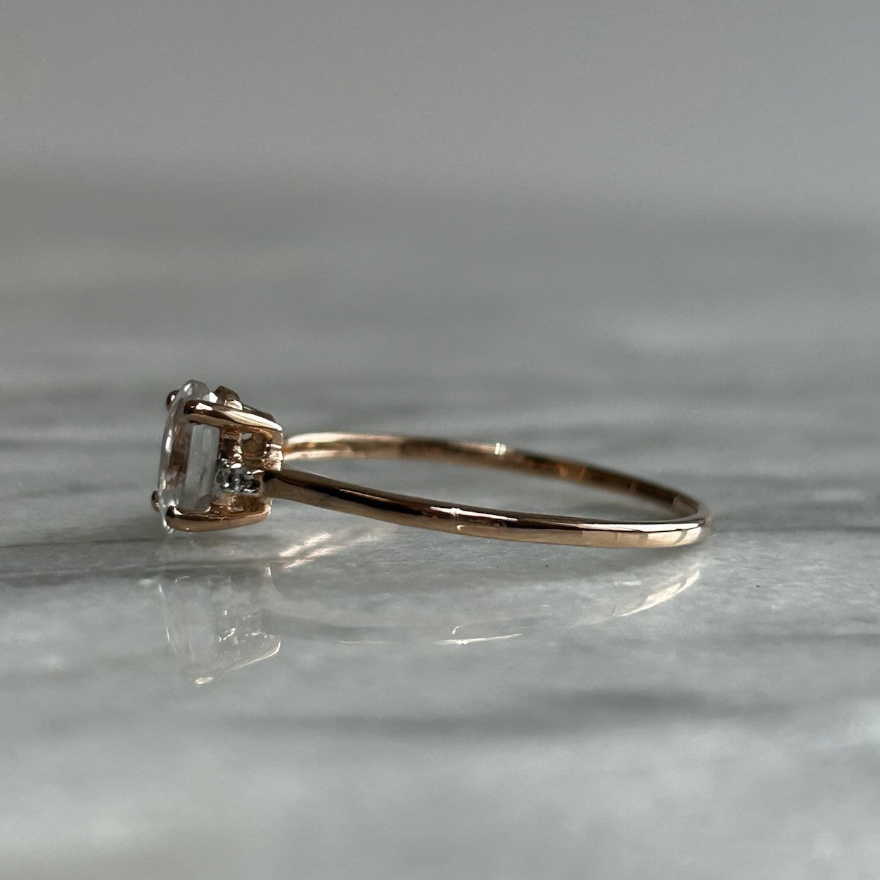 A charming rose gold ring showcasing a Ratanakiri white zircon, flanked by a duo of petite white spinel gemstones.