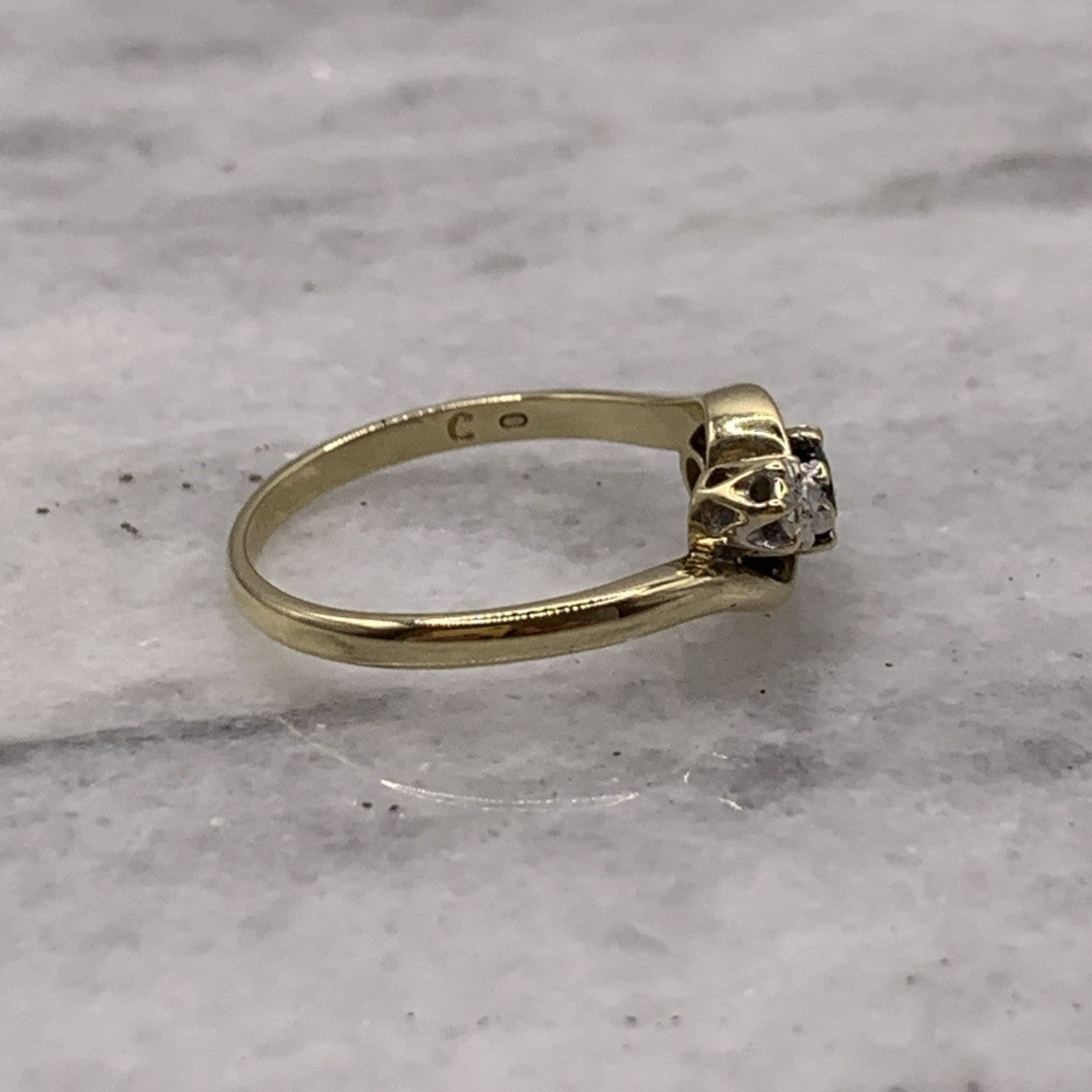 A stunning gold bypass style ring showcasing a round cut diamond flanked by a duo of illusion set diamonds.