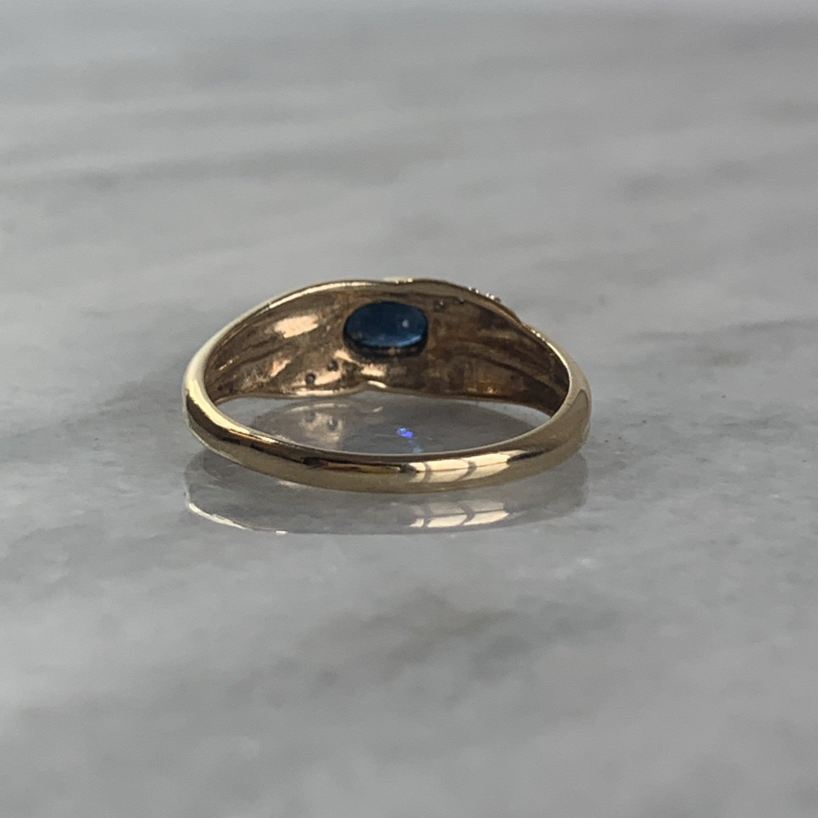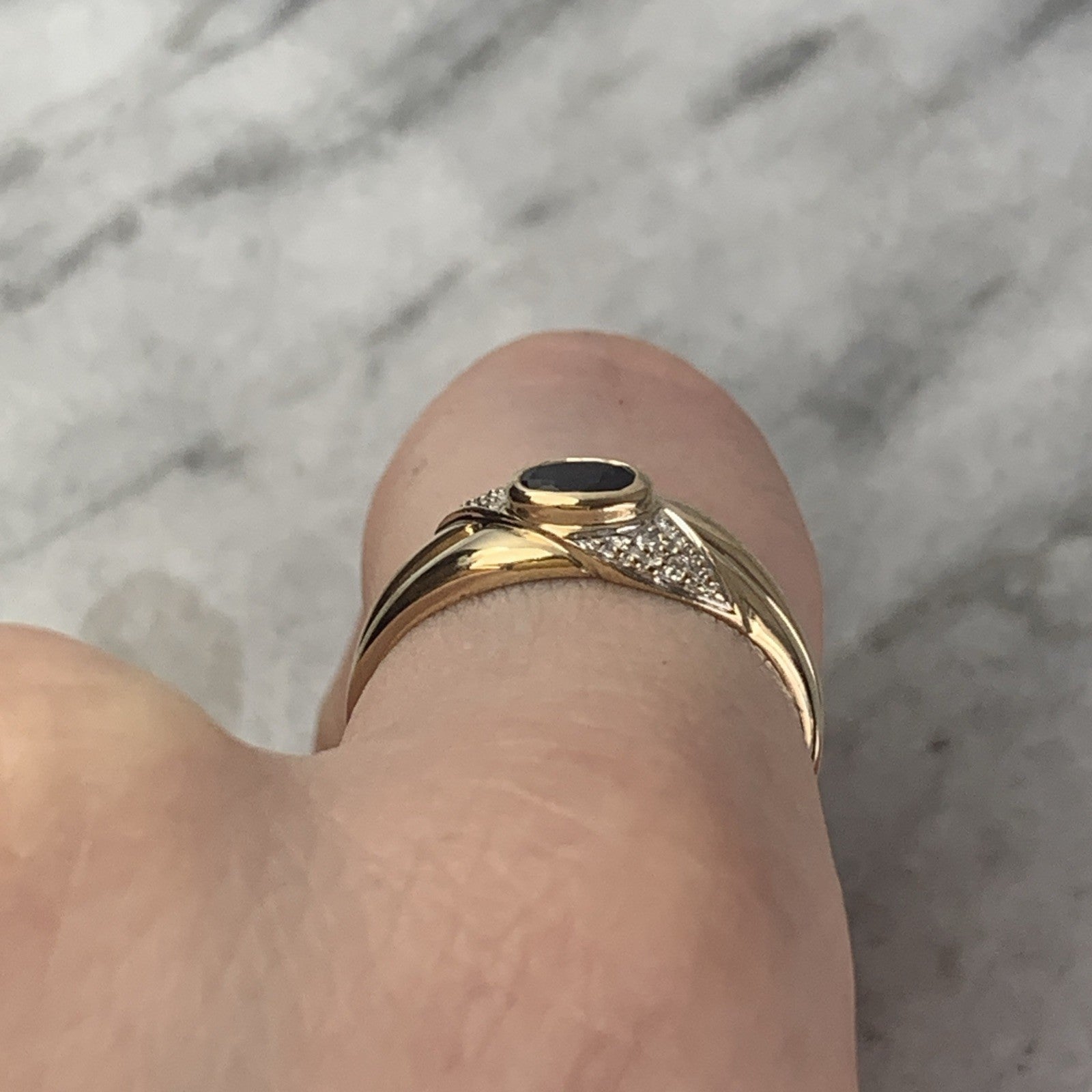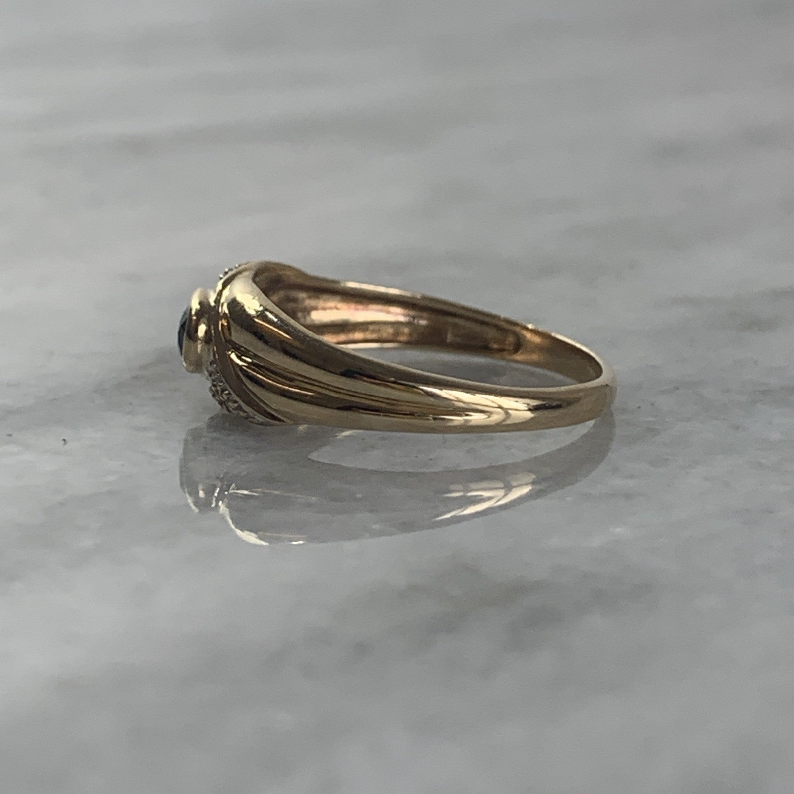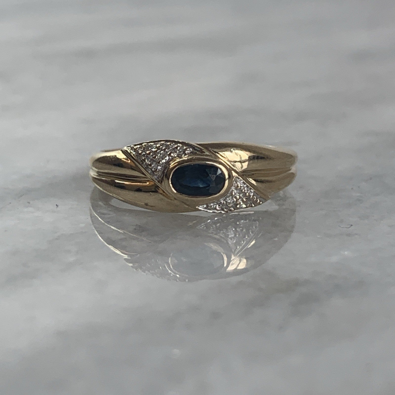 A lovely gold band ring featuring a bezel set sapphire, accented by a collection of pave set diamonds.