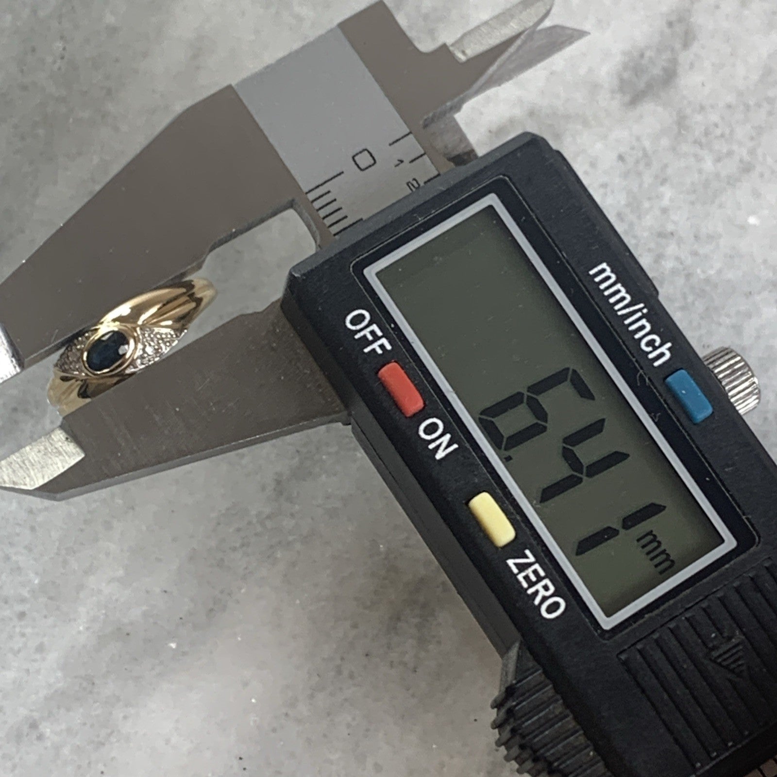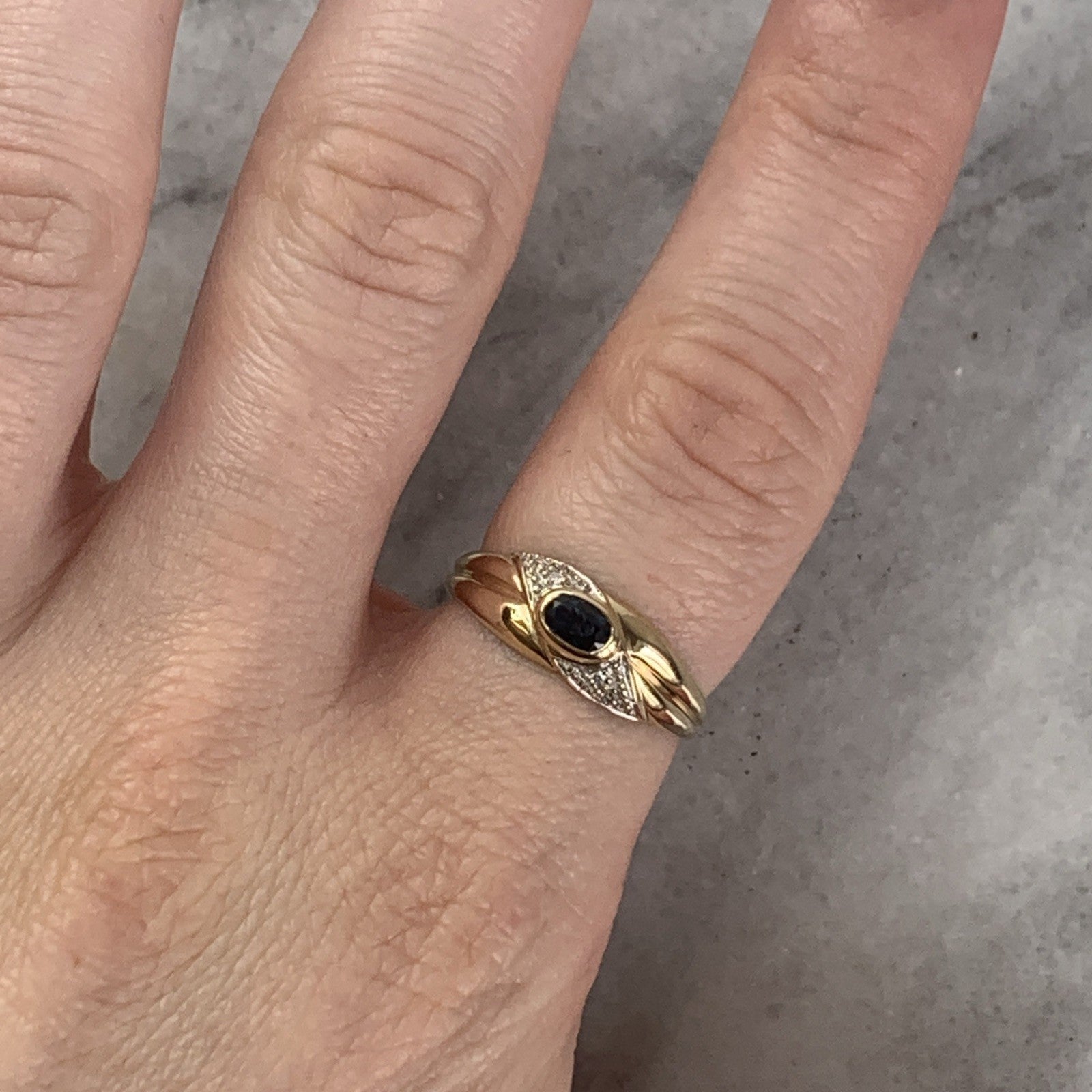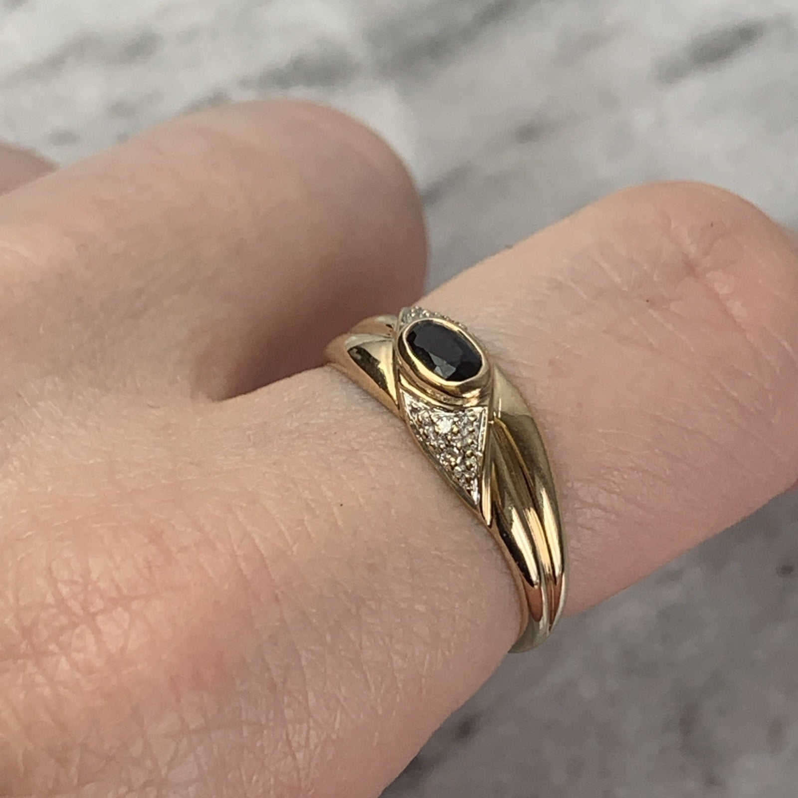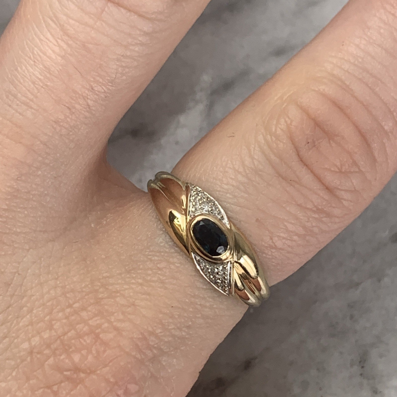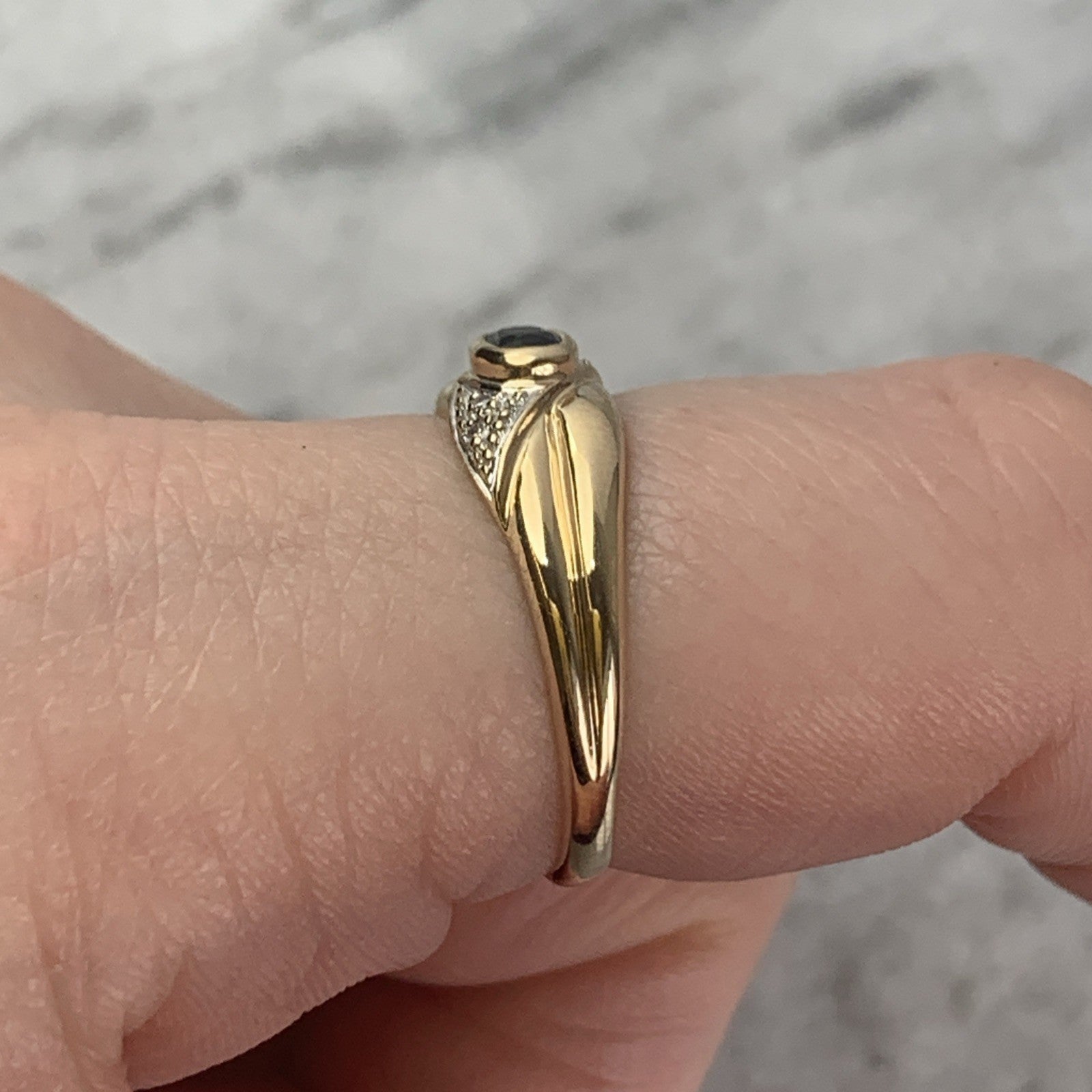 A lovely gold band ring featuring a bezel set sapphire, accented by a collection of pave set diamonds.