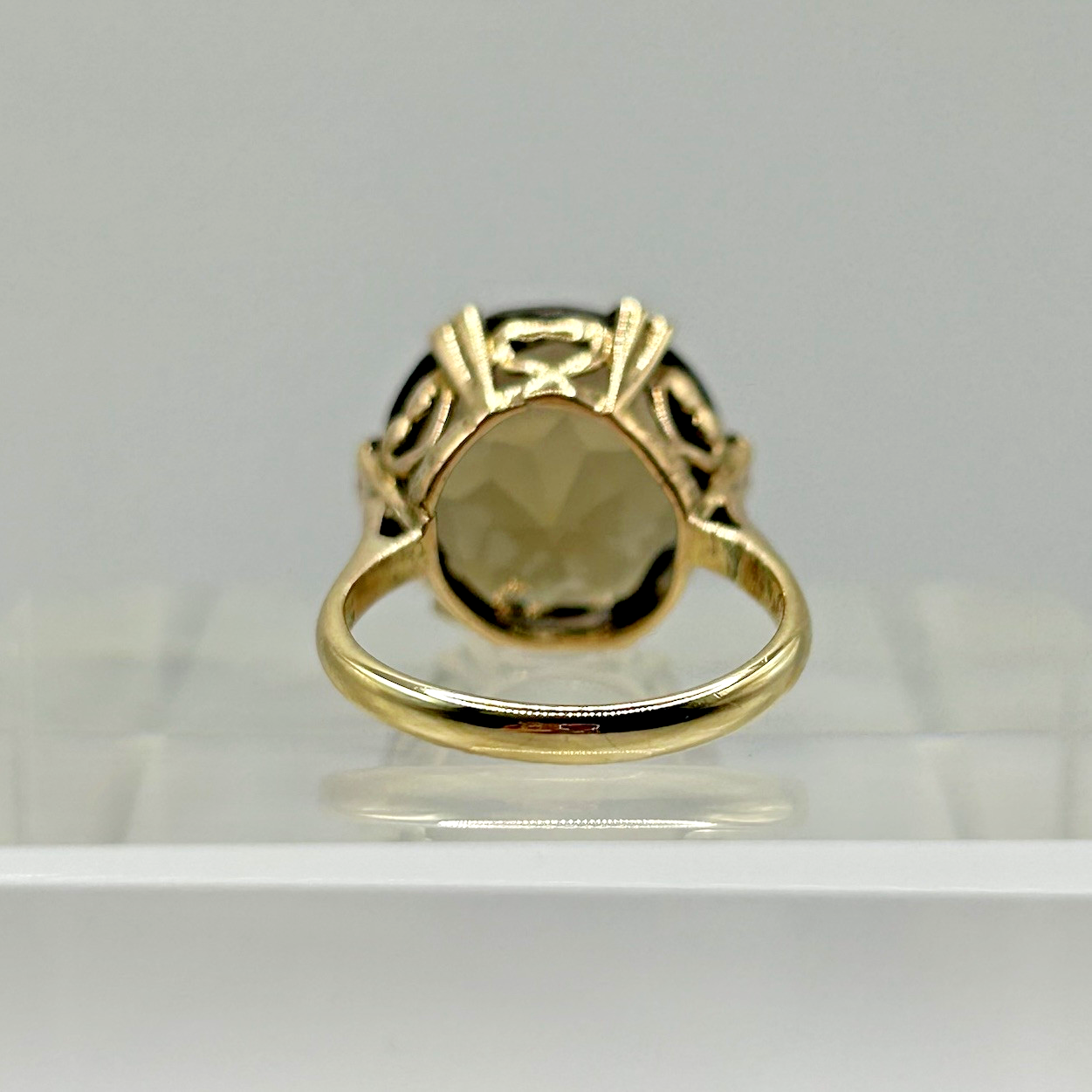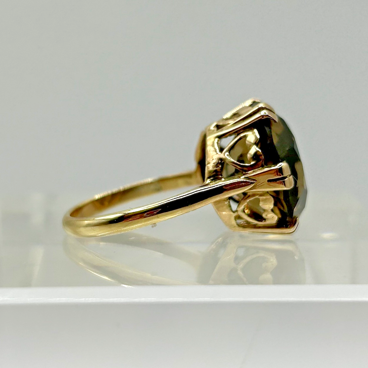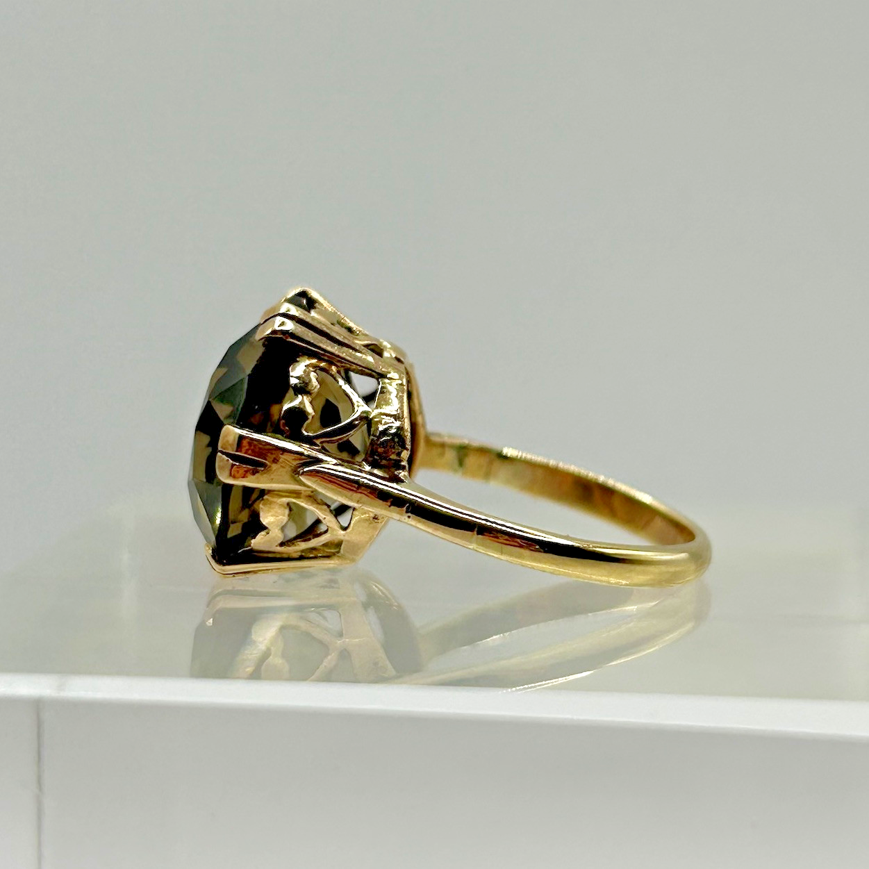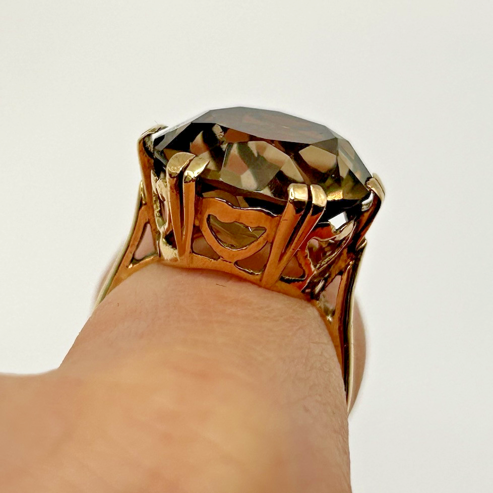 Smoky Quartz Ring 9ct Gold Ornate Solitaire Heart Cut Out Yellow Gold - Size M