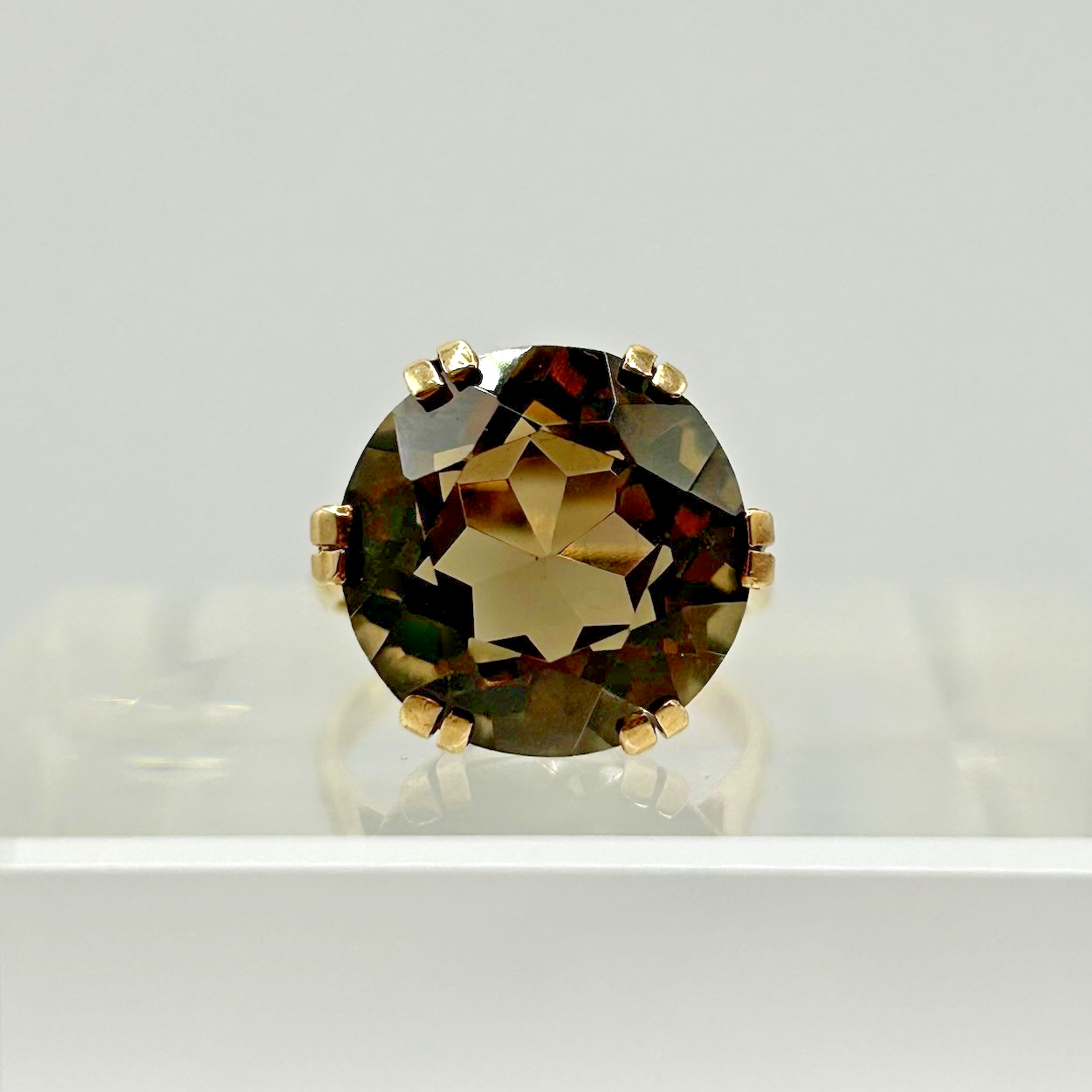 A beautifully ornate yellow gold ring showcasing a round cut solitaire smoky quartz, held in claws upon a bed of cut out heart motifs to accent.