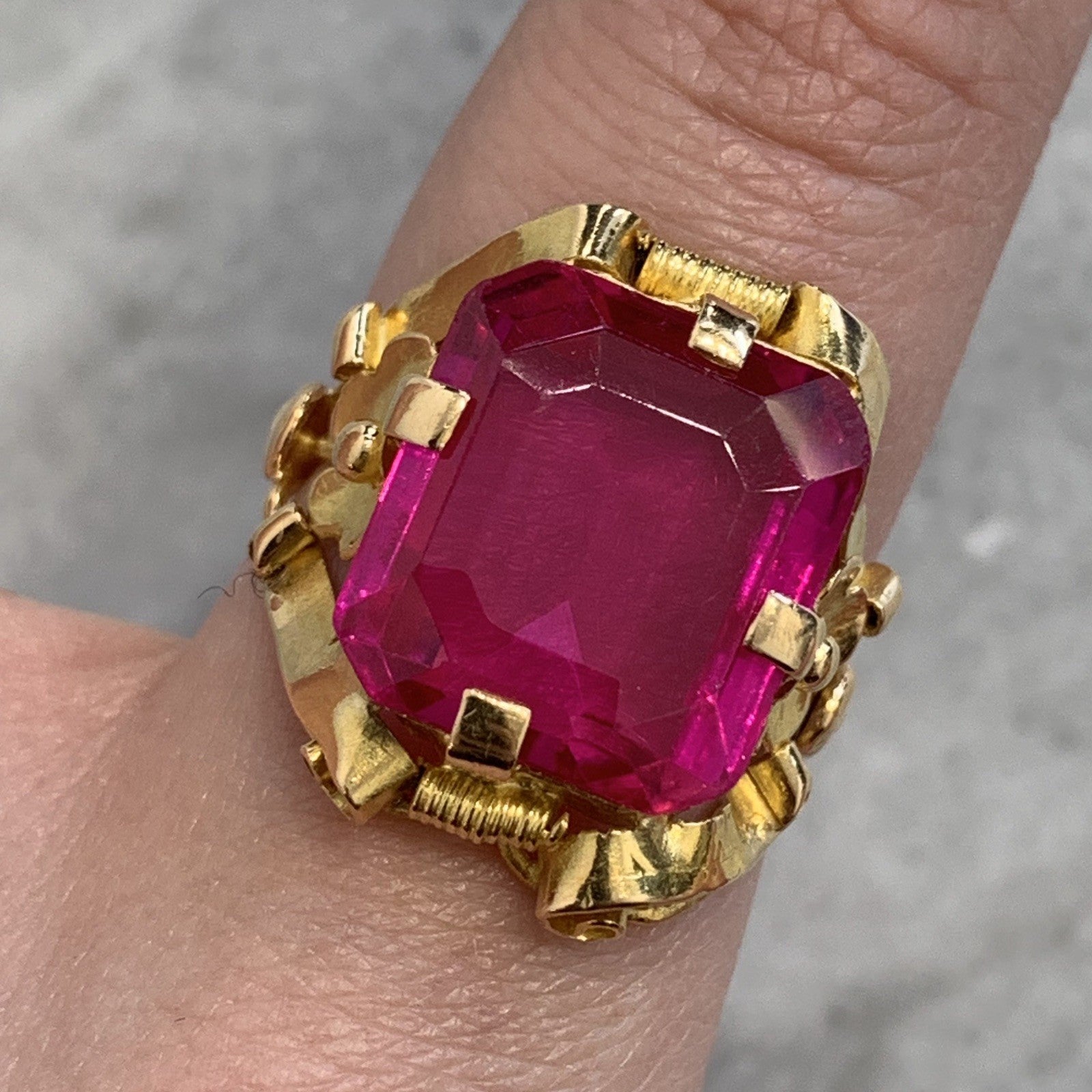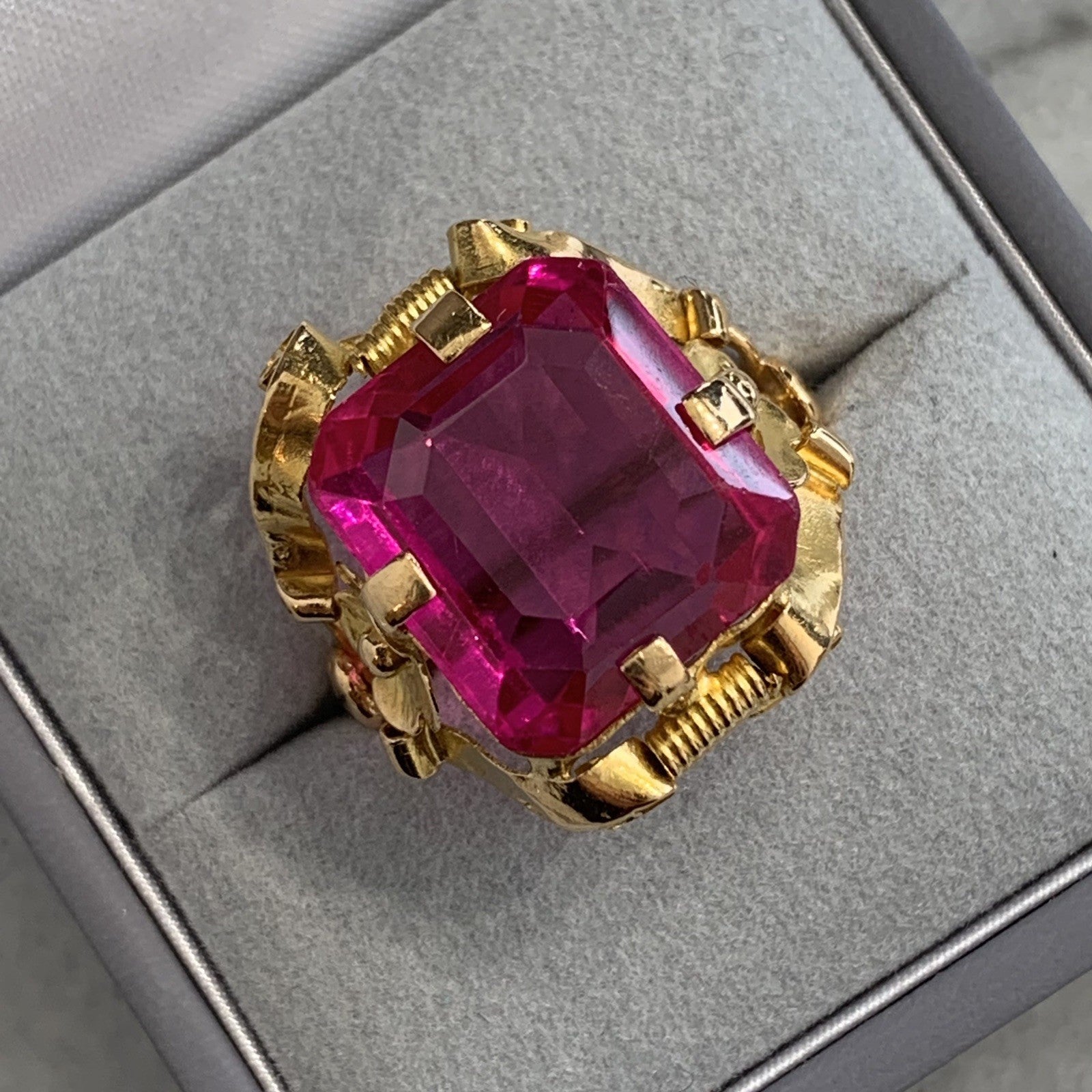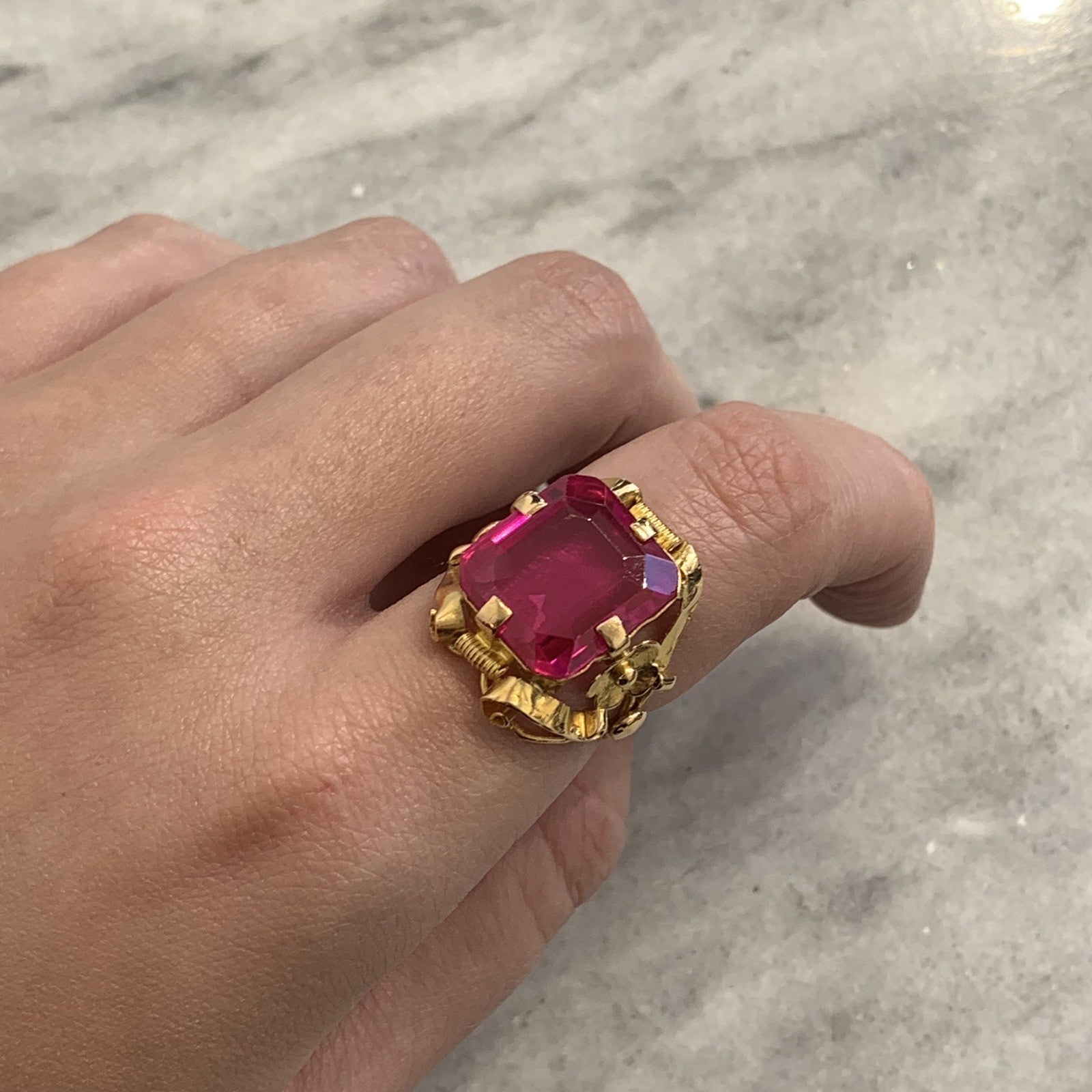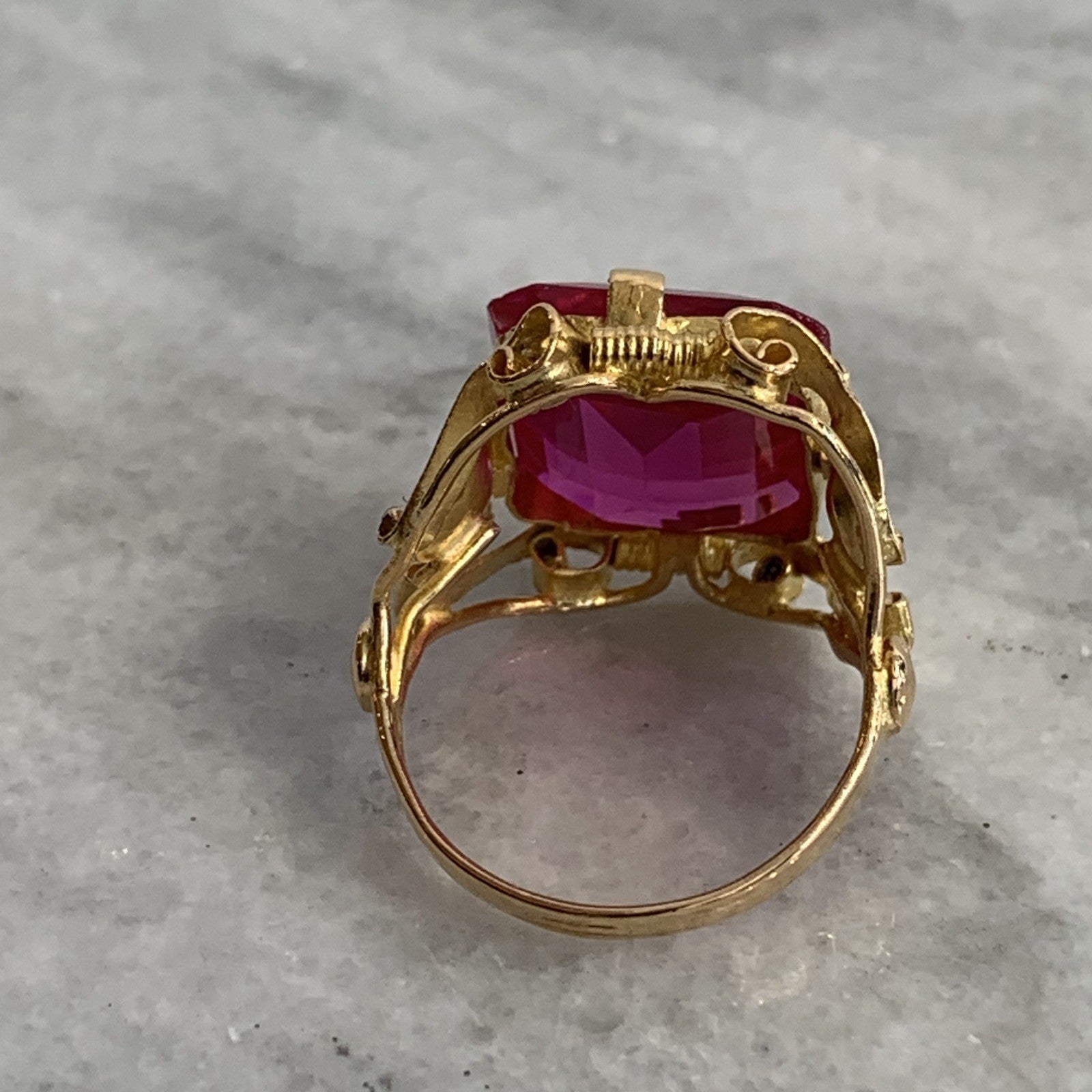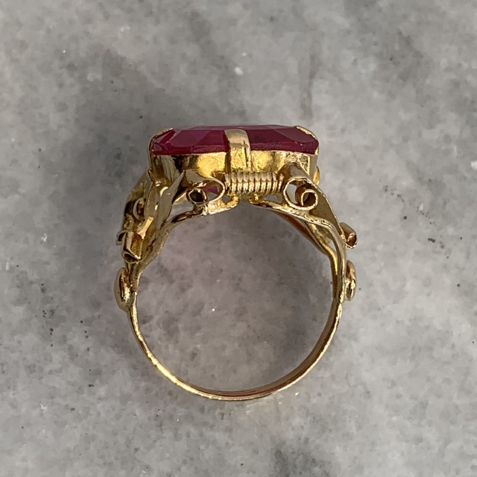 A beautiful gold cocktail ring showcasing an ornate emerald cut synthetic pink sapphire, held in claws and accented by intricate metal work and floral motifs. This is a bespoke handmade ring with lots of character and organic shapes.