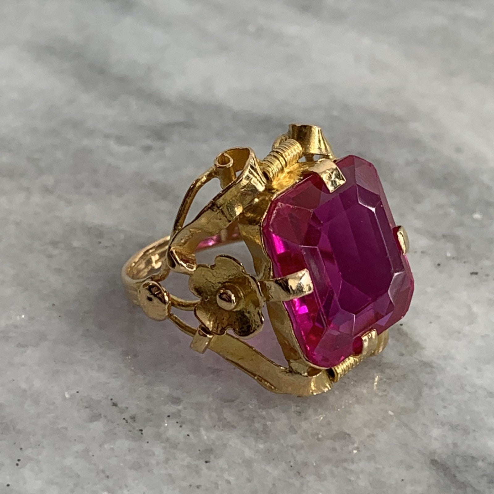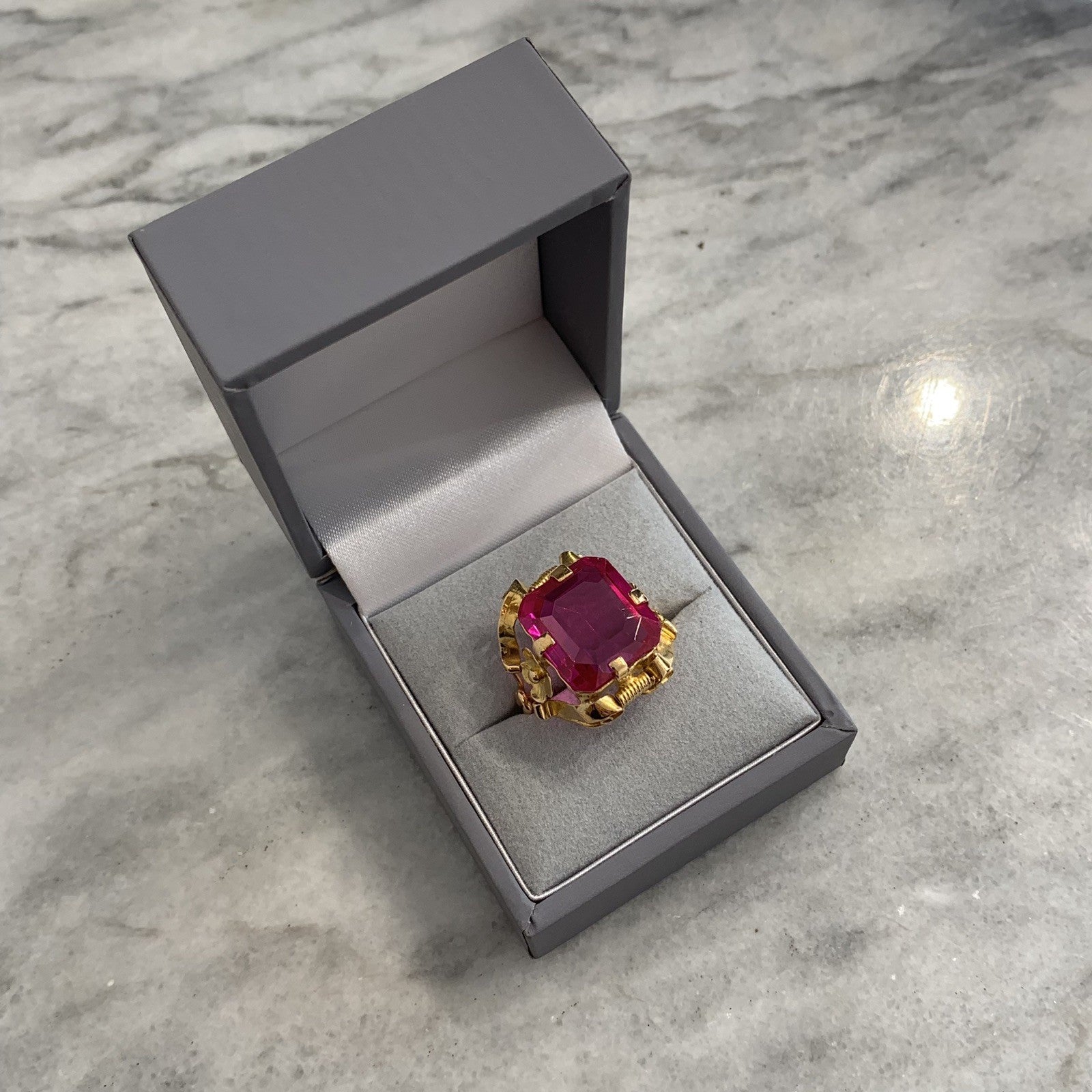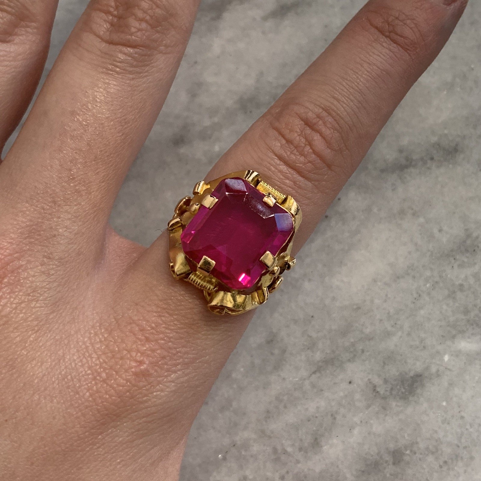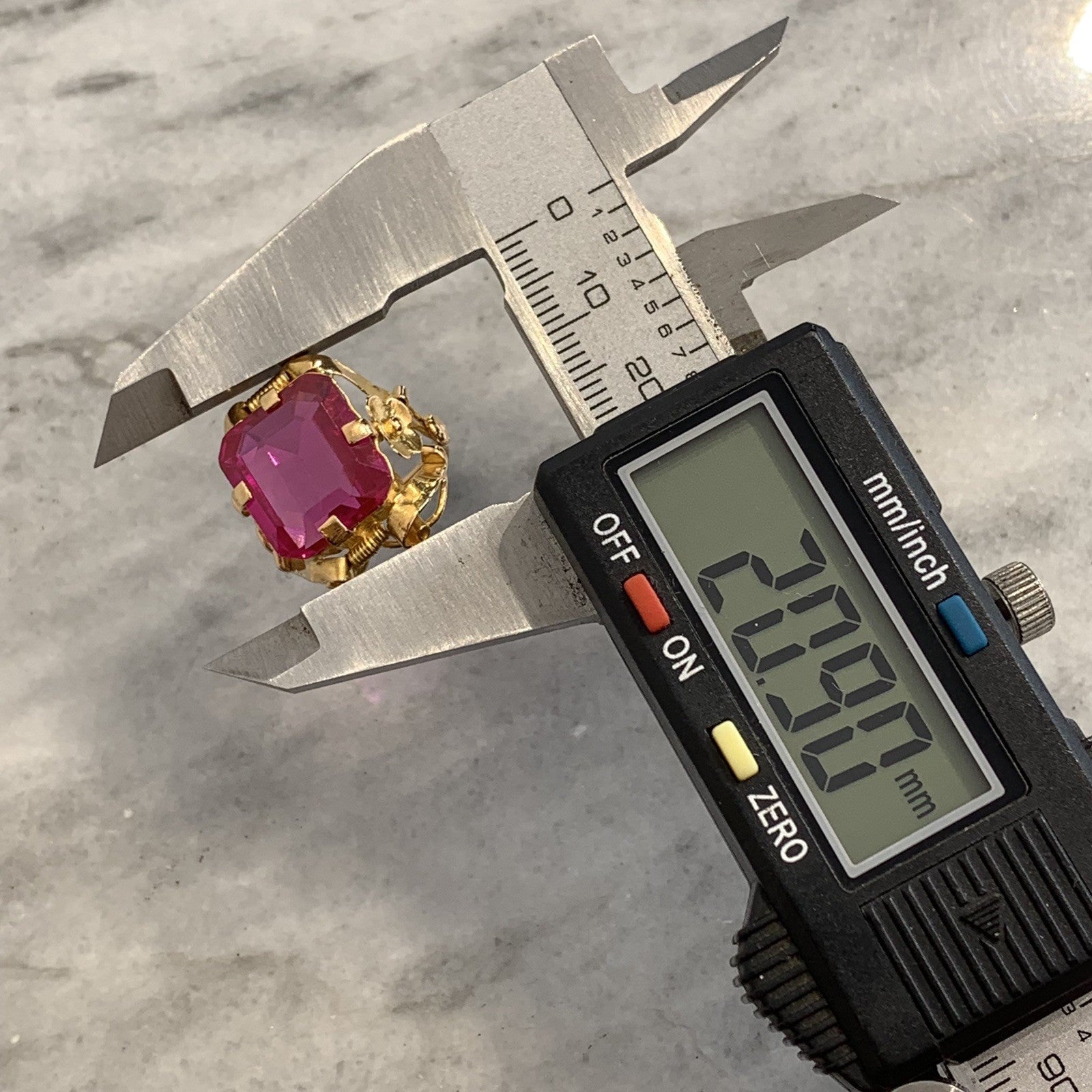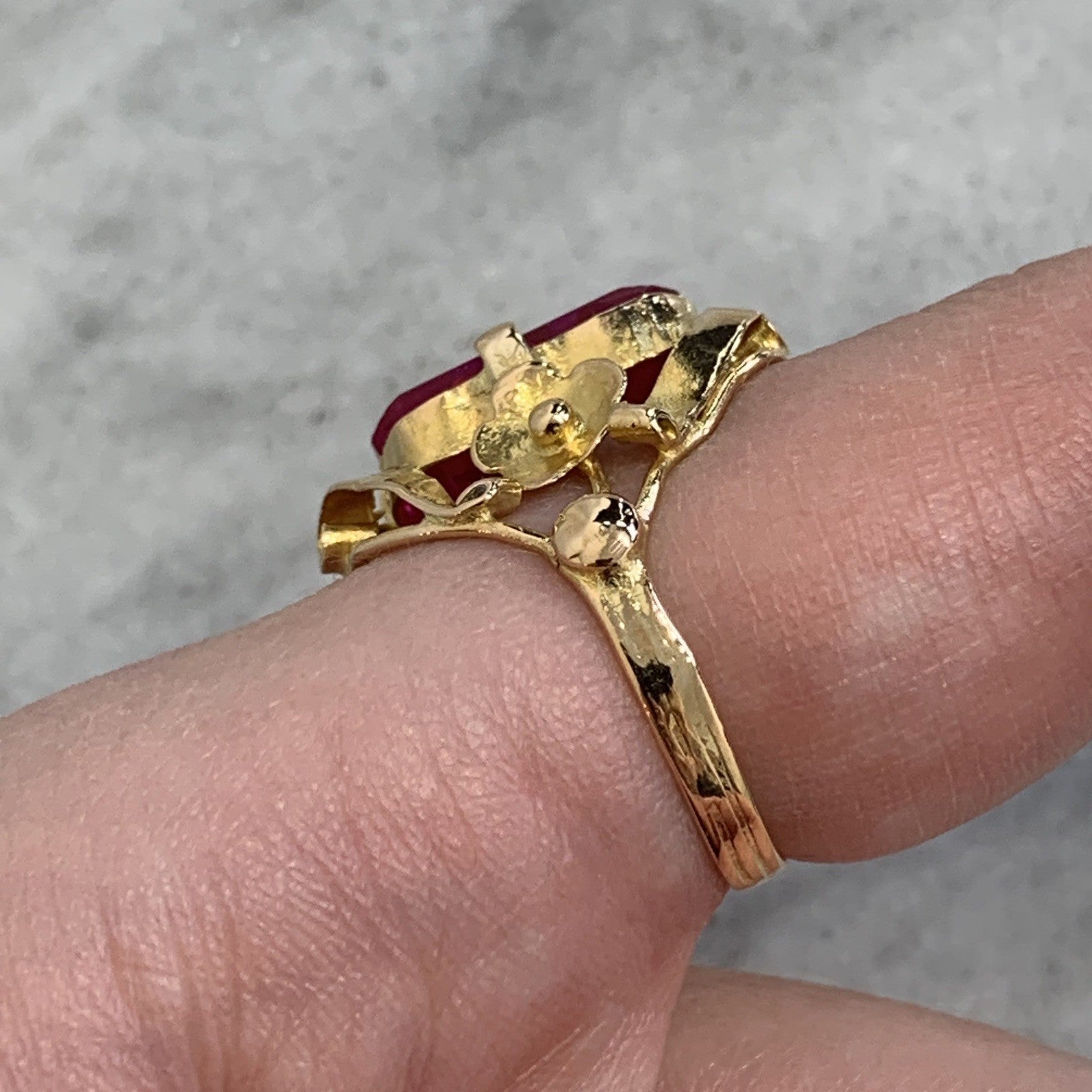 A beautiful gold cocktail ring showcasing an ornate emerald cut synthetic pink sapphire, held in claws and accented by intricate metal work and floral motifs. This is a bespoke handmade ring with lots of character and organic shapes.